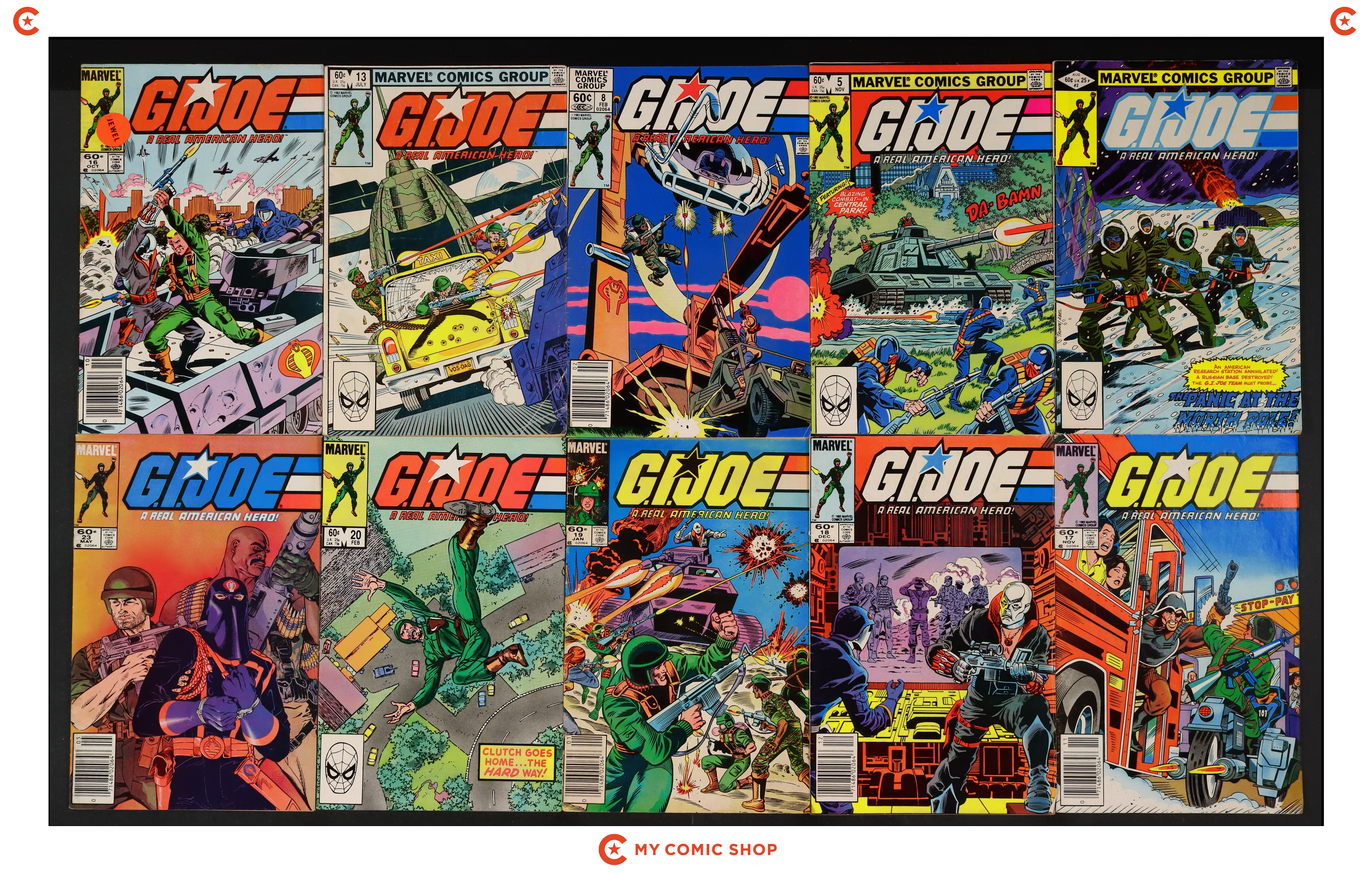 Issues 2D, 5D, 8, 13, 16N-18N, 19, 20, 23N of GI Joe A Real American Hero (1982 Marvel). Most will grade in the GD to VG+ range.