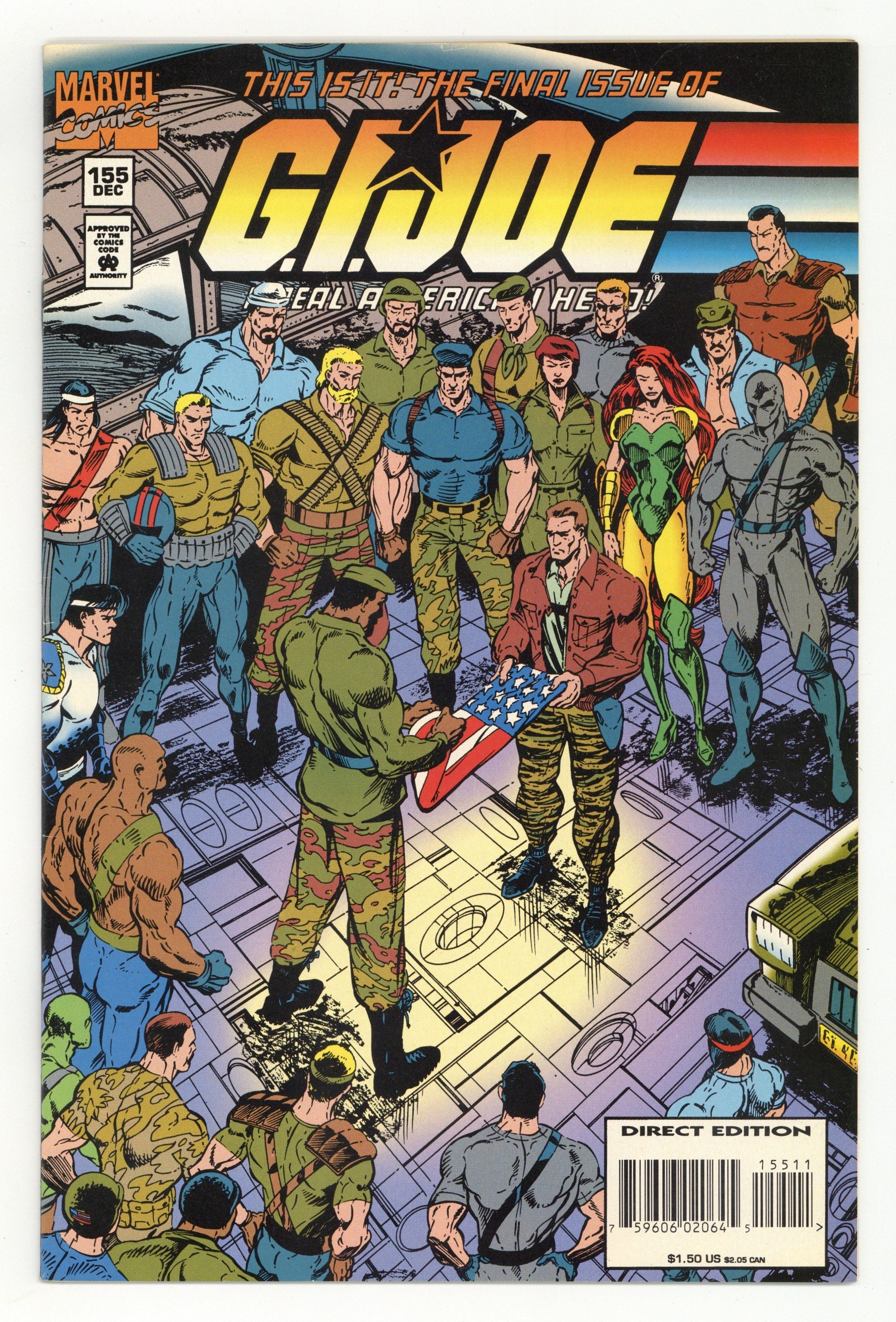 Starts Apr 4 Direct Edition. Hard to find last issue of this series. Story by Larry Hama. Art by Phil Gosier and Scott Koblish. Ever wondered how the entire G.I. Joe saga ended? G.I. Joe fans LOVE this cover featuring all our favorite Joes folding up the American flag one last time at the PIT Headquarters. The story features a letter from Snake Eyes, (the first time we ever get to hear the silent soldier's thoughts!), detailing his surprising feelings on war and the military. Not only is this a highly collectible final issue, its' a great read too. Cover price $1.50.