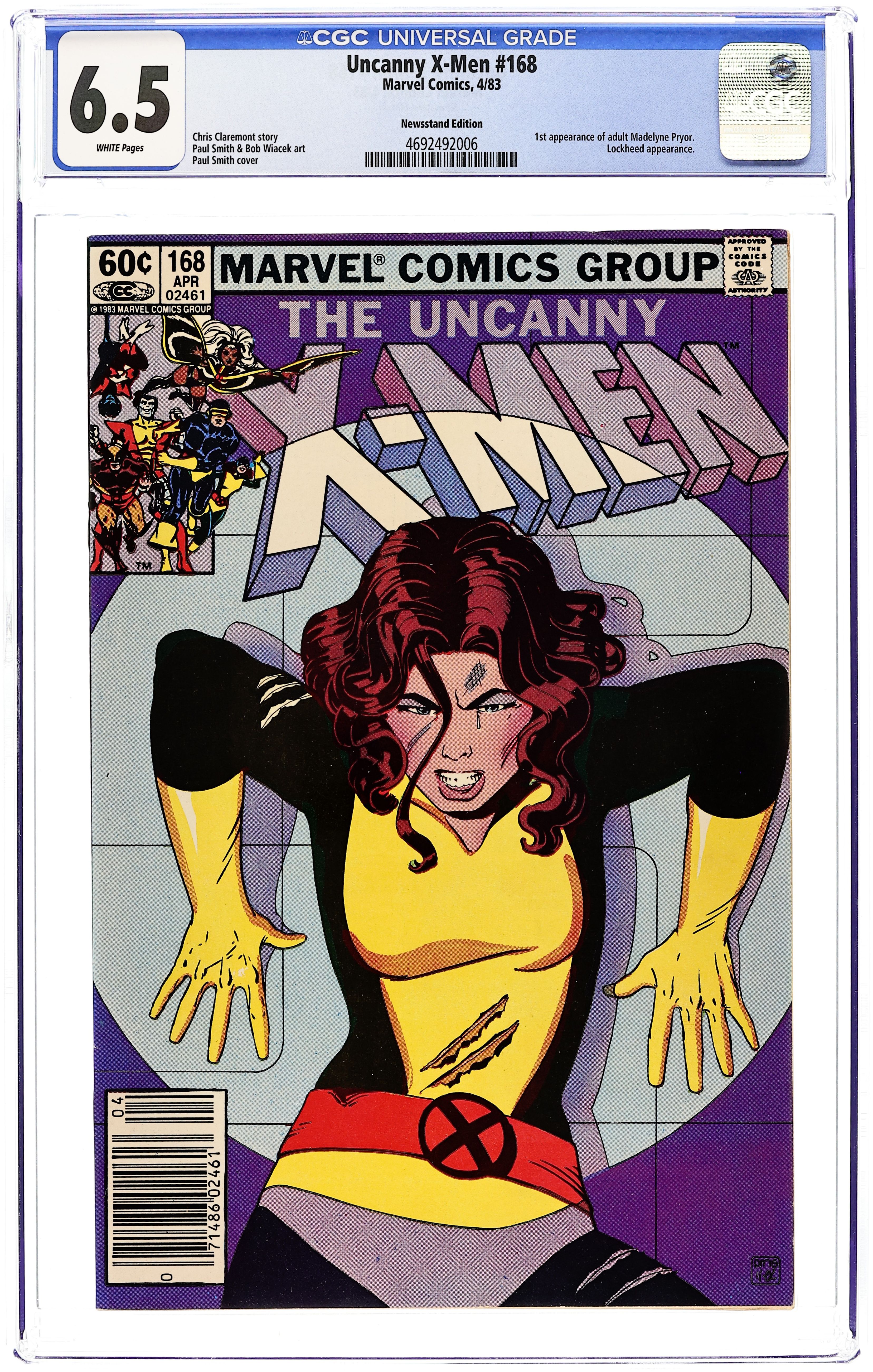 Starts Apr 20 Newsstand Edition. "Professor Xavier is a Jerk!" Story by Chris Claremont. Art by Paul Smith and Bob Wiacek. Professor X has ordered Kitty to leave the ranks of the X-Men, a position she feels she's earned, and join the ranks of the neophyte heroes in training the New Mutants. Needless to say, Kitty is not happy about her mentor's decision. Wolverine begins a leave of absence from the team. Meanwhile, Xavier attempts to adjust to his new body... a body that enables him to walk! Plus, the deadly Sidrian Hunters return (last seen in Uncanny X-Men #154). And in Alaska, Scott runs into a very familiar face. Wolverine's story continues in Wolverine (1982 Limited Series) #1. NOTE: 1st appearance of Madelyne Pryor. 36 pgs. Cover price $0.60.