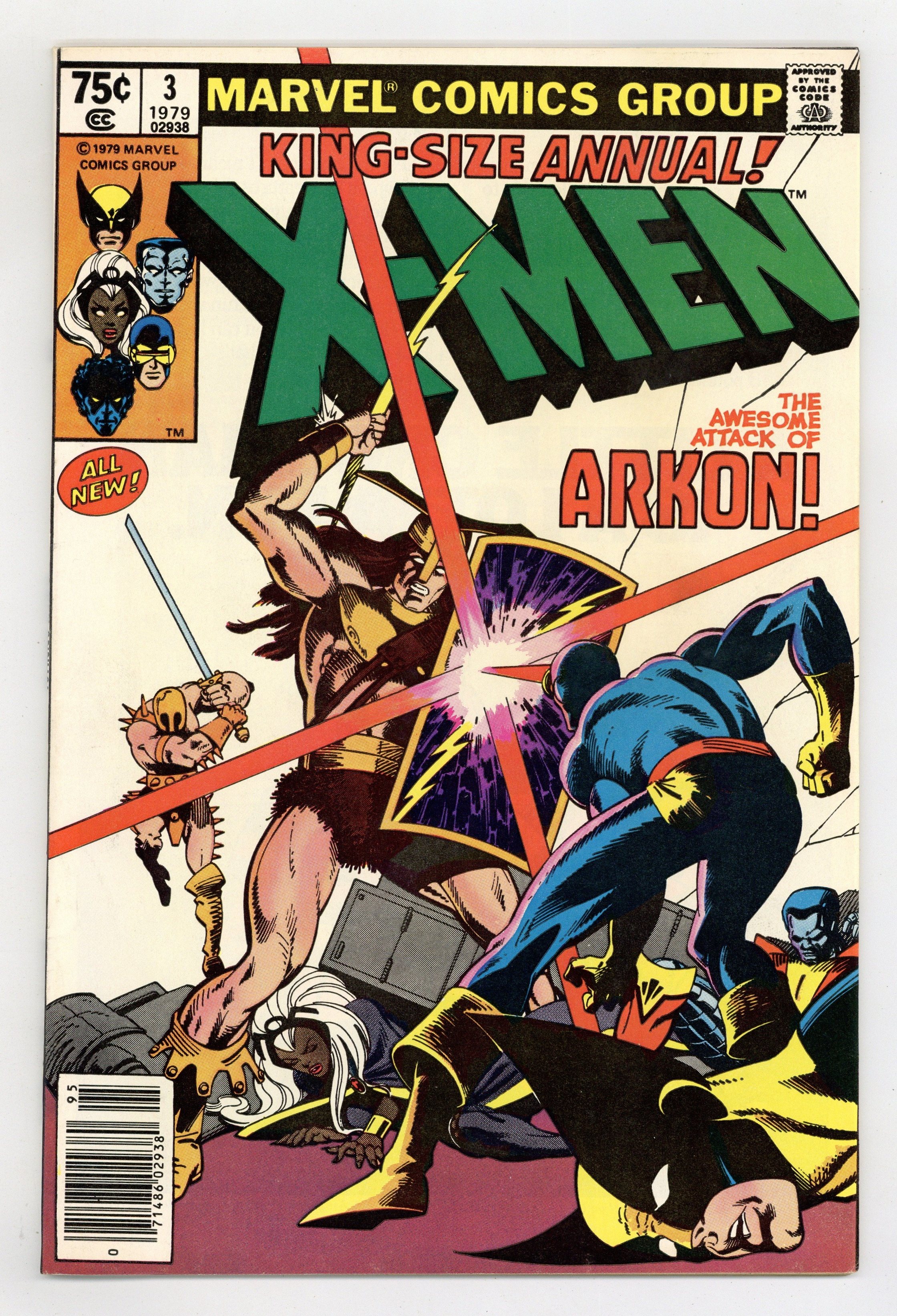 Starts Mar 23 Newsstand Edition. A Fire in the Sky! - Written by Chris Claremont. Art by George Pérez and Terry Austin. Cover by Frank Miller and Terry Austin. The X-Men battle Arkon and are transported to his world where they are asked to help save it. Story takes place between Uncanny X-Men (1963 1st Series) #124 and 125. Characters in this issue: X-Men [Cyclops; Storm; Wolverine; Colossus; Nightcrawler; Banshee]; Edwin Jarvis; VILLAINS: Arkon; Imperions; CAMEO FLASHBACK: Captain America [Steve Rogers]; Thor; Iron Man [Tony Stark]. 52 pages, full color. Cover price $0.75.