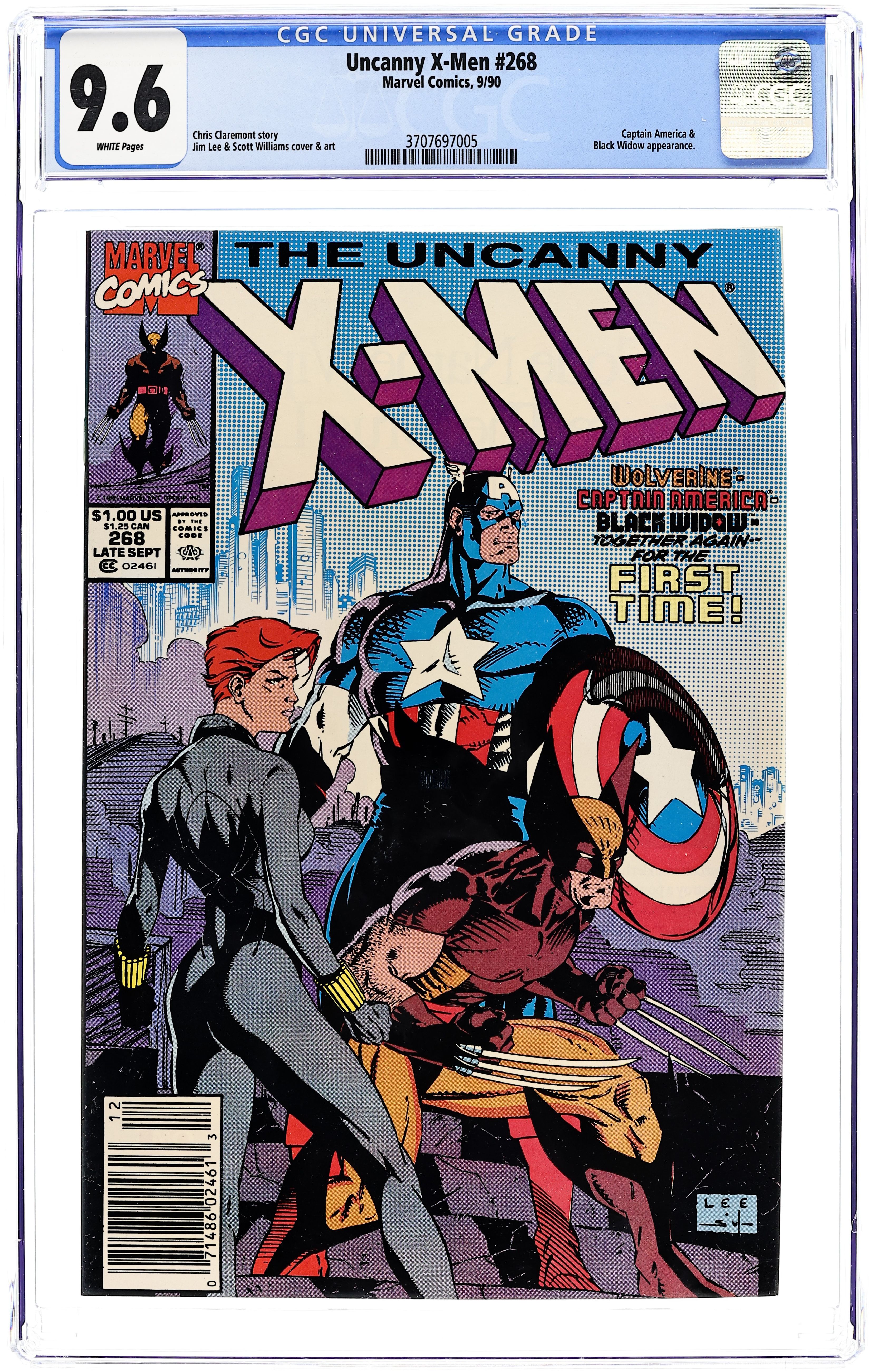 Starts Apr 20 1st Printing. Newsstand Edition. "Madripoor Knights!" Guest-starring Captain America and Black Widow. Story by Chris Claremont. Art by Jim Lee and Scott Williams. Cover by Jim Lee. In this classic flashback tale, during the second World War, a mysterious man by the name of Logan and a rookie Sentinel of Liberty must team up against the deadly Hand to save the life of a young girl. Meanwhile in the present, Wolverine, Jubilee, Psylocke, and Black Widow finish a caper that began nearly fifty years earlier. NOTE: JC Penney reprint exists with 30th Anniversary Spider-Man in UPC Box. 36 pgs. Cover price $1.00.