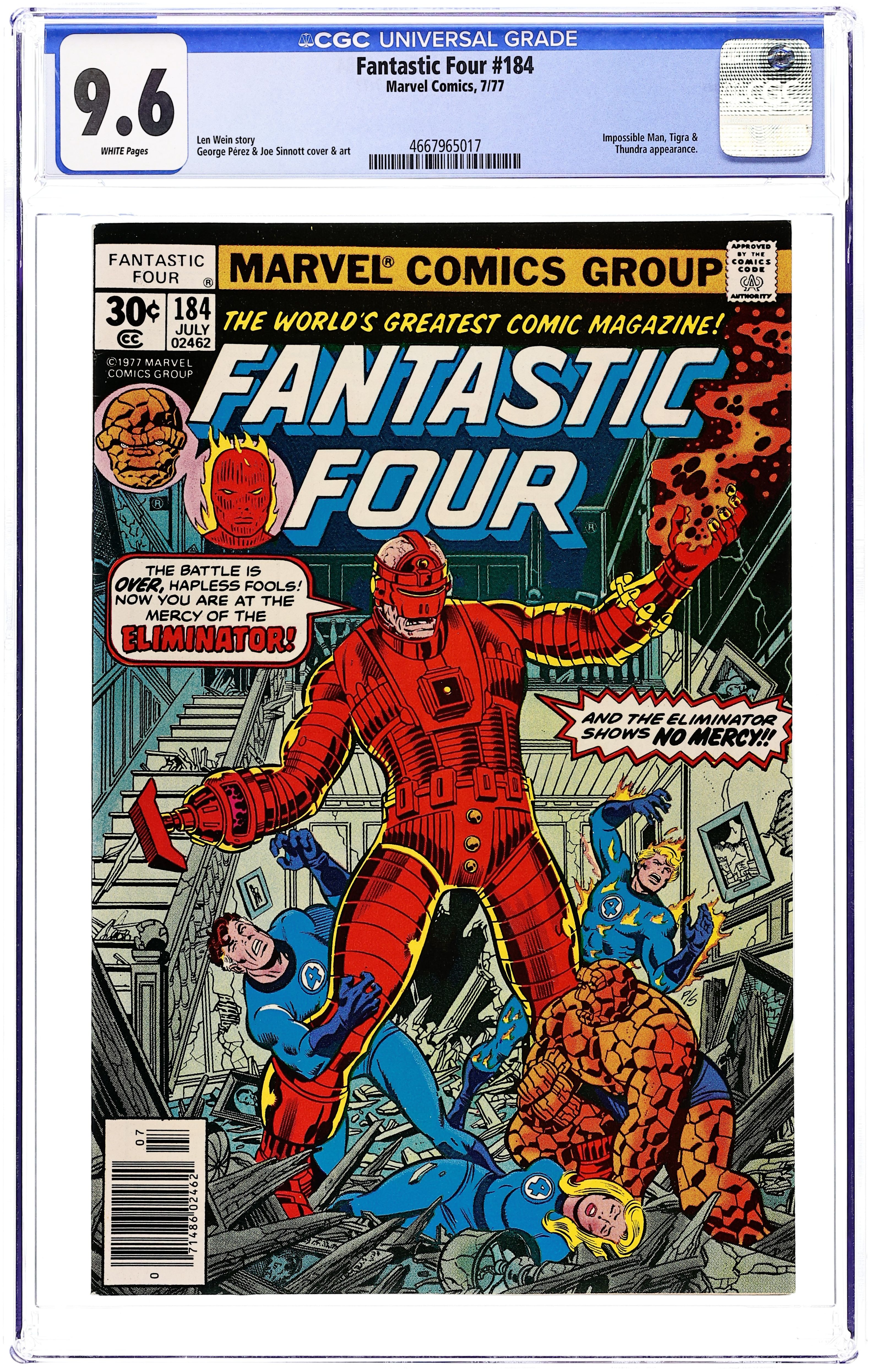 Starts Jan 19 "Aftermath: The Eliminator!" Written by Len Wein. Pencils by George Perez. Inks by Joe Sinnott. Cover by George Perez and Joe Sinnott. The Impossible Man, Thundra, Tigra, and the Fantastic Four battle the Eliminator. The battle against the Brute is finally over, but since Agatha Harkness and Franklin are still missing, the FF have little time for rest. So Reed (without his stretching powers), Sue, and Ben head to Whisper Hill. First, they find a semi-conscious Human Torch and then...the Eliminator! Cameo appearances by the Impossible Man, Thundra, and Tigra. Note: A 35-cent cover price variant exists for this issue. 36 pgs. Cover price $0.30.