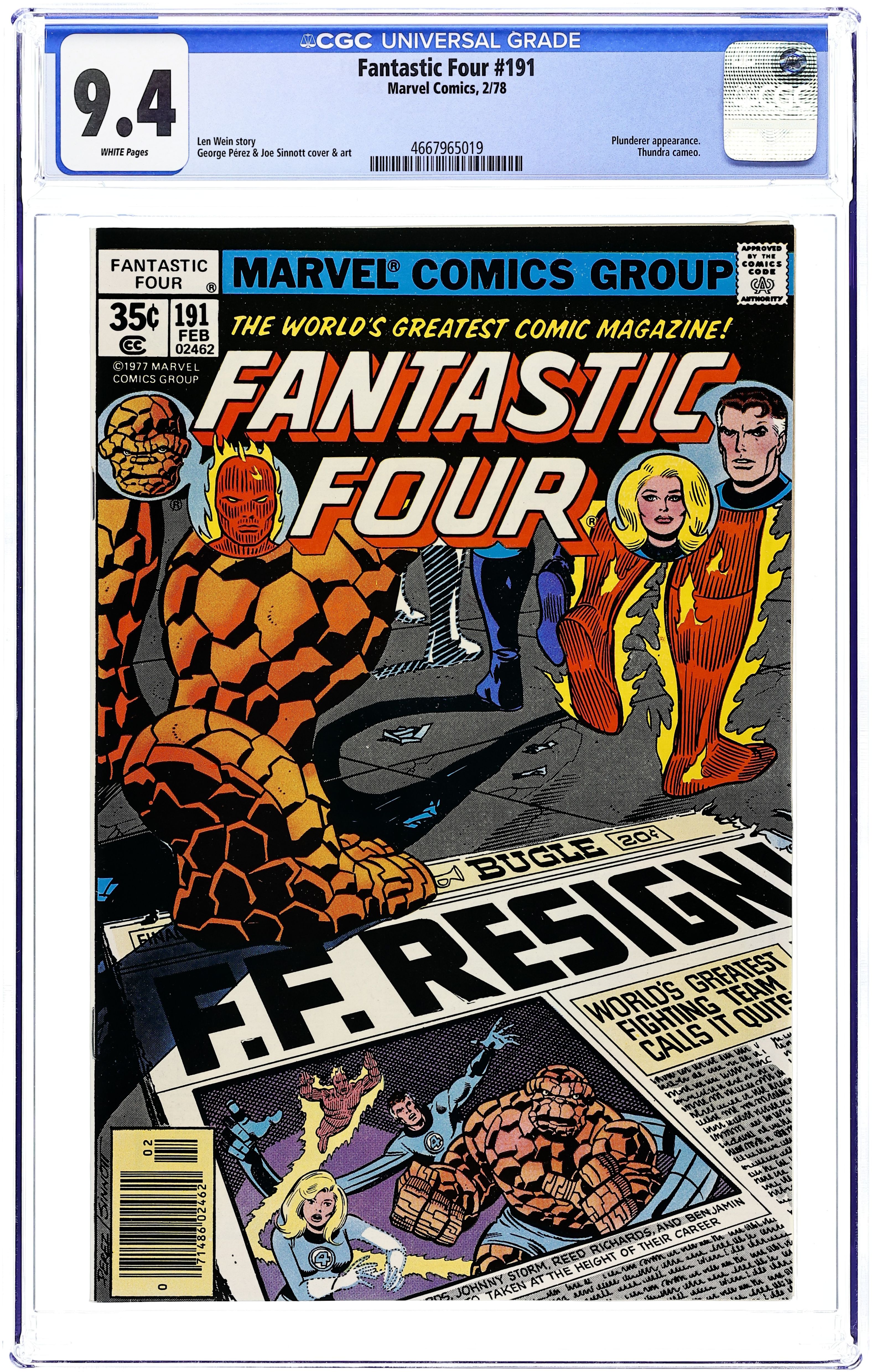 Starts Jan 19 "Four No More!" Written by Len Wein. Pencils by George Perez. Inks by Joe Sinnott. Cover by George Perez and Joe Sinnott. Reed, Sue, Ben, and Johnny say their goodbyes to one another and depart the Baxter Building, but the former leader of the FF decides to stay behind and watch the (phony) SHIELD agents box up his scientific equipment. When Reed gets suspicious of their activity, the Plunderer makes his move! Upon seeing the emergency flare, the Thing, Human Torch, and Invisible Girl rush back to the Baxter Building! Are the Fantastic Four staying together after all? Cameo appearances by Agatha Harkness, Willie Lumpkin, Frankie Raye, and Thundra. 36 pgs. Cover price $0.35.