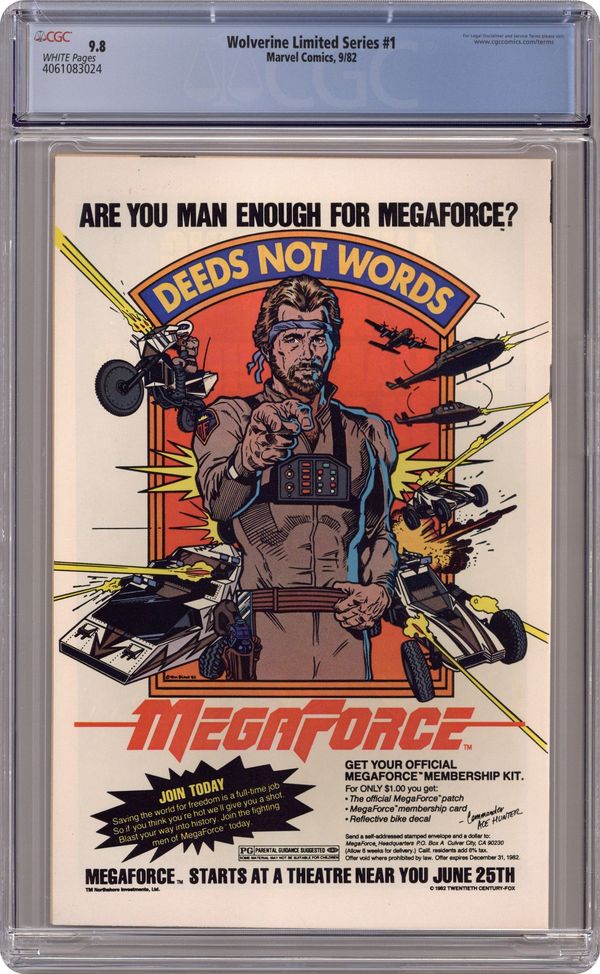 Starts Apr 4 Direct Edition. 1 of 4 Featuring Wolverine in his first solo series fighting in Japan. "Wolverine." Script by Chris Claremont, pencils by Frank Miller, inks by Joe Rubinstein. Miller/Rubinstein cover. Back cover MegaForce ad with art by William Stout. Cover price $0.60.