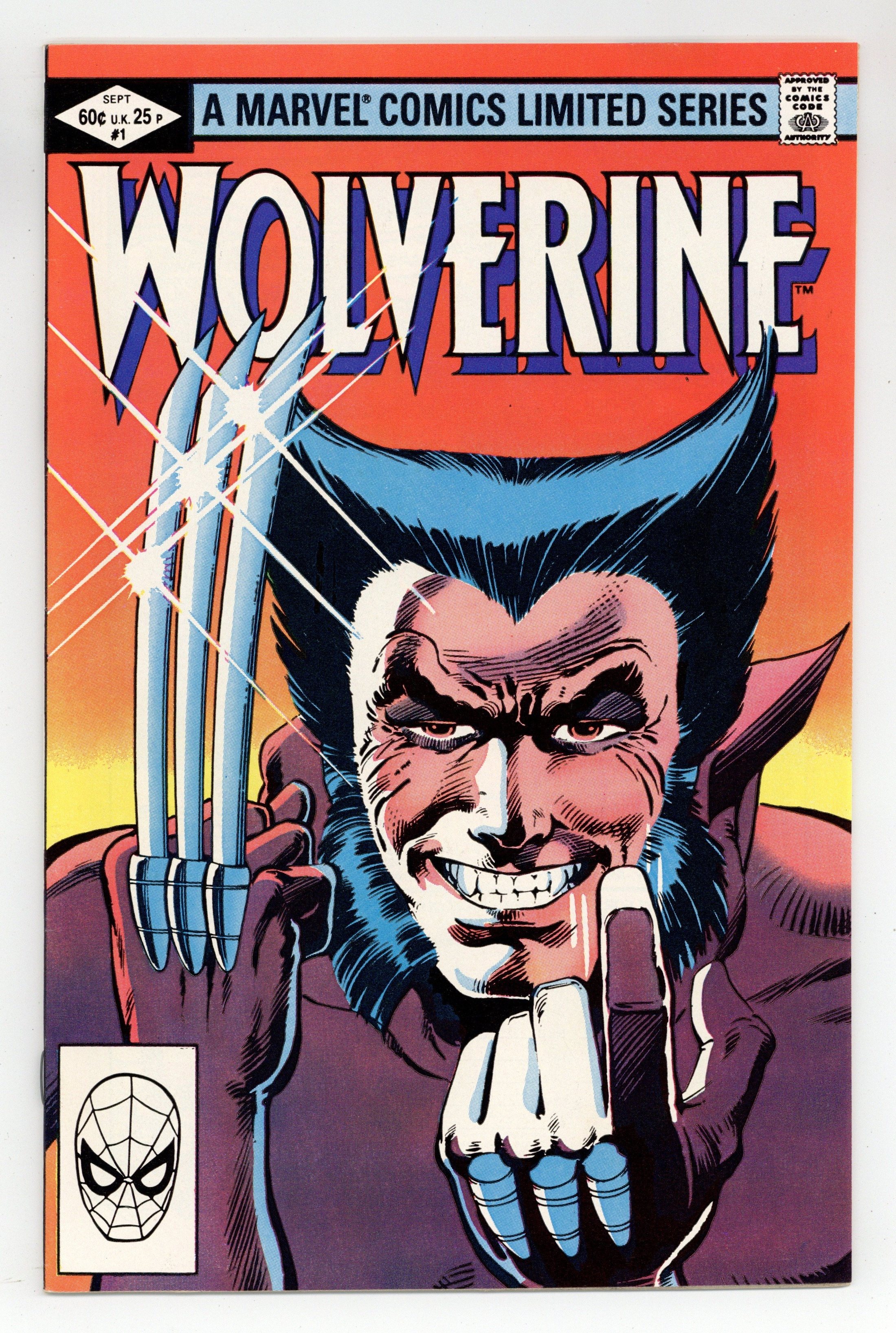 Starts Jul 4 Direct Edition. 1 of 4 Featuring Wolverine in his first solo series fighting in Japan. "Wolverine." Script by Chris Claremont, pencils by Frank Miller, inks by Joe Rubinstein. Miller/Rubinstein cover. Back cover MegaForce ad with art by William Stout. Cover price $0.60.