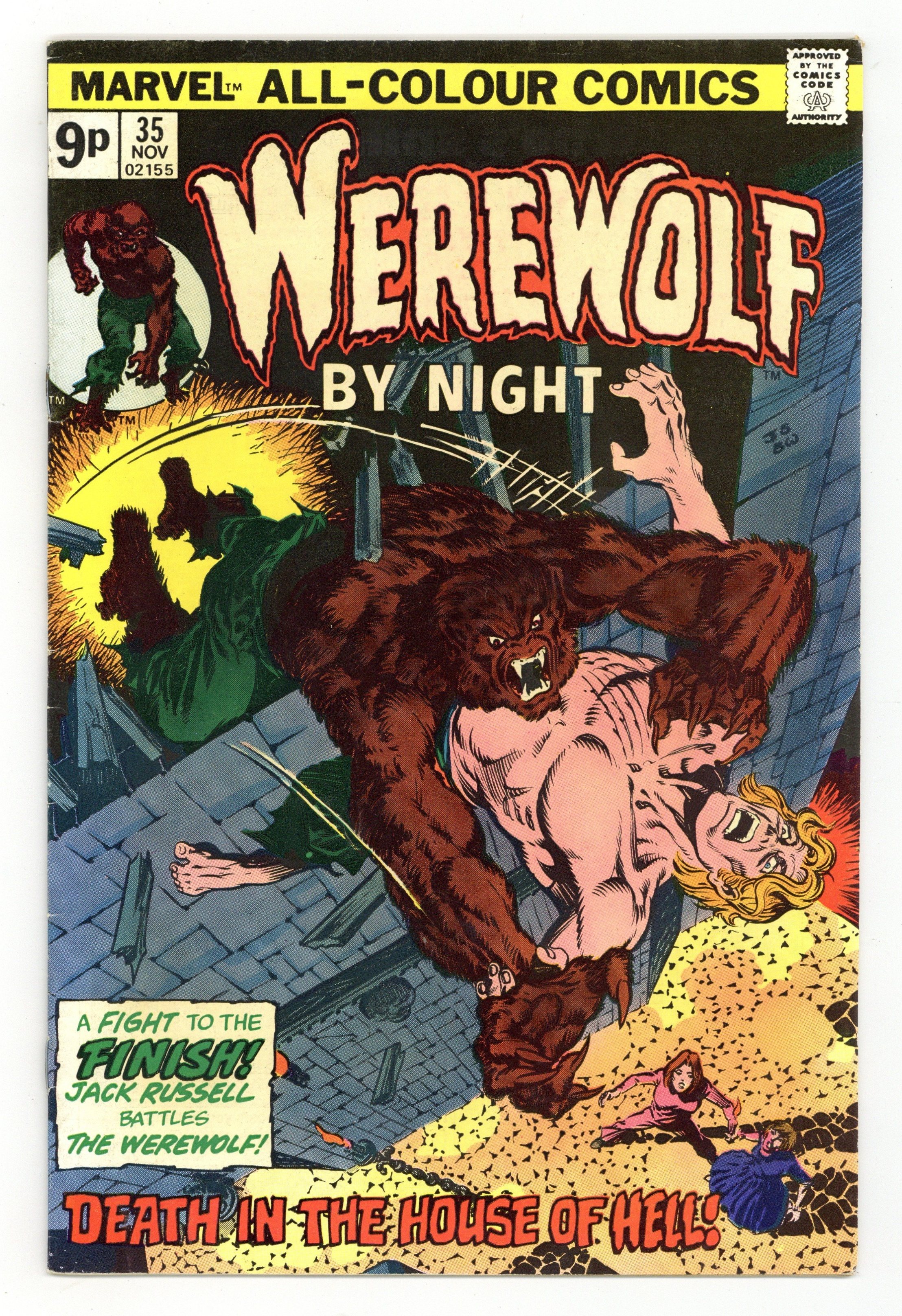 Starts Apr 20 UK edition. Identical to US edition, but has 9p cover price. "Evil in Every Stone No Longer Hiding!" Written by Doug Moench. Art by Don Perlin. Cover by Jim Starlin and Berni Wrightson. Face-to-face for the first terrifying time - Jack Russell vs. the werewolf! Plus, the hideous secret of Belaric Marcosa! 32 pages, FC.