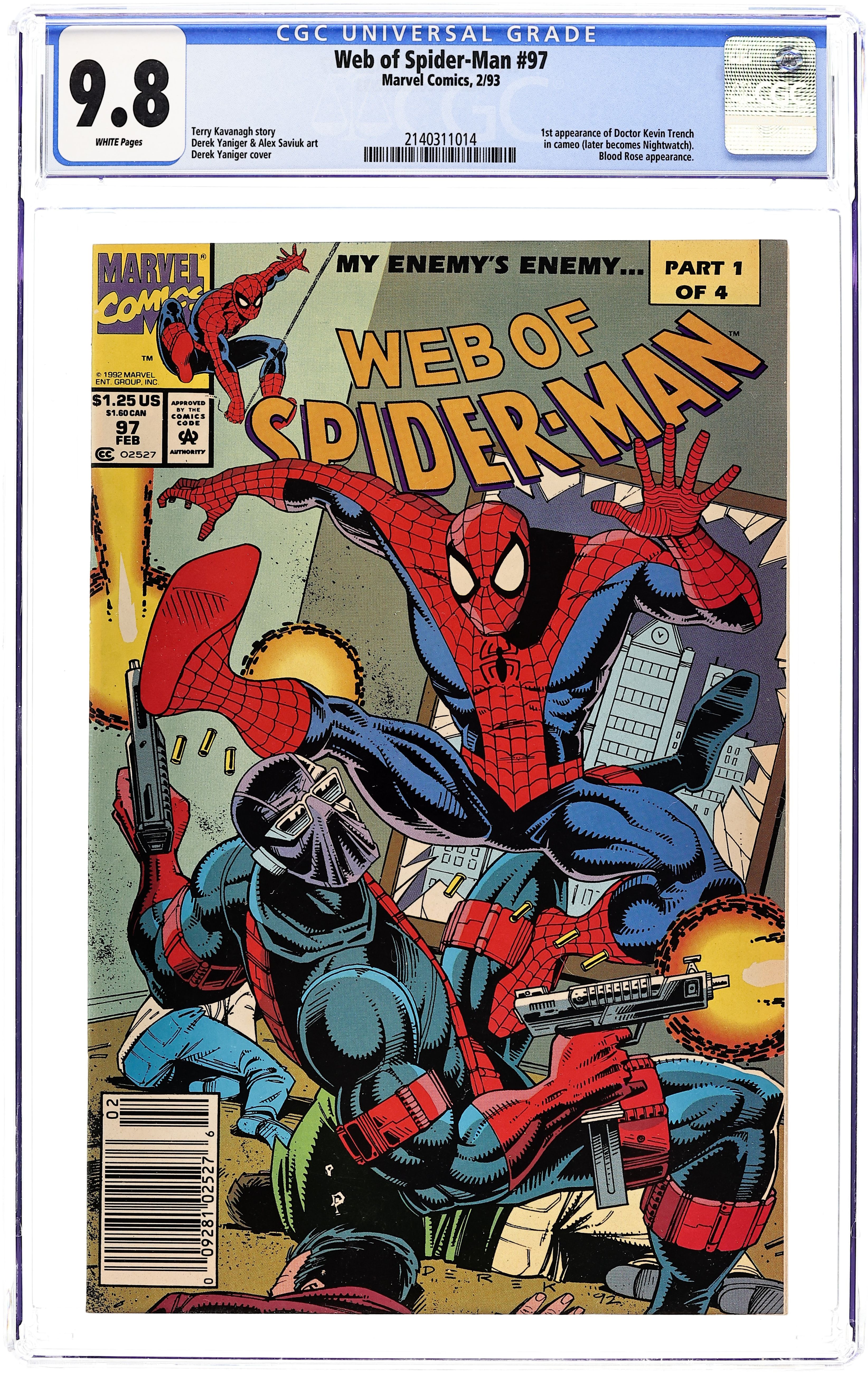 Starts Apr 4 Newsstand Edition. "Opening Volley" Part 1 of 4. Script by Terry Kavanagh. Pencils by Alex Saviuk and Derek Yaniger. Inks by Joe Rubinstein and Derek Yaniger. Cover by Derek Yaniger. The Blood Rose is back! And he's doing what he does best…terrorizing the Kingpin's crime syndicate! In a bold move, the Blood Rose attacks the Fisk Tower and sets it on fire! The Amazing Spider-Man and Joe Robertson rush to the scene and find complete carnage inside! And of course find the Blood Rose inside too…still firing away at anything that moves! Meanwhile on a Caribbean Island, a beleaguered man closely resembling Richard Fisk washes ashore. First appearance of Nightwatch (aka Dr. Kevin Trench). Cameo appearances by the Foreigner, Alfredo Morelli, and Peter Parker's (robot) parents. (Notes: This issue begins the four-part My Enemy's Enemy storyline. The Blood Rose previously appeared in Web of Spider-Man 89. This issue includes a full-page cover preview for Web of Spider-Man 98.) 32 pages Cover price $1.25.