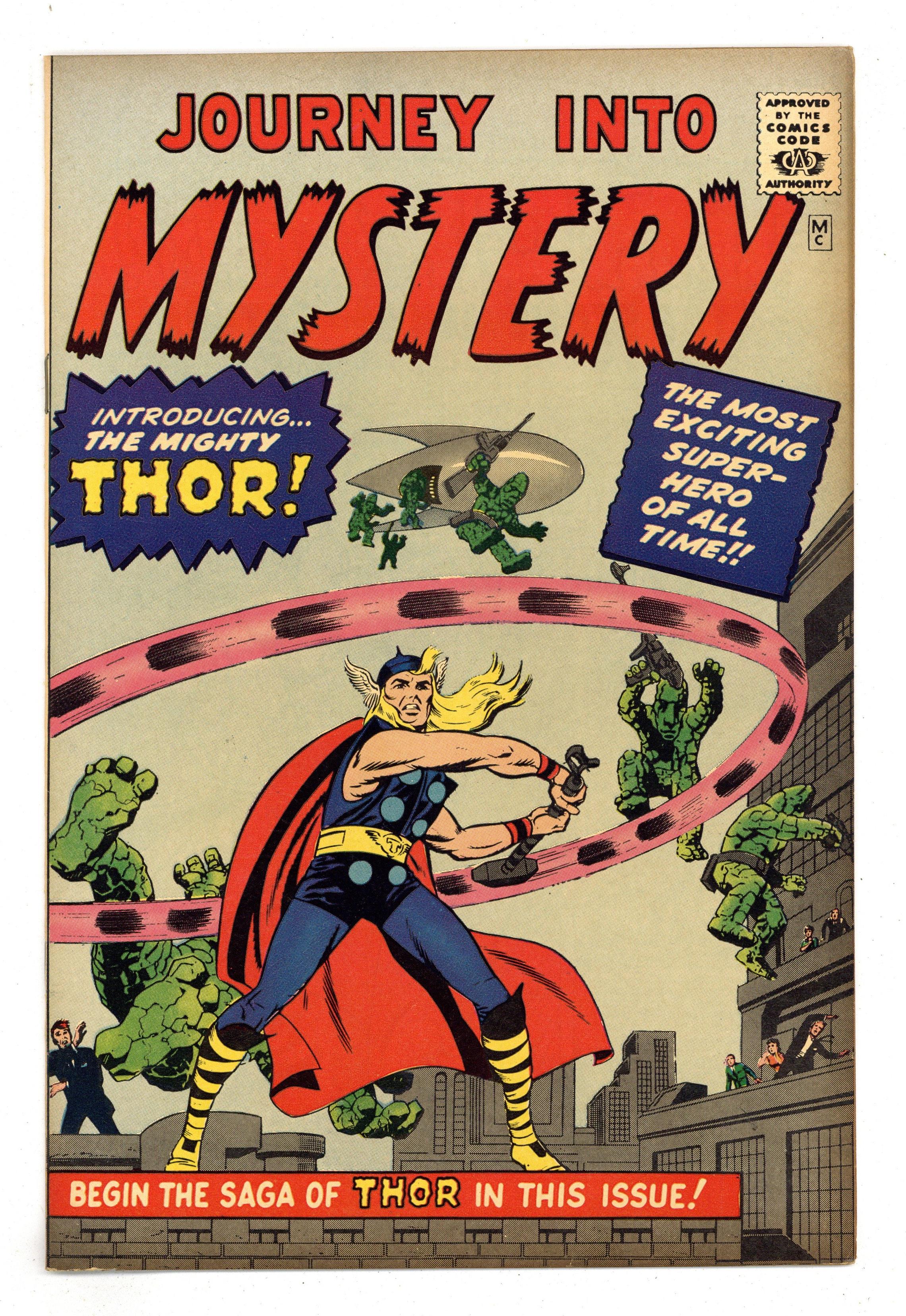 Starts Jan 3 72 page giant. First appearance of Hercules in "When Titans Clash!" Cover by Jack Kirby. Script by Stan Lee, pencils by Jack Kirby, inks by Vince Colletta. Loki appearance. This issue also includes a diagram of Asgard and Thor reprints: "Trapped by Loki, the God of Mischief" (from Journey Into Mystery 85); "The Mysterious Radio-Active Man" (JIM 93); "The Demon Duplicators" (JIM 95); and "The Mighty Thor Battles the Lava Man" (JIM 97). Kirby cover. 76 pages, full color. Cover price $0.25.