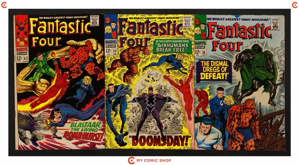 Issues 58, 59, 63 of Fantastic Four (1961 1st Series). Most will grade in the VG+ to FN/VF range.