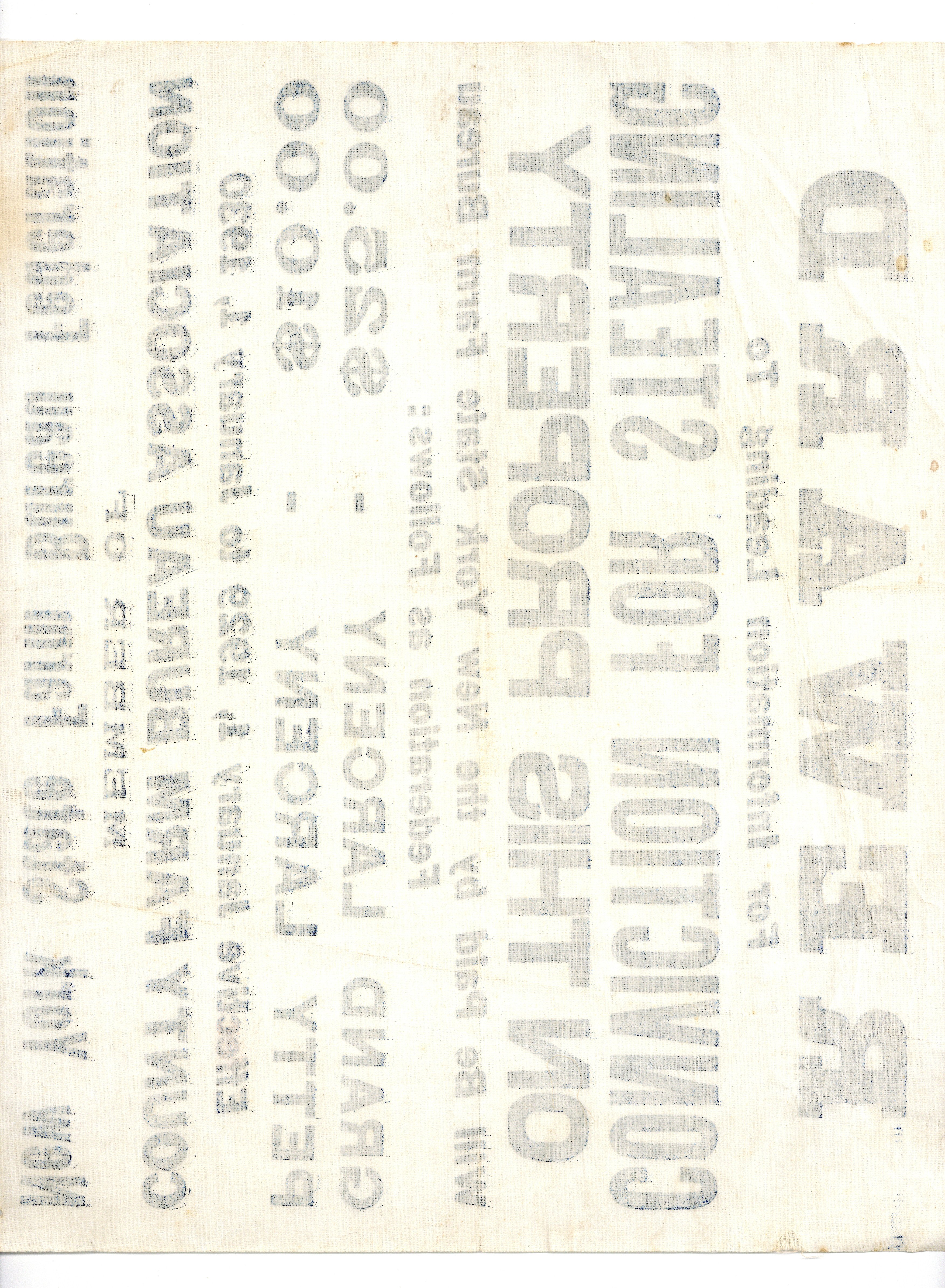 Farm Bureau Association Reward Sign (1929 New York State Farm Bureau Federation). Printed on linen in dark blue ink. 15" x 12", single sheet. Multiple full length creases with some light soiling in upper margin.