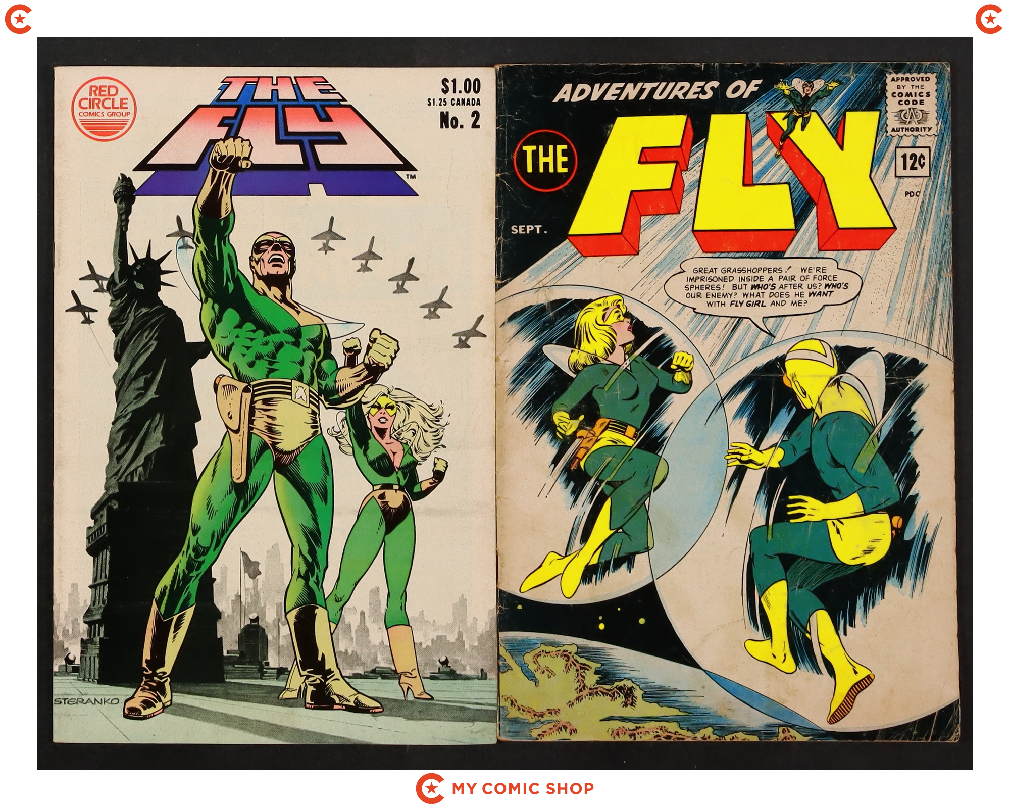 Issue 2 of Adventures of the Fly (1959 Archie), and issue 2 of Fly (1983 Red Circle/Archie). Most will grade in the GD to VG range.