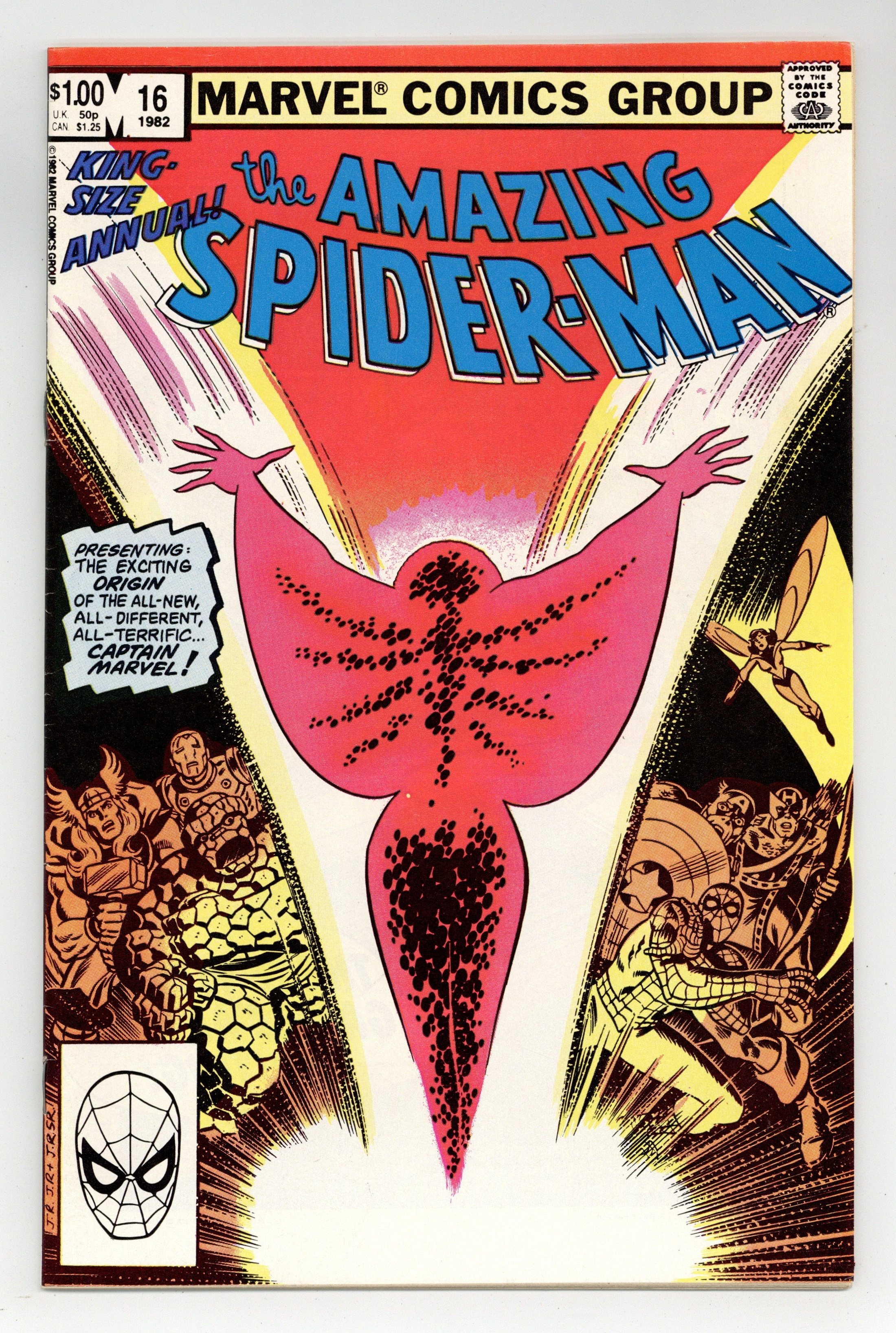 Starts Mar 23 Newsstand Edition. "Who's That Lady?" First appearance of the second Captain Marvel, Monica Rambeau. Guest-starring the Avengers and the Thing. Script by Roger Stern. Art by John Romita Jr. (breakdowns) and John Romita Sr. (finishes). Cover by John Romita Jr. and John Romita Sr. It's the dazzling debut of the new Captain Marvel (aka Monica Rambeau)! After gaining her powers in a freak accident on an offshore oil rig, the New Orleans native needs help controlling her awesome new abilities! Monica travels to New York City in hopes of finding the Fantastic Four! But she bumps into the Spectacular Spider-Man first! After eluding the web-slinger, Captain Marvel zooms to the Baxter Building! However, Ben Grimm can only offer moral support, so he sends the distressed captain to Avengers Mansion! Once there Shell-head and the Wasp attempt to stabilize Captain Marvel's runaway powers, but the wall-crawler inadvertently interferes! Is the new Captain Marvel's superhero career going to be over...before it even starts? Cameo appearances by Harry Osborn and Liz (Allan) Osborn. Avengers Lineup: Captain America, Hawkeye, Iron Man, She-Hulk, Thor, and the Wasp. First backup feature: "The Many Loves of Peter Parker" One-page breakdown of the various loves of Peter Parker's life. Second backup feature: "The Daily Bugle" One-page illustration of the cast of characters at the Daily Bugle. (Note: Captain Marvel appears next in Avengers 227.) 52 pages. Cover price $1.00.