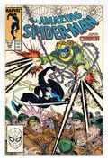 Starts Mar 9 Direct Edition. Giant-sized 25th anniversary issue. First full appearance of Venom in "Venom!", script by David Michelinie, art by Todd McFarlane; Spidey's old alien costume has merged with reporter Eddie Brock who thinks his career was ruined by Spider-Man and the symbiote of the two, Venom, takes on the web slinger; At MJ's request, Spidey returns to the blue and red costume as she now finds his black duds way too creepy; This is the last issue in which Spider-Man appears in his black costume; Thing (of the Fantastic Four) cameo.. Stan's Soapbox Special in place of letters page: Full page editorial by Stan on the occasion of Spider-Man's 300th issue. 52 pgs., full color. Cover price $1.50.
