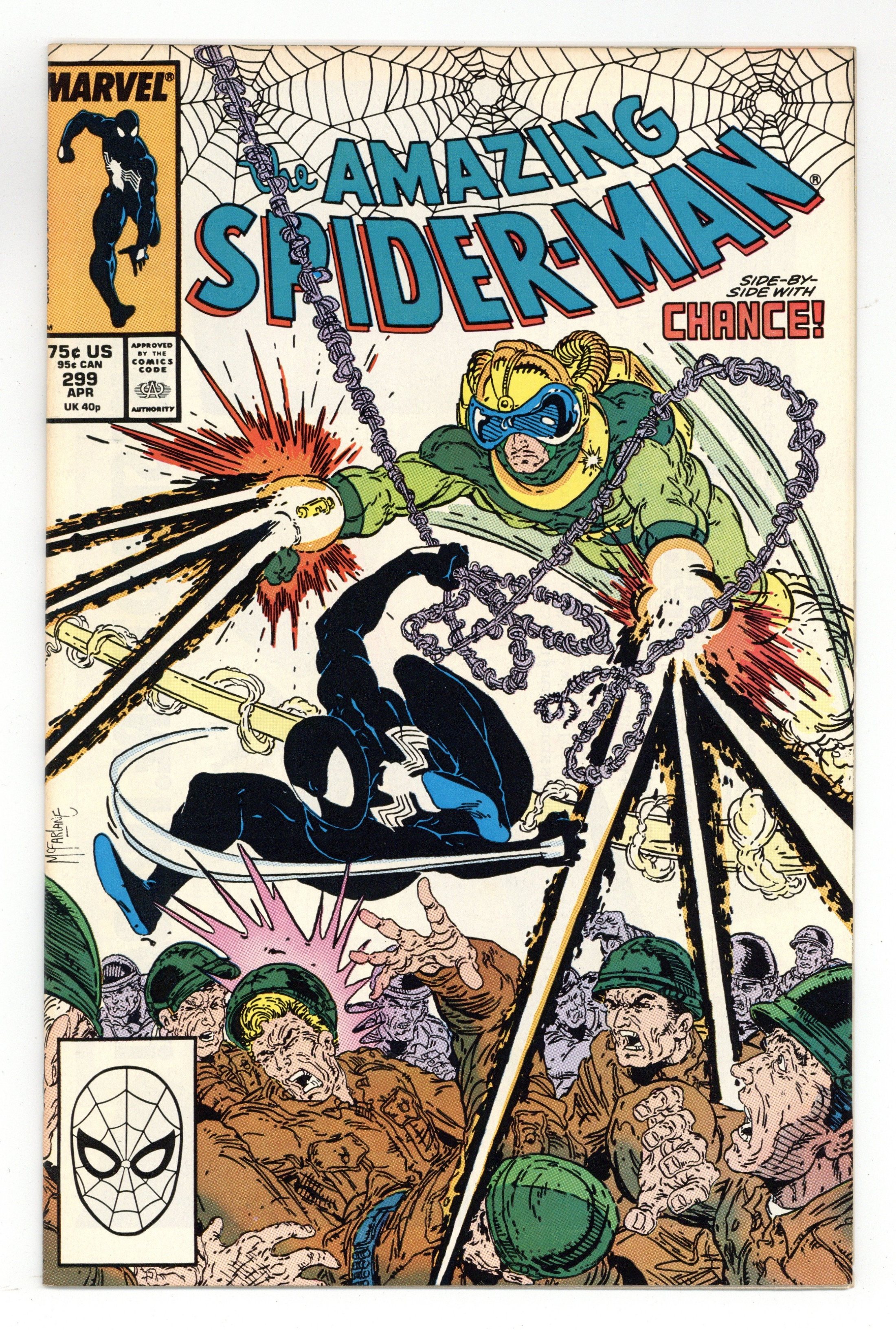 Starts Mar 2 Newsstand Edition. "Survival of the Hittist!" Part 2 of 2. Script by David Michelinie. Pencils by Todd McFarlane. Inks by Bob McLeod. Cover by Todd McFarlane. After their waterfront arms theft goes awry, the Life Foundation turns the tables on Chance! The mysterious survivalist group abducts the mercenary and takes him to their secret headquarters in northern New Jersey! But thanks to a well-placed spider tracer, the web-slinger infiltrates the foundation's secluded colony the next day...and rescues Chance! So now the adversaries of 24 hours ago suddenly become allies to avoid death...courtesy of the Life Foundation! First appearance (and cameo on the last page) by Venom. Cameo appearances by Eddie Murphy, Paul Schaffer, and Joe Robertson. Last 75¢ issue. 36 pages, full color. (Note: Chance returns in Amazing Spider-Man 336.) Cover price $0.75.