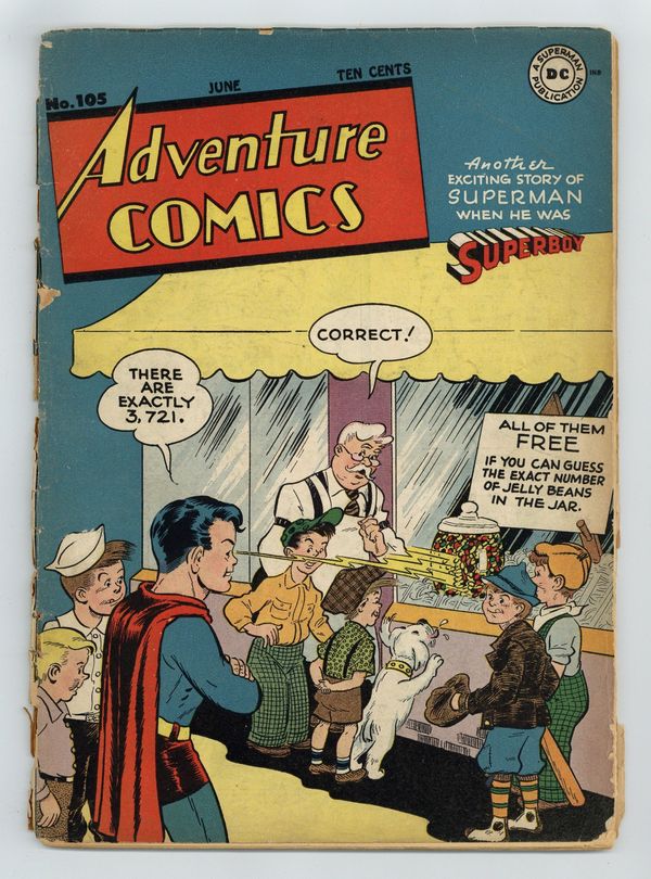 Starts Apr 27 Cover pencils by Curt Swan, inks by Shelly Moldoff. 1st appearance of Aqualad in Aquaman series in The Kid from Atlantis! Krypto's Mean Master!, script by Jerry Siegel, art by George Papp; Krypto searches for a new master after Superboy punishes him, with disastrous results. Green Arrow and Speedy (last story in Adventure Comics) in The Comic Book Archer! in which the editor at a fictitious comics publisher, All-Star Comics, explains how comics are made. "Ghost, Mr. Sloan," Speedy tells the editor, "As the editor of All Star Comics, you must do a terrific amount of work!" to which the editor replies, "But it's fun, Speedy! I discuss the stories with writers, review the art-work, and let our production manager do the rest!". 36 pages, Full Color. Cover price $0.10.