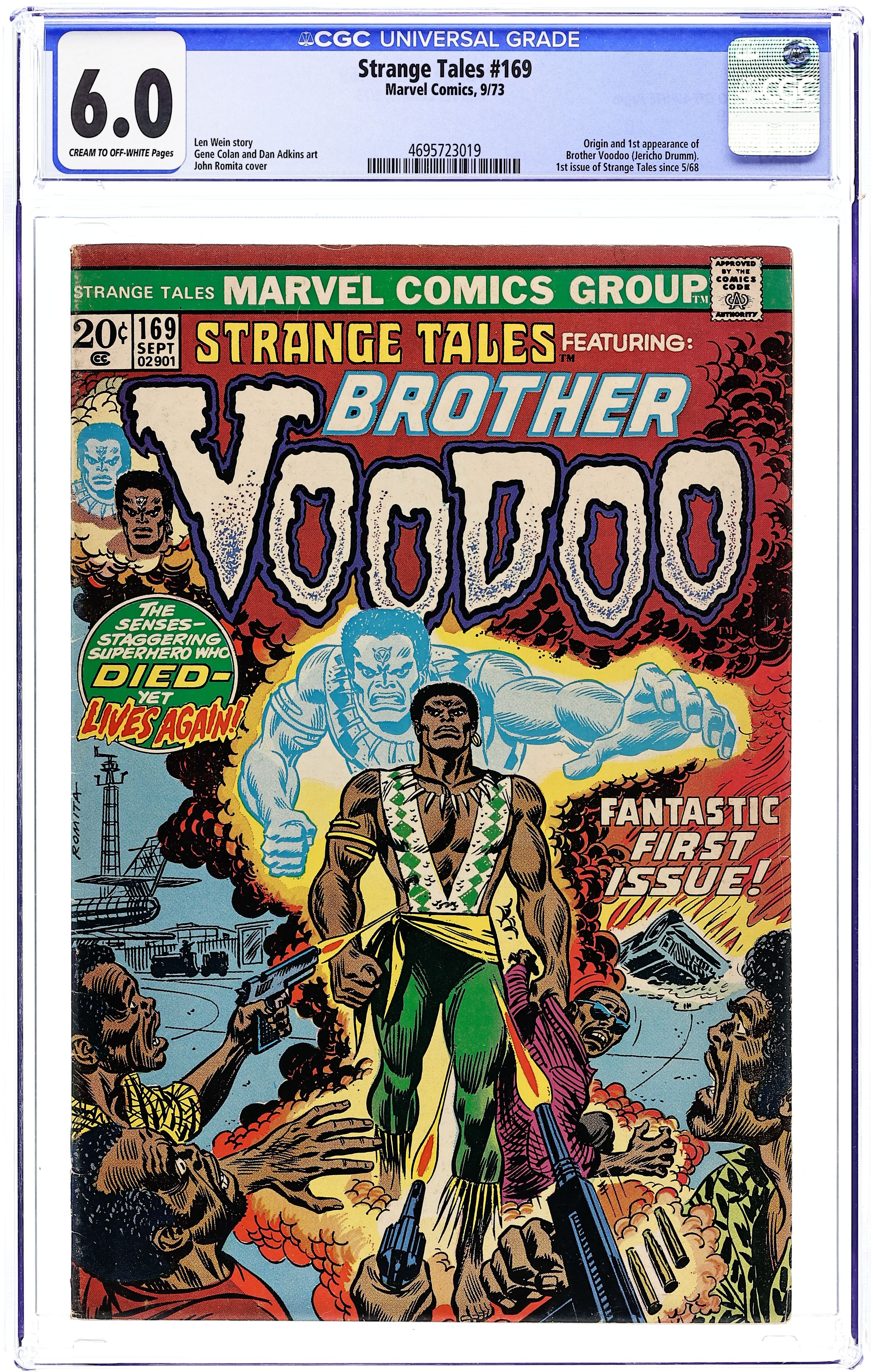 Ends Apr 15 8:05 PM CST Bid History 18 bids Current Bid $175 Your Secret Max Bid If you'd like to bid, please log in or register. Cover art by John Romita. "Brother Voodoo," script by Len Wein, pencils by Gene Colan, inks by Dan Adkins; Part one of the origin of Brother Voodoo, who is the union of Daniel Drumm's spirit in twin brother Jericho Drumm's body; Drumm returns to Haiti to find his brother dying from the curse of Damballah This is the first Brother Voodoo story; The first appearance of the character occurred in an article in Tales of the Zombie 2. 36 pgs., full color. Cover price $0.20.