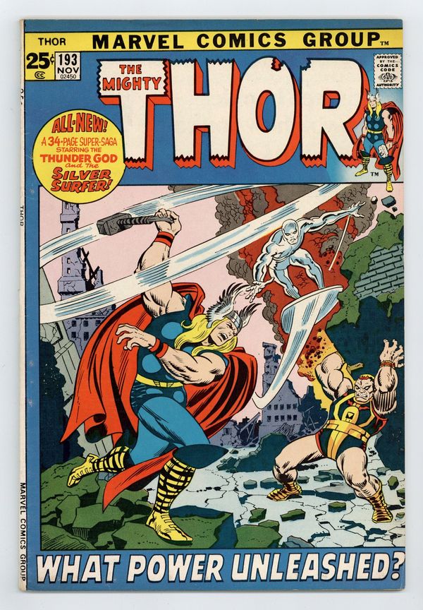 Ends Apr 15 8:32 PM CST Bid History 9 bids Current Bid $57 Your Secret Max Bid If you'd like to bid, please log in or register. Last 15-cent cover price. Cover pencils by John Buscema, inks by Frank Giacoia. "Conflagration!", script by Stan Lee, pencils by John Buscema, inks by Sam Grainger; Loki boasts that he his new creation Durok the Destroyer will prove to be the end of Thor, after sending both to Earth to fight it out; Furious at Loki's evil Hogun attempts to strike the trickster with his mace, however Loki deflects it and is about to sentence the Warriors Three to death when Sif manages to talk Loki out of it; Loki then decides to turn his attention to Earth to watch the battle between Thor and Durok; On Earth, Durok appears in New Orleans during Mardi Gras, and begins to rampage through a parade when Thor arrives to battle him. Appearances by Balder, Fandral, Volstagg, Karnilla, and Odin. Silver Surfer cameo. 36 pgs., full color. $0.15. Cover price $0.15.