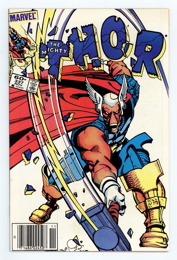 Starts Oct 3 Direct Edition. Cover by Walt Simonson. "Something Old, Something New," script and art by Walt Simonson; Odin has the dwarves create a hammer for Bill and sends the alien and his son into space to rescue Bill's people. Appearances by Sif, Odin, and Volstagg. Bullpen Bulletins. Carlin and Simonson's Page O' Thor Stuff; Assistant editor's month shenanigans. Star Frontiers TSR ad. 36 pgs., full color. $0.60. Cover price $0.60.