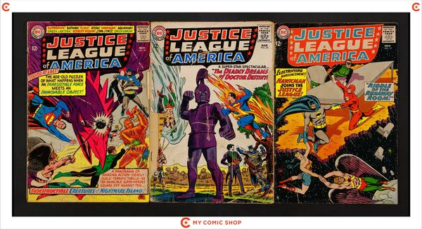 Issues 56, 57, 59, 63, 65, 68, 71, 73, 85 of Justice League of America (1960 1st Series). Most will grade in the FR to GD/VG range, with #63 grading at PR (INCOMPLETE).