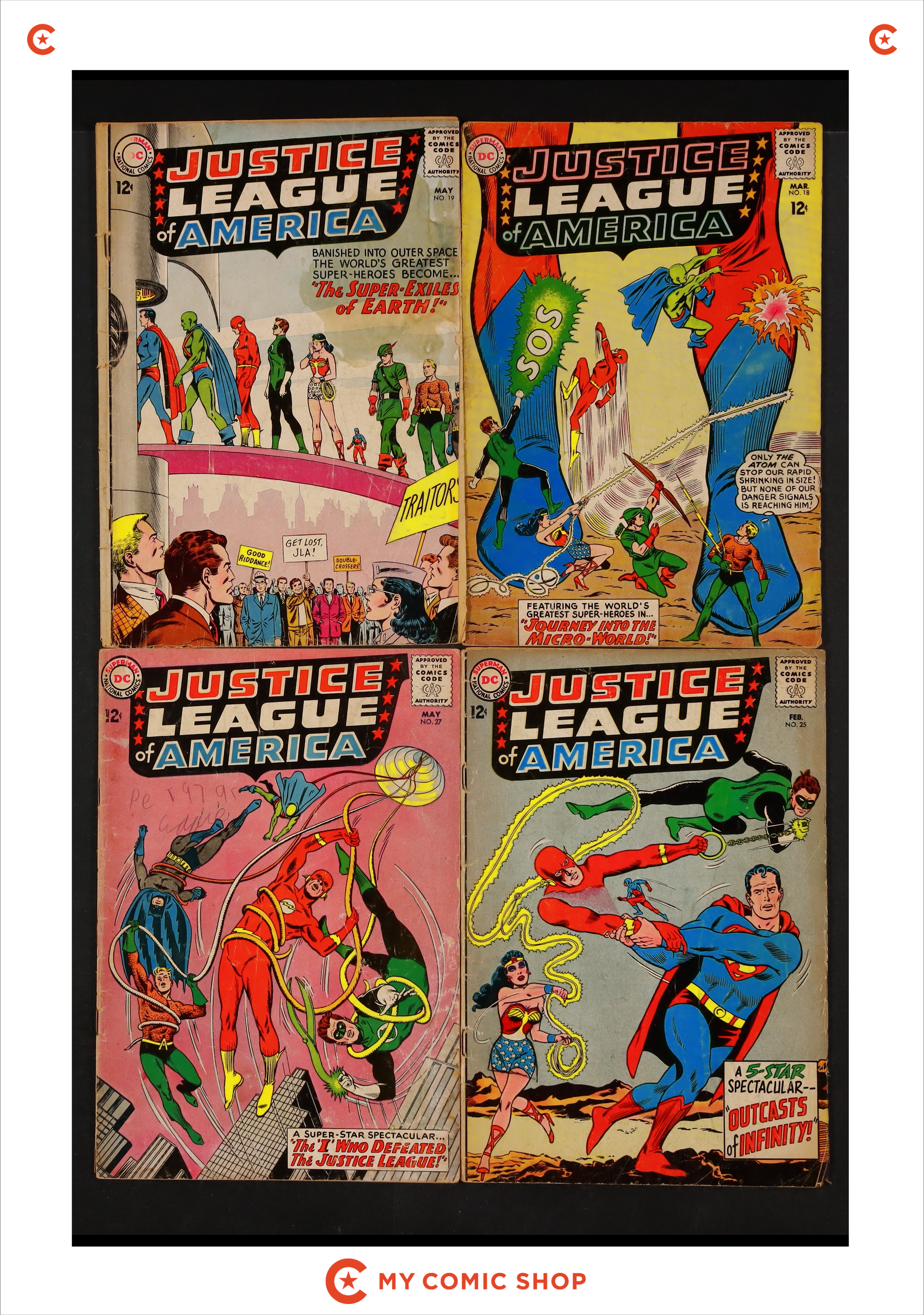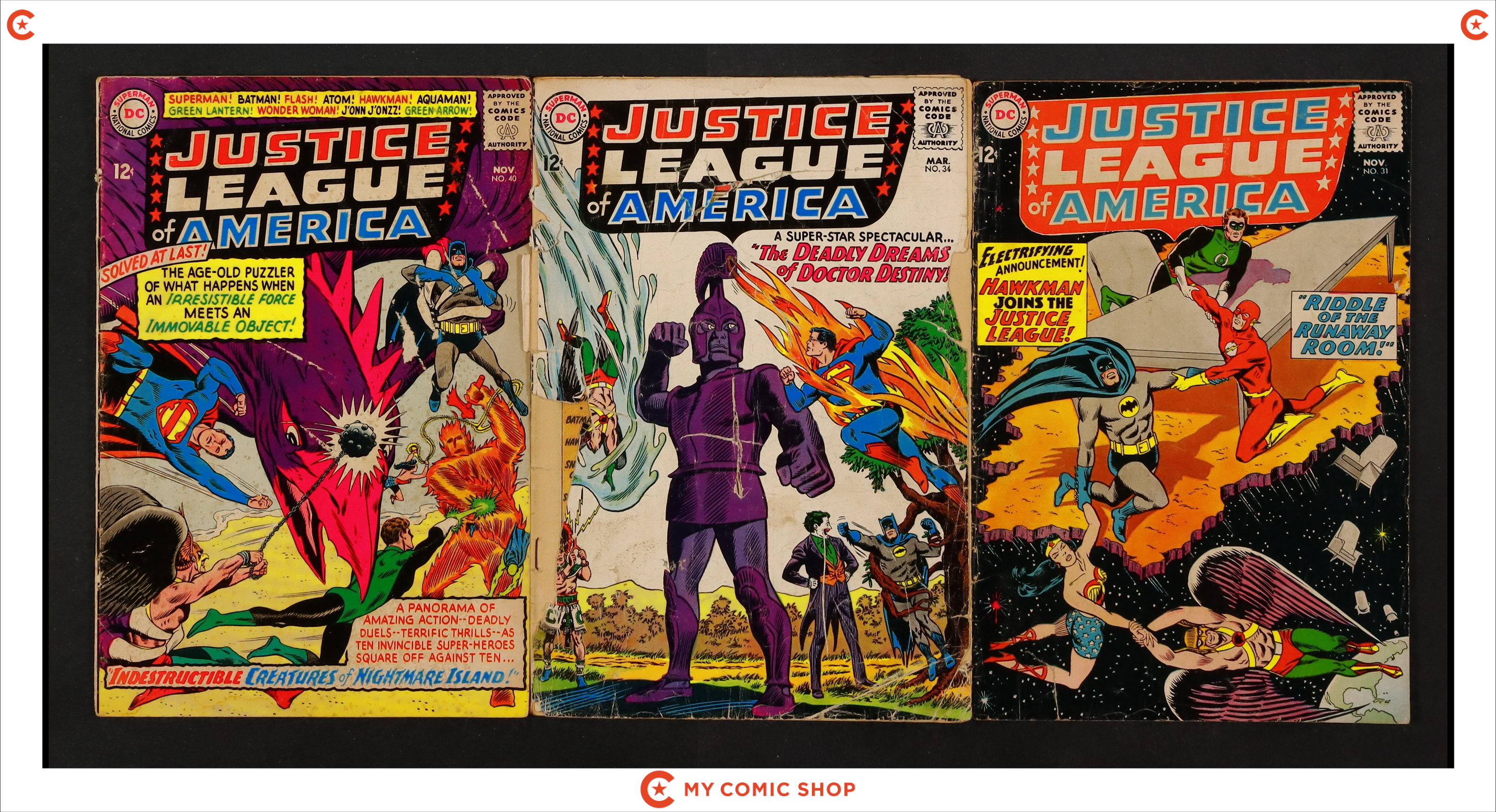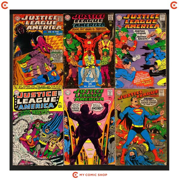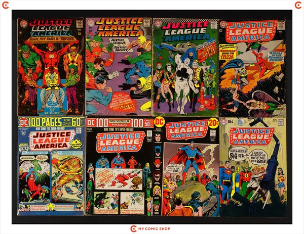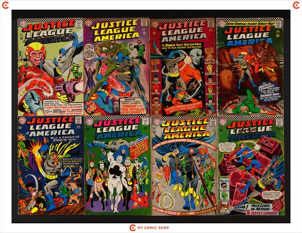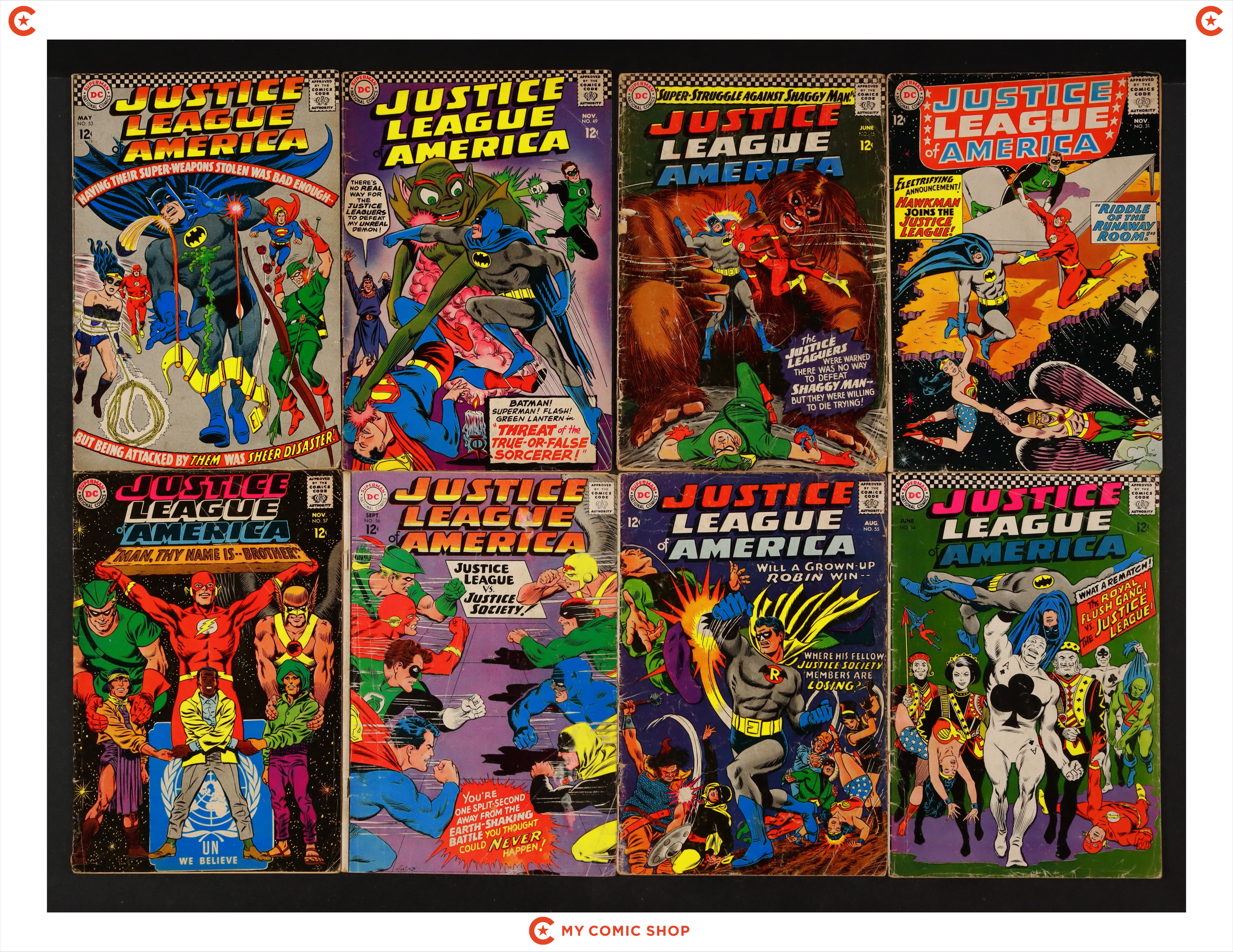 Issues 31, 54, 56, 57, 73, 102, 110, 115 of Justice League of America (1960 1st Series). Most will grade in the FR to VG range.