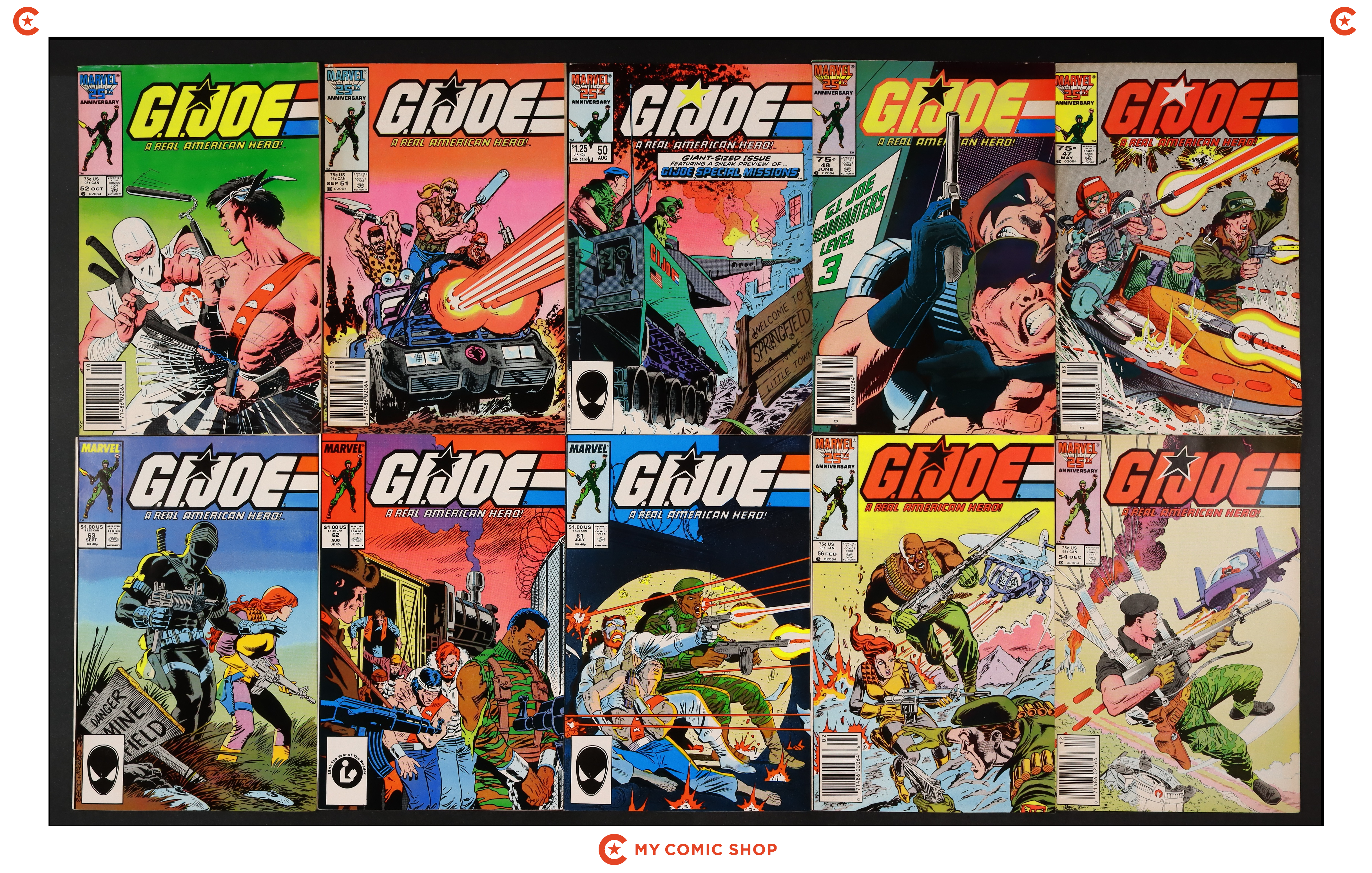 Issues 48, 50, 51, 52N, 53N, 54, 55, 56D, 57, 58 of GI Joe A Real American Hero (1982 Marvel). Most will grade in the GD to VG/FN range, with 58 grading at PR (INCOMPLETE. Page missing, interrupts art and story).