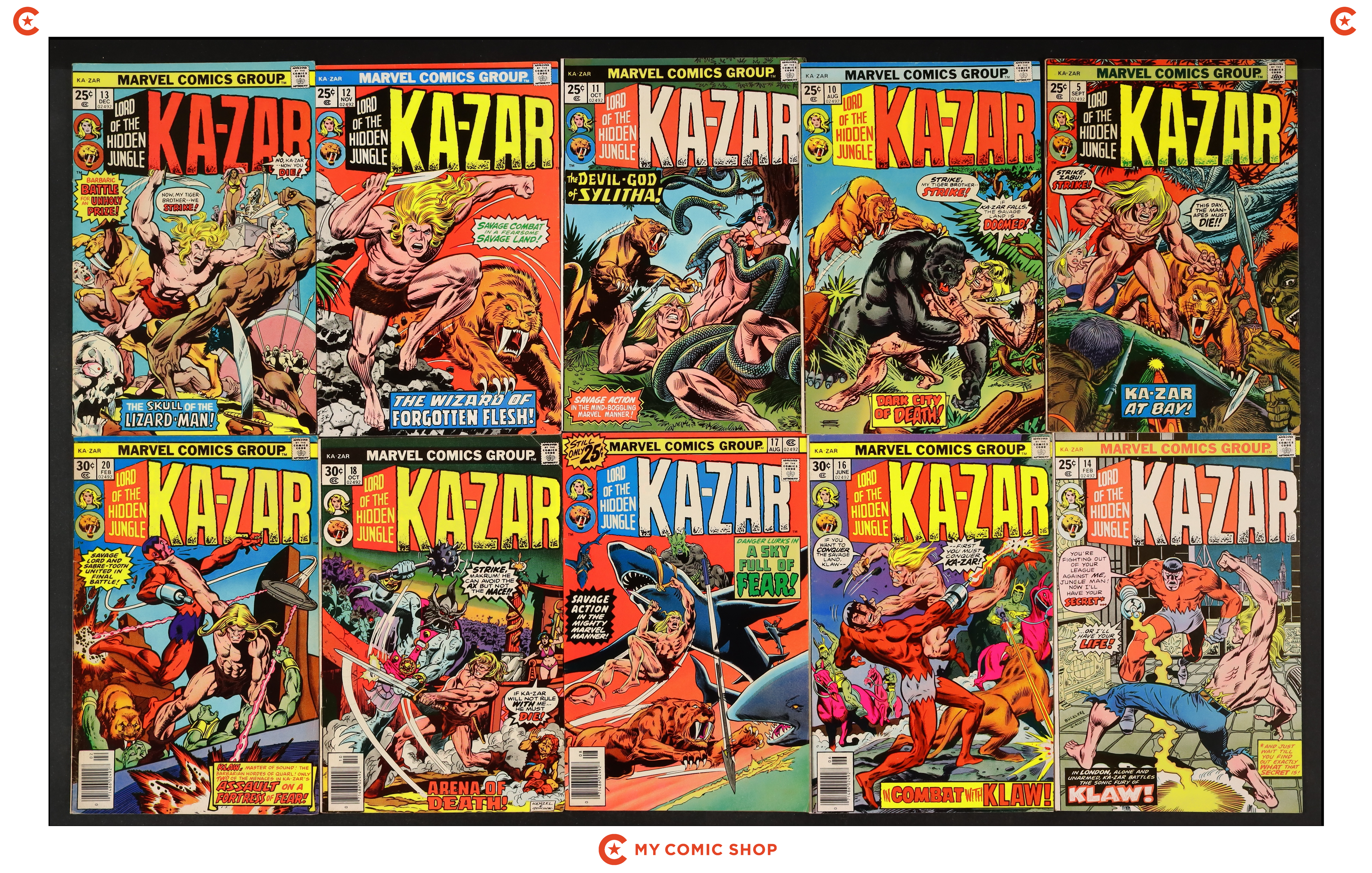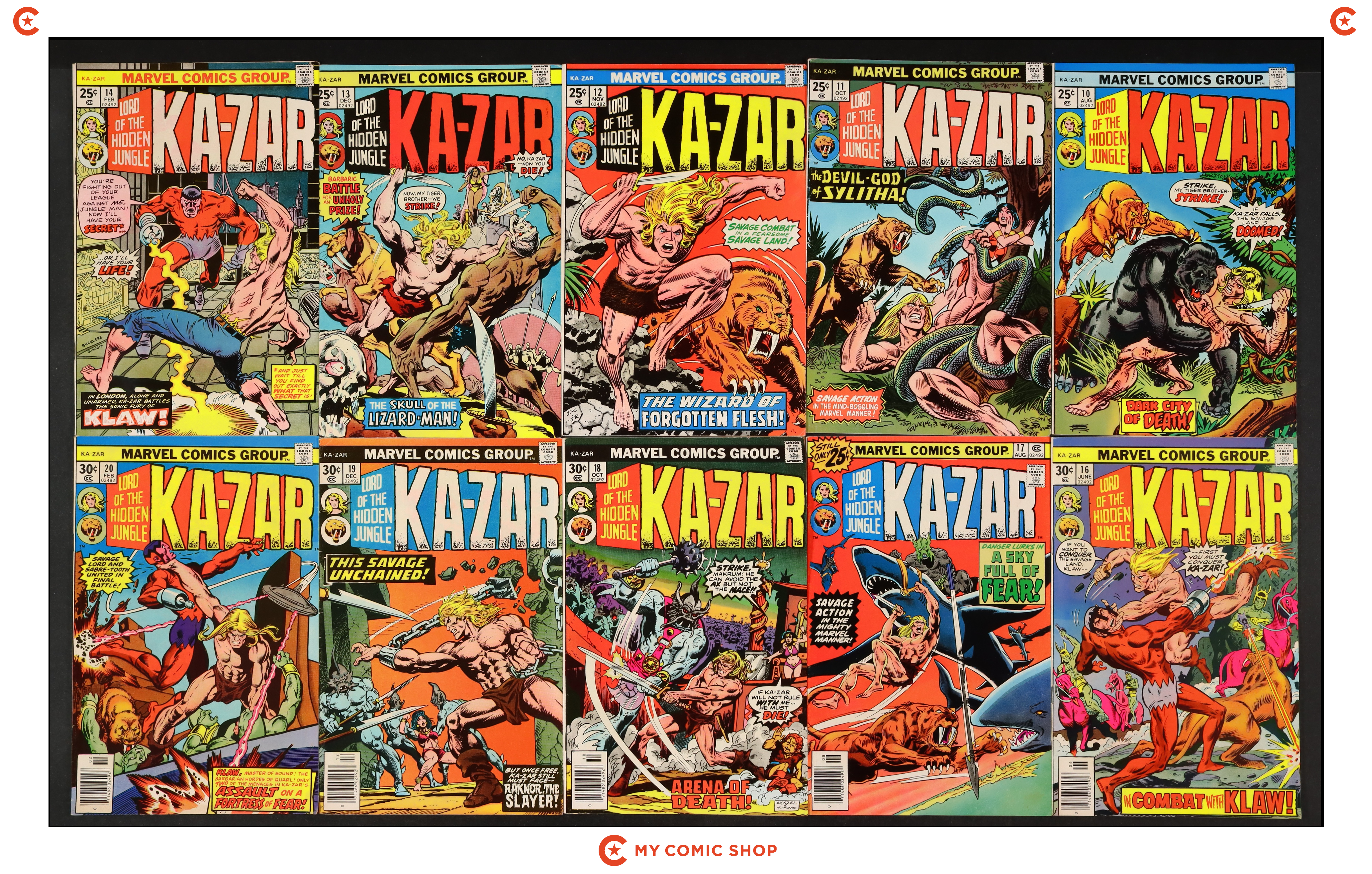 Issues 5, 10-14, 16-18, 20 of Ka-Zar (1974 2nd Series); plus Mark Jewelers 16MJ. Most will grade in the VG to FN- range.