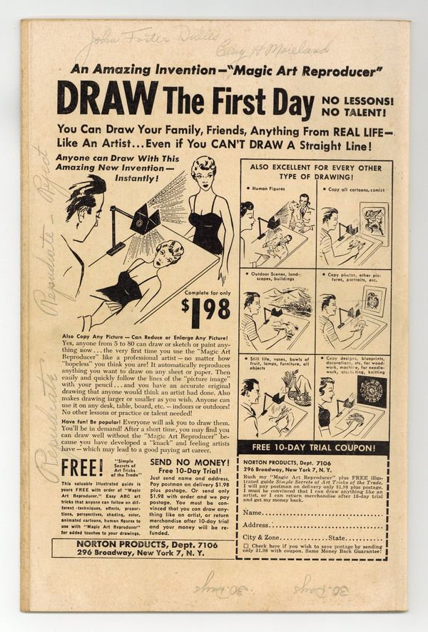 Strange Gift from the Unknown starring Fate, art by Jim McLaughlin; In Paris, art painter Philip Rhodes is a failure; Though warned by Fate, he indulges in a satanic deal with the forces of the supernatural. Revenge of the Haunted starring Fate, art by Lou Cameron; Biff Stone is a monster-hunter; He supplies circuses around the world with werewolves, vampires and such. Phantoms of the Forgotten starring Fate, art by Louis Zansky; The crook George Crandall resurrects himself a posse of undead wild west bad men; They commit robberies until a wild west sheriff is brought back to life as well. Invitation to Your Wake; A congregation of; werewolves, zombies, vampires and other monsters meets in a castle; They invite all mystery writers there and kill them--so they won't reveal any more secrets of the supernatural. 36 pgs. $0.10. Cover price $0.10.
