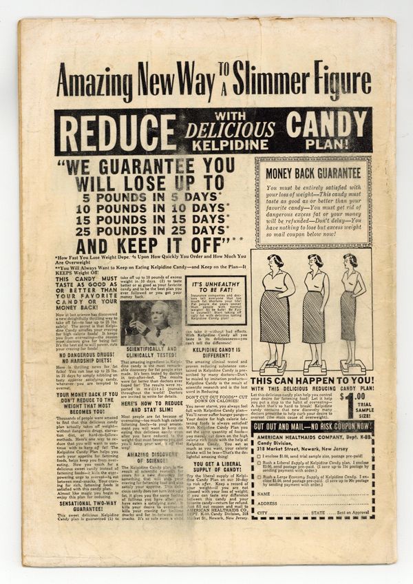 Roots of the Evil Tree, art by Louis Zansky; Crazed artist Kurt Coleman shapes an "execution tree" into human form; It comes alive during a thunderstorm and follows him around like a pet. The Final Curtain, pencils by Lou Cameron, inks by Rocco "Rocke" Mastroserio; Actor Morissey kills his colleagues to get the leading part in "Hamlet", though he has been warned several times by Fate personally to refrain from these acts of murder. The Man Who Bought a Genie, pencils by Bill Molno, inks by Rocco "Rocke" Mastroserio; Antiques dealer Ridley buys a chest containing the genie of Kuo; Ridley wants to marry Annabelle for her money, the genie helps him achieving this goal; But Annabelle dies and Ridley is accused of murder. The Brew of Frightful Faces, pencils by Jim McLaughlin; In a cave in Central America, Van Jacobi discovers a potion which distorts a person's features; As Jacobi is a film studio's make-up man and jealous of the leading man, he applies the brew to his face. 36 pgs. $0.10. Cover price $0.10.