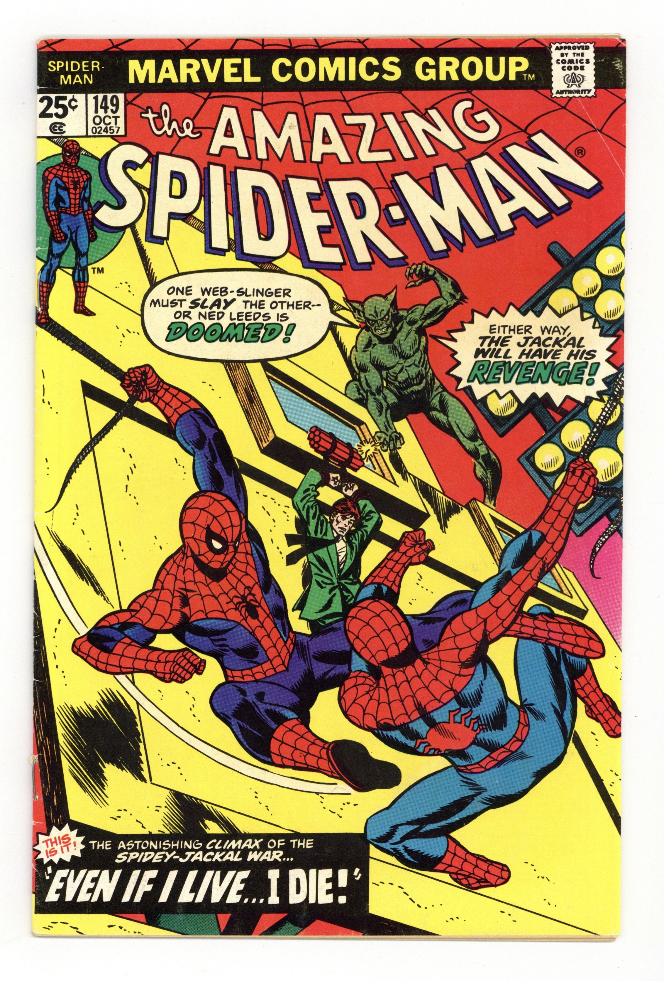Starts Jan 19 First appearance of the Spider-Man Clone in "Even If I Live, I Die!" Script by Gerry Conway. Pencils by Ross Andru. Inks by Mike Esposito and Dave Hunt (backgrounds). Cover by Gil Kane and Frank Giacoia. One of the classic web-slinger issues of the bronze age! At Shea Stadium in Queens, the master plan of the Jackal finally comes together! On the infield grass, the Amazing Spider-Man fights to the finish against a carbon copy of himself - the Spider-Clone! With Ned Leeds in mortal danger, can the wondrous wall-crawler triumph over his clone and the Jackal too? But even if he wins, your friendly neighborhood Spider-Man may still lose Gwen once again. An emotional ending for all. Origins of the Jackal and the Gwen Stacy clone. Apparent deaths of the Jackal and the Spider-Clone. Cameo appearances by Joe Robertson, J. Jonah Jameson, Betty Brant, Mary Jane Watson, and the Tarantula. Flashback cameos by Anthony Serba and Gwen Stacy. (Note: The Gwen Stacy clone returns many years later in Spectacular Spider-Man Annual 8. The next story arc relating to the clone saga takes place in Spectacular Spider-Man (1st series) 25-31 - the introduction of Carrion, the clone of Professor Miles Warren. This issue completes Gerry Conway's unforgettable 3-year run as the writer of the Amazing Spider-Man title - highlighted by the death of Gwen Stacy; the creation of the Punisher; and the Spider-Clone saga. Many future stories proceeded from Gerry Conway's bronze age scripts. The full clone saga was reprinted in 2011 in the trade paperback: The Amazing Spider-Man - The Original Clone Saga. This story was reprinted in Marvel Tales 126.) 36 pages. 25c cover price. Cover price $0.25.