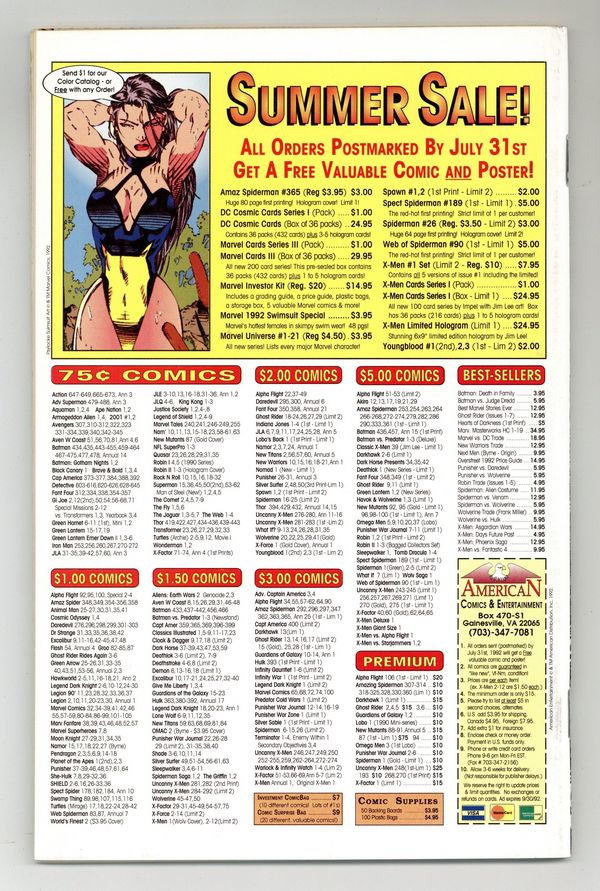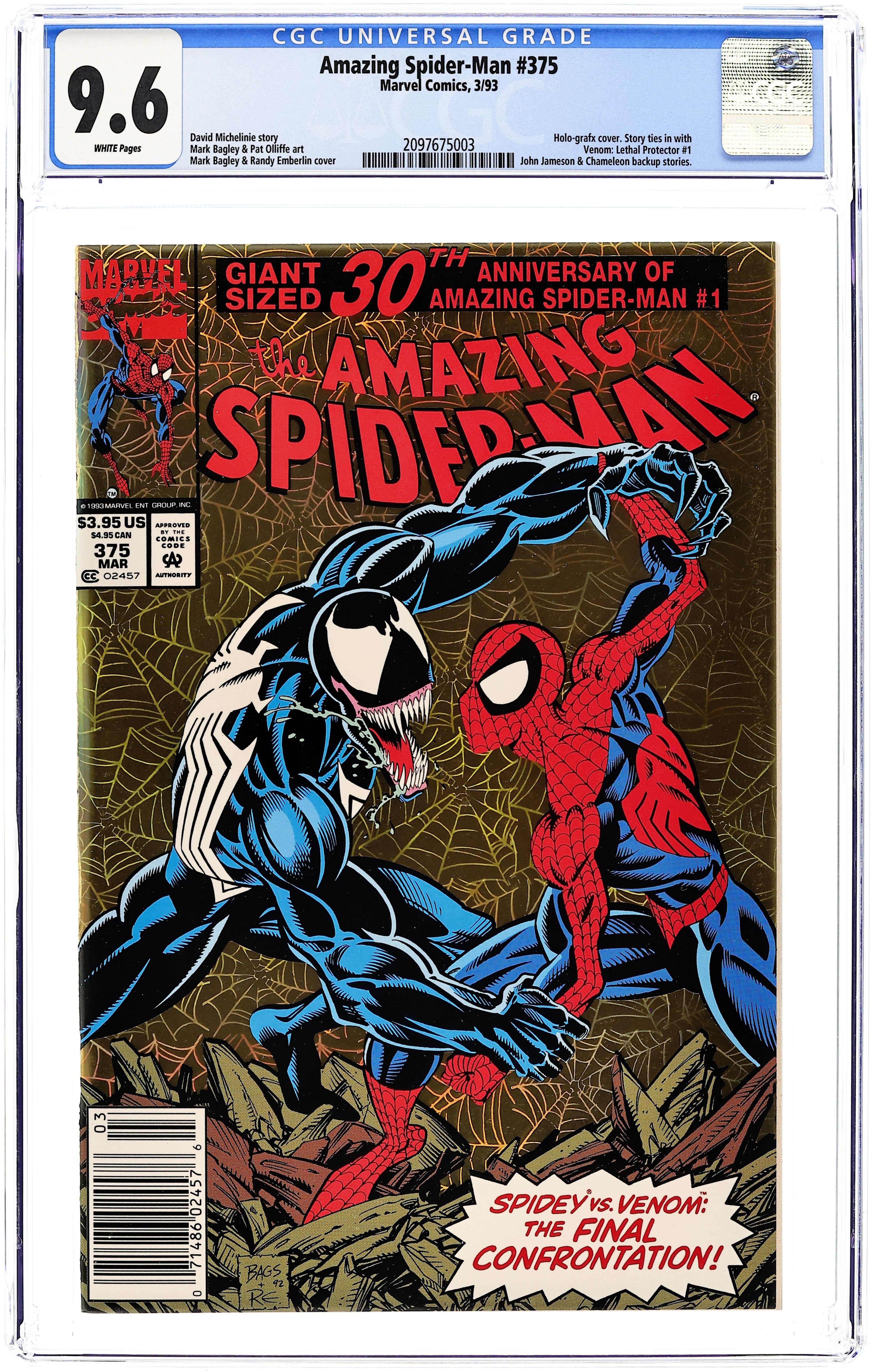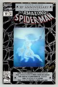 Starts Feb 16 Newsstand Edition. 30th Anniversary issue of Amazing Spiderman #1. "The Bride of Venom" Part 2 of 2. Script by David Michelinie. Pencils by Mark Bagley. Inks by Randy Emberlin. Gold foil holografix cover by Mark Bagley and Randy Emberlin. Inside an abandoned Brooklyn amusement park, the Lethal Protector holds Richard and Mary Parker captive! The disturbed Venom thinks he's just doing what's best for Peter's parents! But that's not going to work! No way, no how! So, the wall-crawler heads to the park knowing a fierce fight awaits! However, the web-slinger may have help this time from a very unlikely source...Eddie Brock's ex-wife! Wow, will there be a family reunion atop the Ferris wheel? Or perhaps a funeral beneath it? One way or another, the Amazing Spider-Man and Venom battle for the last time! Cameo appearances by Silver Sable, Battlestar, Mary Jane Watson, and J. Jonah Jameson. Second story: "True Friends!" Script by Tom DeFalco. Pencils by Patrick Olliffee. Inks by Mark McKenna. Aware of what the Human Torch did to Empire State University, Spider-Man vows to bring his friend to justice. Cameo appearance by Silver Sable. Plot crosses over with Fantastic Four 373 & 374. Third story: "The Monster Within" Script by Eric Fein. Art by Dan Panosian. JJJ tries to get his son, John Jameson, started in the field of journalism. Fourth story: "Echoes..." Script by Terry Kavanagh. Pencils by Aaron Lopresti. Inks by Don Hudson. The Chameleon visits the grave of Kraven the Hunter. (Notes: Venom appears next in the first issue of his Lethal Protector (1993) series. The letters page includes a statement of ownership: average print run 660,958. average paid circulation 544,900.) 68 pages. Cover price $3.95.