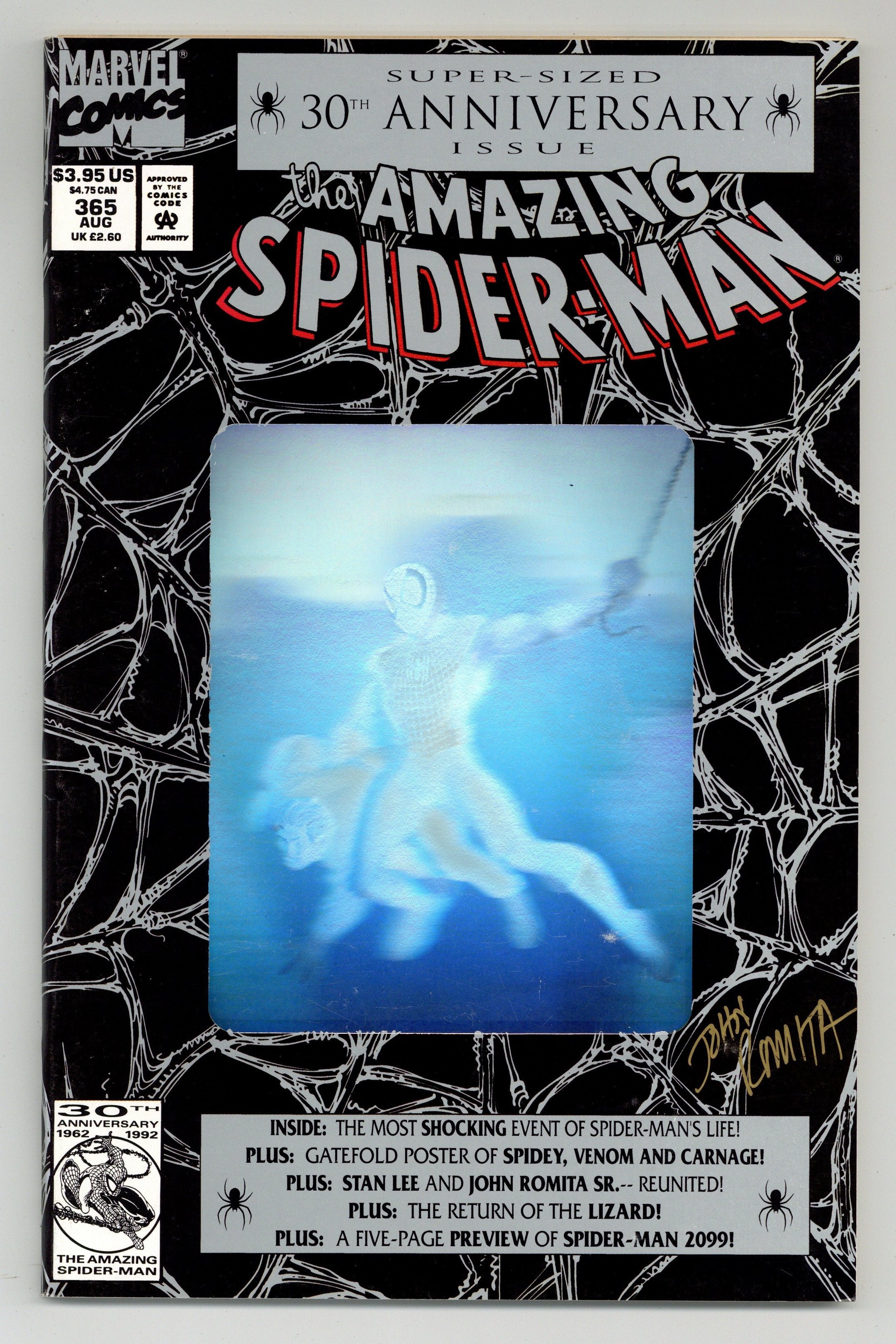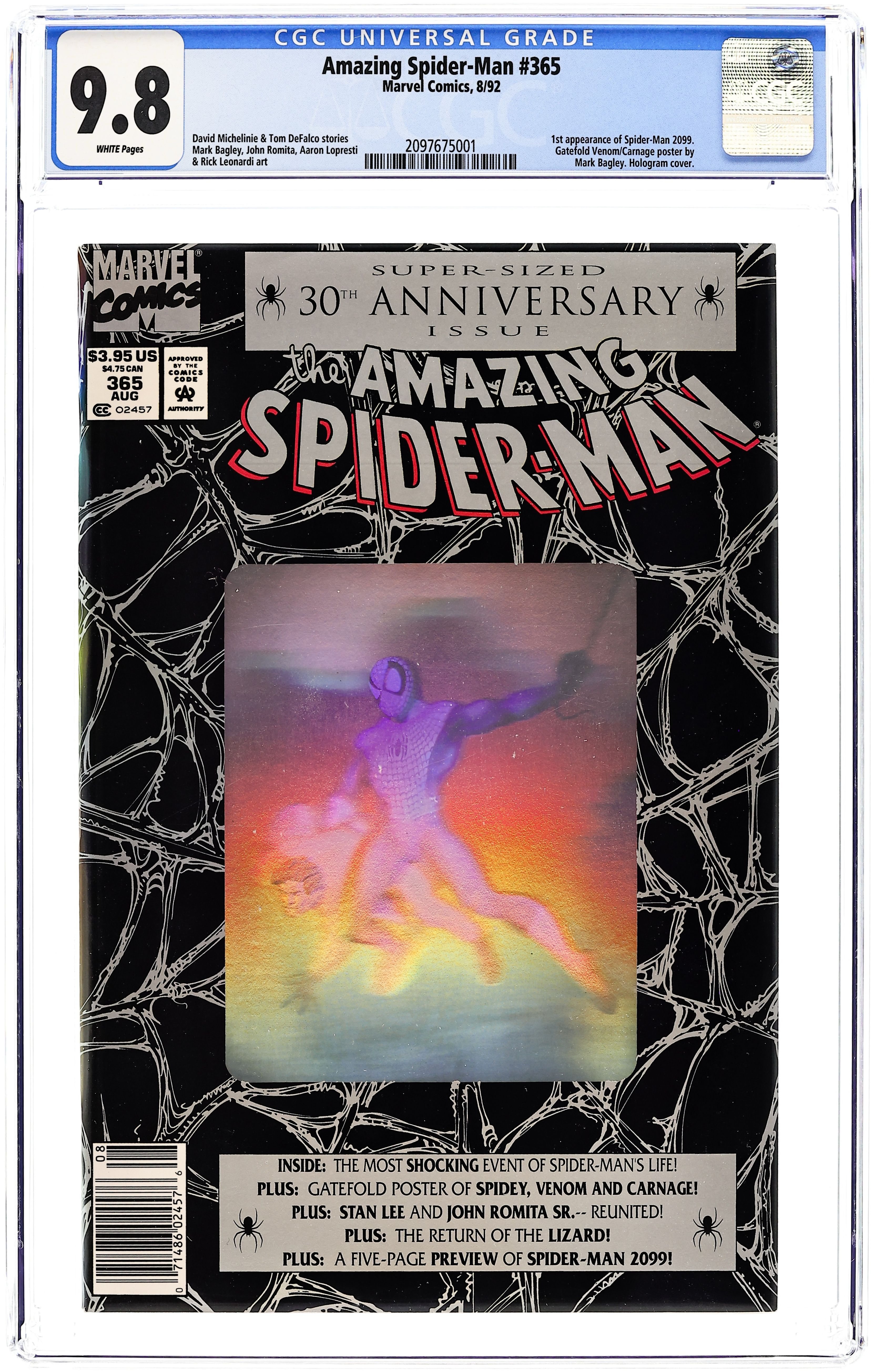 Starts Feb 16 Direct Edition. 80-page giant 30th Anniversary issue, with the first appearance of Spider-Man 2099! The Lizard returns in "Fathers and Sins." Script by David Michelinie, pencils by Mark Bagley, inks by Randy Emberlin. J. Jonah Jameson is featured in "How I Created Spider-Man!" Script by David Michelinie, art by Aaron Lopresti. Gwen Stacy takes center stage in "I Remember Gwen." Script by Stan Lee, plot by Tom DeFalco, art by John Romita Sr. (Cameos by the Green Goblin and Doctor Octopus.) The Prowler is also here in "A Friend in Need." Script by Tom DeFalco, pencils by Tod Smith, inks by Andrew Pepoy. There are also two text pieces, "The Saga of Spidey's Parents" by Stan Lee, and "Spider-Man: The First Thirty Years" by Peter Sanderson. Spider-Man 2099 gets a sneak preview, with a script by Peter David, pencils by Rick Leonardi, and inks by Al Williamson. This issue was originally released with a fold-out poster of Spidey versus Venom and Carnage (poster may be missing in lower grades). 84 pgs. Cover price $3.95.