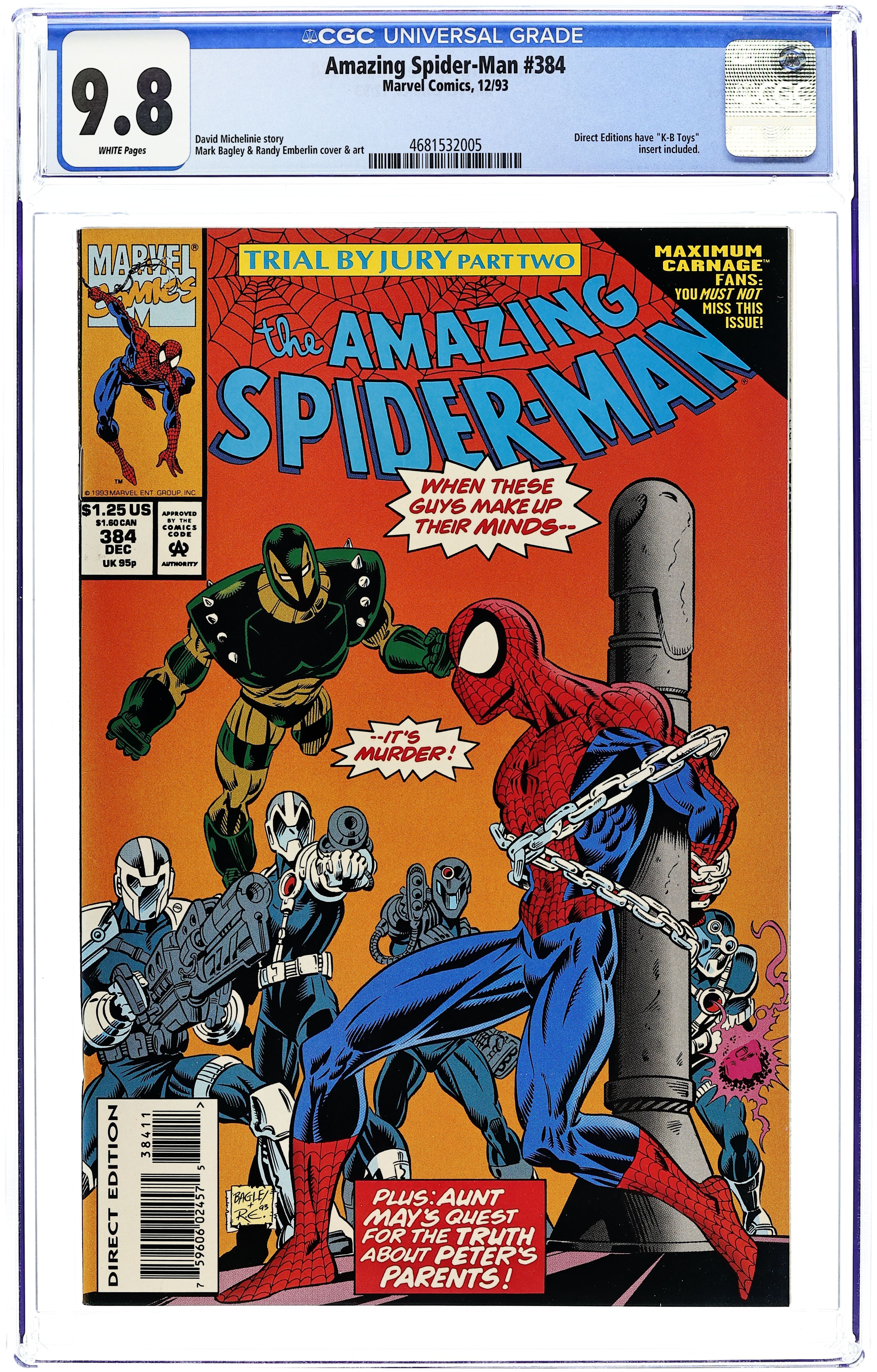 Starts Feb 23 "Dreams of Innocence." Trial by Jury, Part 2 of 3. Maximum Carnage tie-in. Script by David Michelinie. Pencils by Mark Bagley. Inks by Randy Emberlin and Al Milgrom. Cover by Mark Bagley and Randy Emberlin. After being apprehended by the Jury last issue, the wall-crawler stands trial in their (kangaroo) court! Forget about habeas corpus and throw out the right to counsel... the sedated web-slinger must face his accusers alone! The Jury charges the amazing one with playing a part in the creation of Venom! And alas that is something Aunt May's nephew cannot completely deny. Once the Jury convicts Spider-Man, Orwell Taylor sentences him to death! The situation looks grim. Is it too late for an eleventh hour appeal? Cameo appearances by Mary Jane Watson, Aunt May, Richard Parker, and Mary Parker. Flashback cameos by the alien symbiote, Eddie Brock, Venom, Cletus Kasady, Carnage, Styx & Stone, Carrion, Shriek, and the Demogoblin to recap Venom's origin and the Maximum Carnage saga. (Note: This issue includes a 16-page advertising insert for the upcoming storylines in the Punisher and New Warriors titles; and the Ghost Rider Hot Pursuit Kay-Bee's Collector Edition #1 giveaway.) 52 pages. Cover price $1.25.