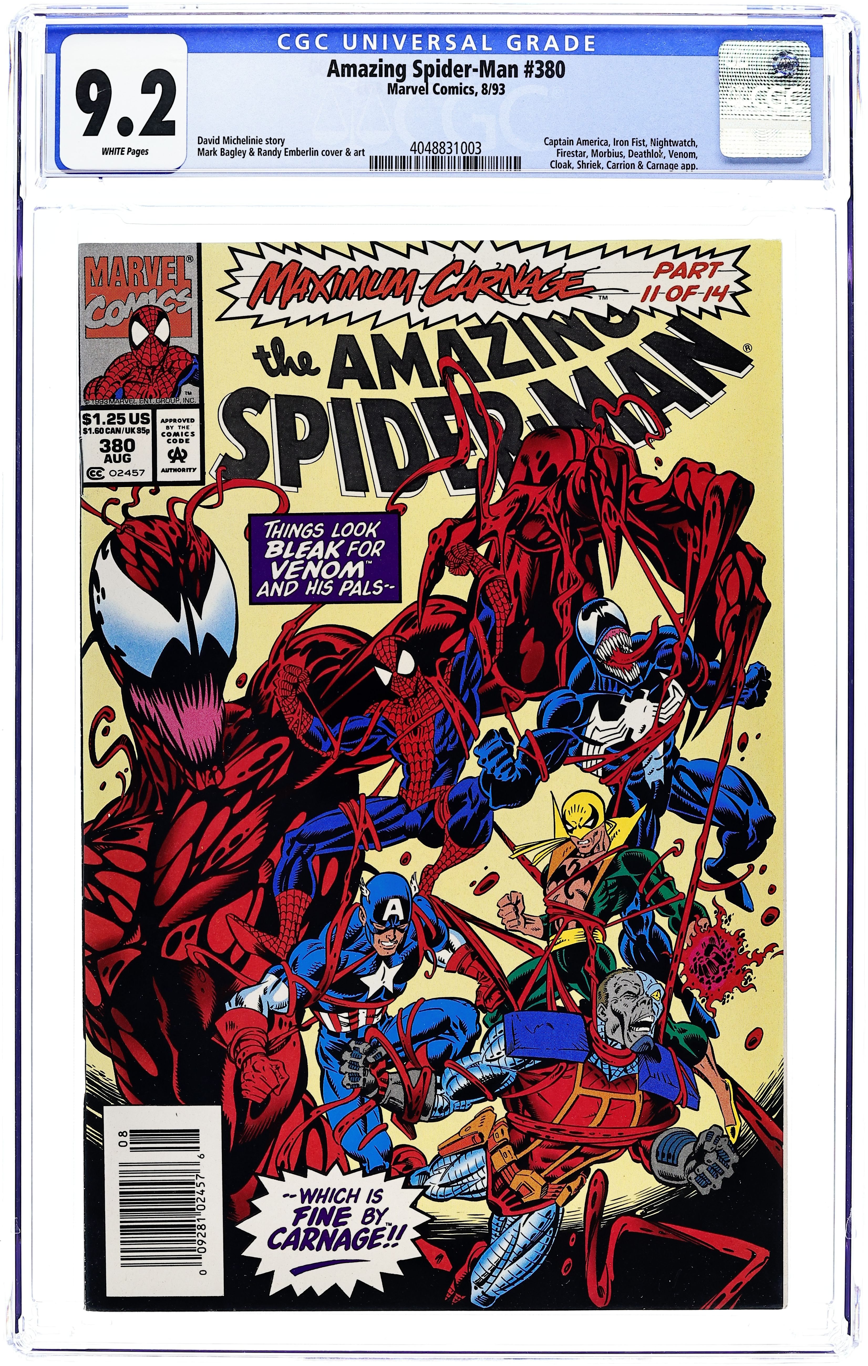Ends Feb 16 7:21 PM CST Bid History 10 bids Current Bid $47 Your Secret Max Bid If you'd like to bid, please log in or register. Direct Edition. "Savage Grace!" Part 3 of 3. Script by David Michelinie. Pencils by Mark Bagley. Inks by Randy Emberlin. Cover by Mark Bagley and Randy Emberlin. Carnage takes J. Jonah Jameson hostage and drags him to a heavy metal concert at Madison Square Garden! The psychotic killer plans to execute JJJ in front of thousands of headbangers! But before Carnage can deliver the deathblow, Spider-Man and Venom strike! The ferocious fight leads into the subway tunnels and then back onto the concert stage! Where thanks to MSG's awesome sound system, the web-slinger tries to knock out both Carnage and Venom! The wall-crawler's ploy better work, because double-crossing Venom could have lethal consequences! A fantastic finish! First appearances of the Richard Parker and Mary Parker life model decoys (LMD's). Cameo appearances by Joe Robertson, Mr. Fantastic, and the Human Torch. (Notes: Venom appears next in the one-shot: Spider-Man Special Edition -- The Trial of Venom (1992). Carnage returns in the first issue of Spider-Man Unlimited (1993 1st series) to kick off the Maximum Carnage saga.) 36 pages. $1.25 cover price. Cover price $1.25.