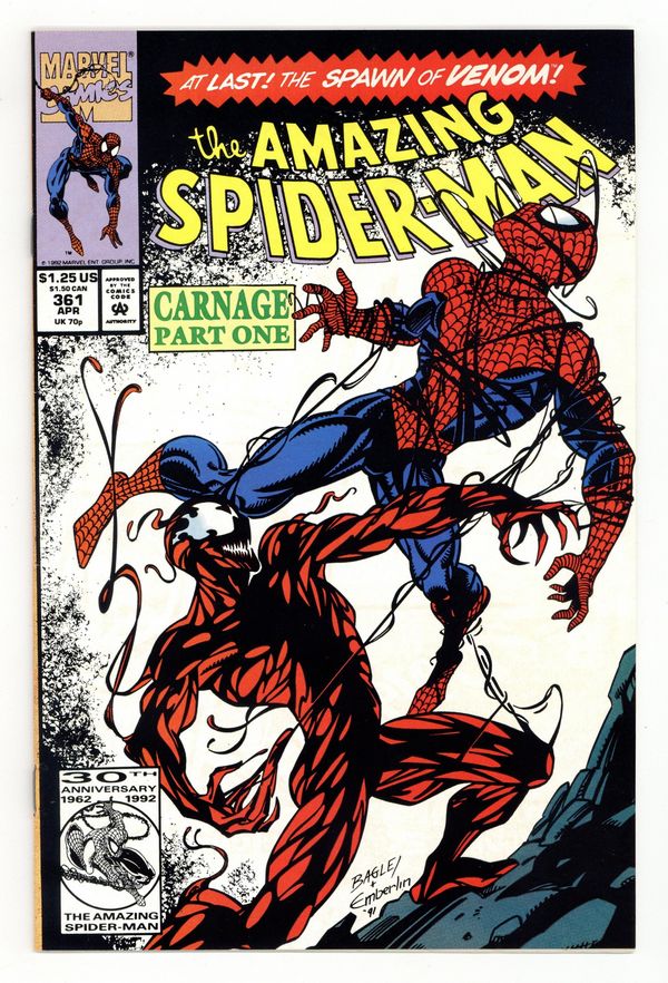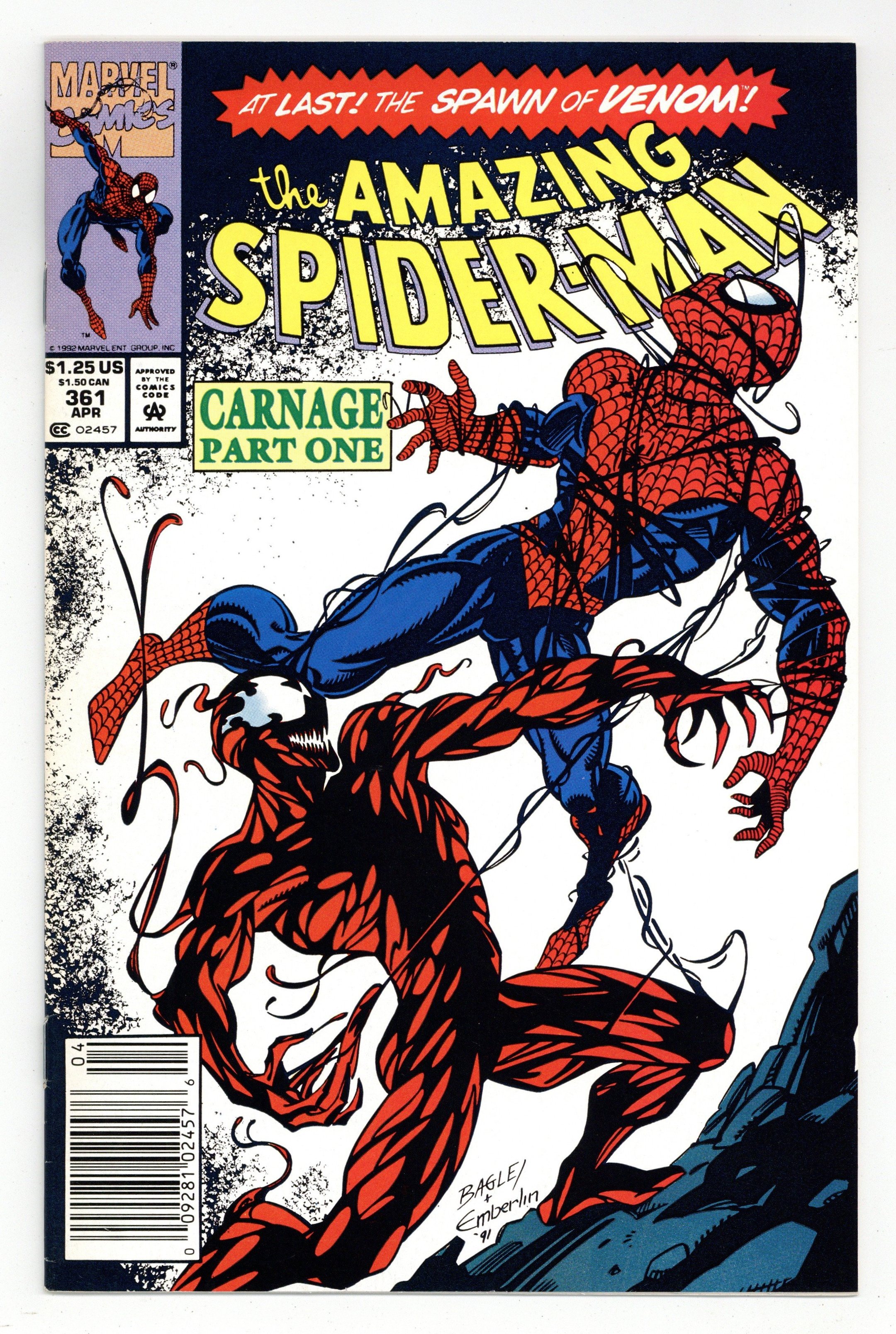 Starts Apr 27 First Printing. Direct Edition. First (full) appearance of Carnage in "Savage Genesis!" Part 1 of 3. Script by David Michelinie. Pencils by Mark Bagley. Inks by Randy Emberlin. Cover by Mark Bagley and Randy Emberlin. Blood runs in the streets as a serial killer roams New York City! And as the web-slinger investigates the murders, he notices a very disturbing similarity to another killer's modus operandi! In a burned-out building in Brooklyn, the spectacular one comes face-to-face with his new homicidal foe...Carnage! Can the wall-crawler end Cletus Kasady's rampage in their very first encounter? Cameo appearances by Aunt May and Mary Jane Watson. Flashback cameo by Venom. (Note: This three-part story was reprinted in 2011 in the trade paperback: Spider-Man -- The Vengeance of Venom.) 36 pages, full color. $1.25 cover price. NOTE: Most of these were distributed with slight printer tears in the bottom edge of the cover. Cover price $1.25.