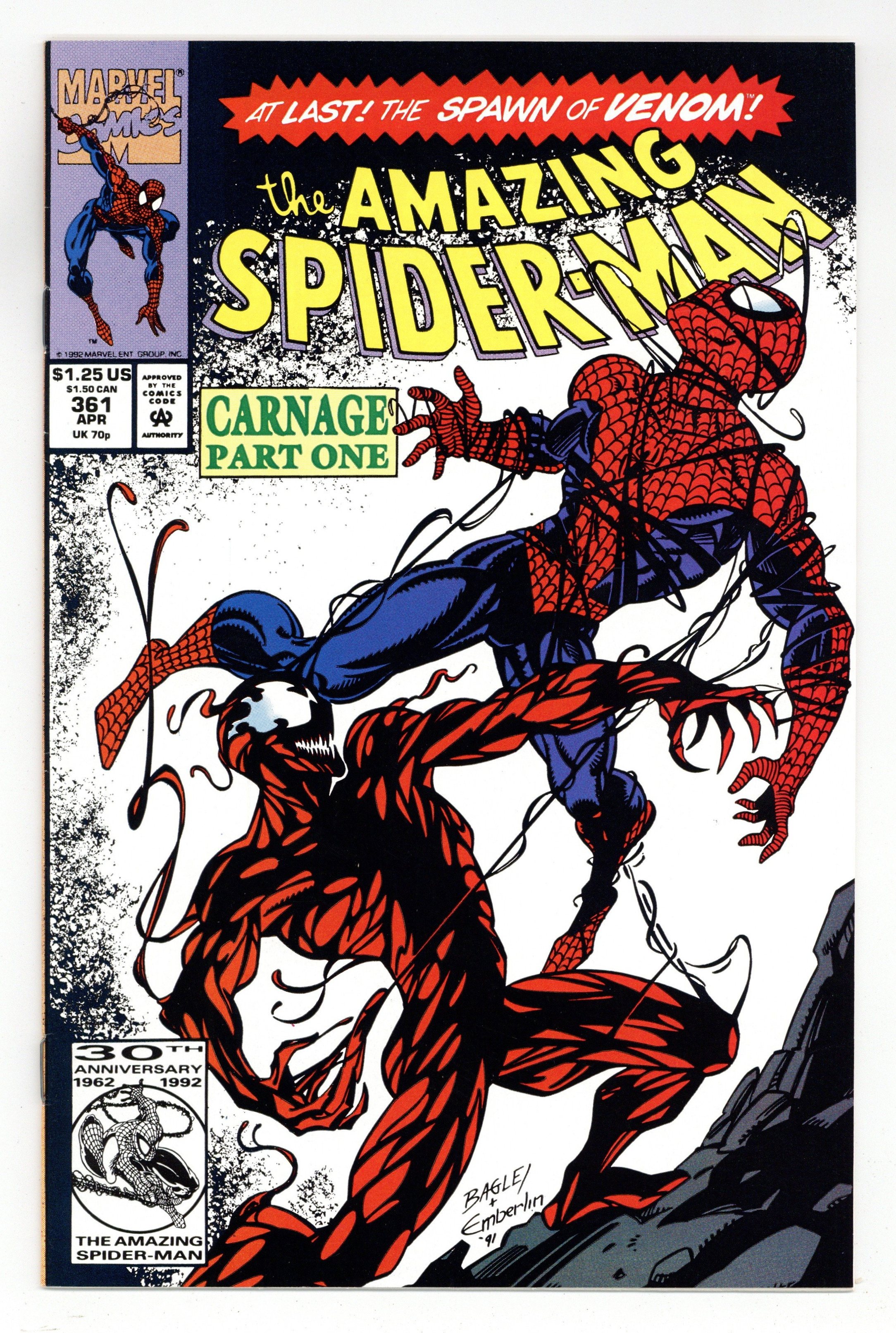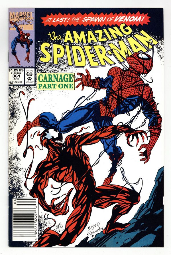 Starts May 4 First Printing. Newsstand Edition. First (full) appearance of Carnage in "Savage Genesis!" Part 1 of 3. Script by David Michelinie. Pencils by Mark Bagley. Inks by Randy Emberlin. Cover by Mark Bagley and Randy Emberlin. Blood runs in the streets as a serial killer roams New York City! And as the web-slinger investigates the murders, he notices a very disturbing similarity to another killer's modus operandi! In a burned-out building in Brooklyn, the spectacular one comes face-to-face with his new homicidal foe...Carnage! Can the wall-crawler end Cletus Kasady's rampage in their very first encounter? Cameo appearances by Aunt May and Mary Jane Watson. Flashback cameo by Venom. (Note: This three-part story was reprinted in 2011 in the trade paperback: Spider-Man -- The Vengeance of Venom.) 36 pages, full color. $1.25 cover price. NOTE: Most of these were distributed with slight printer tears in the bottom edge of the cover. Cover price $1.25.