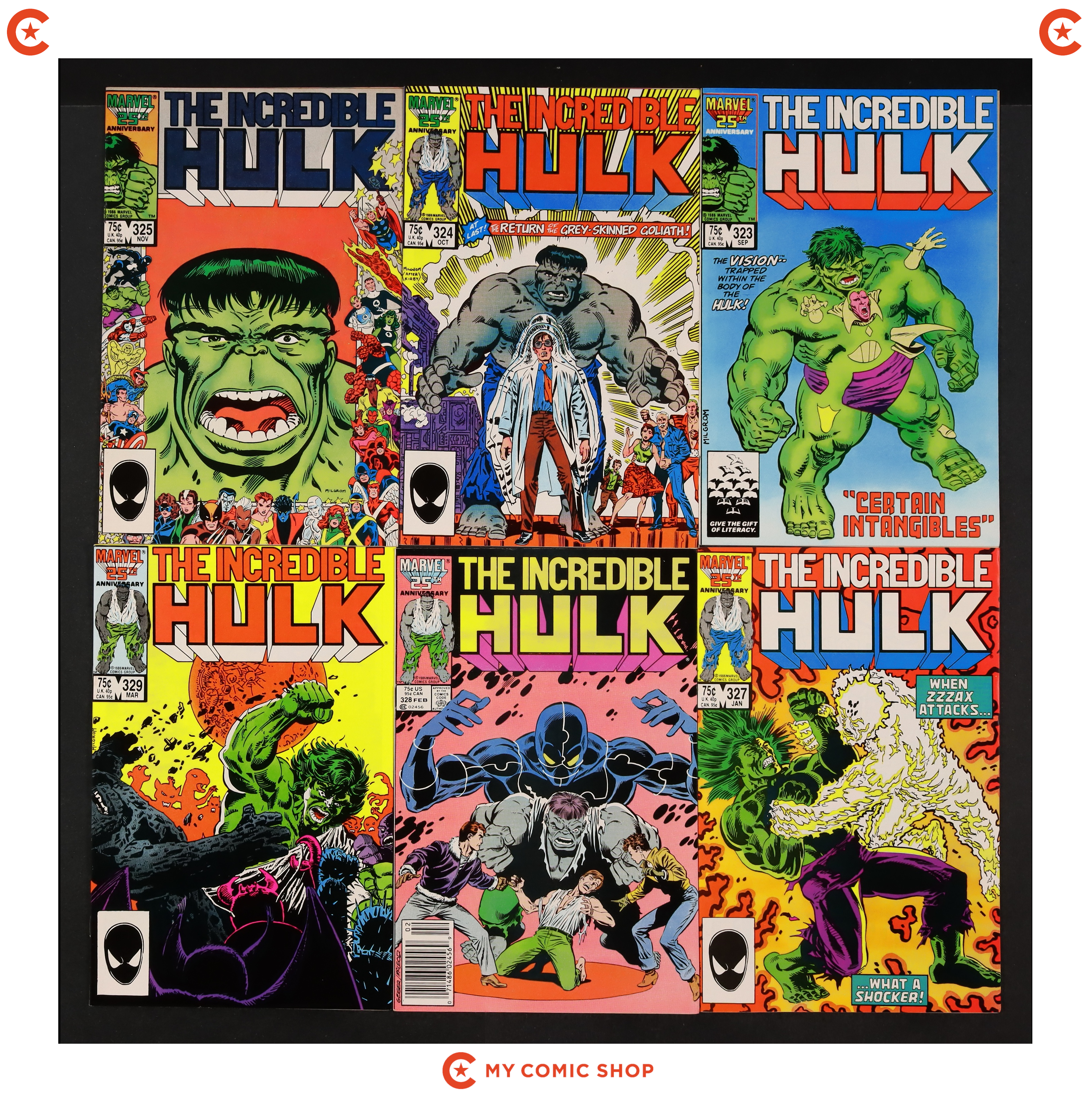 Issues 323-325, 327, 328N, 329, 332MJ, 333, and 334 of Incredible Hulk (1962 Marvel 1st Series). Most will grade in the VF to FN range.