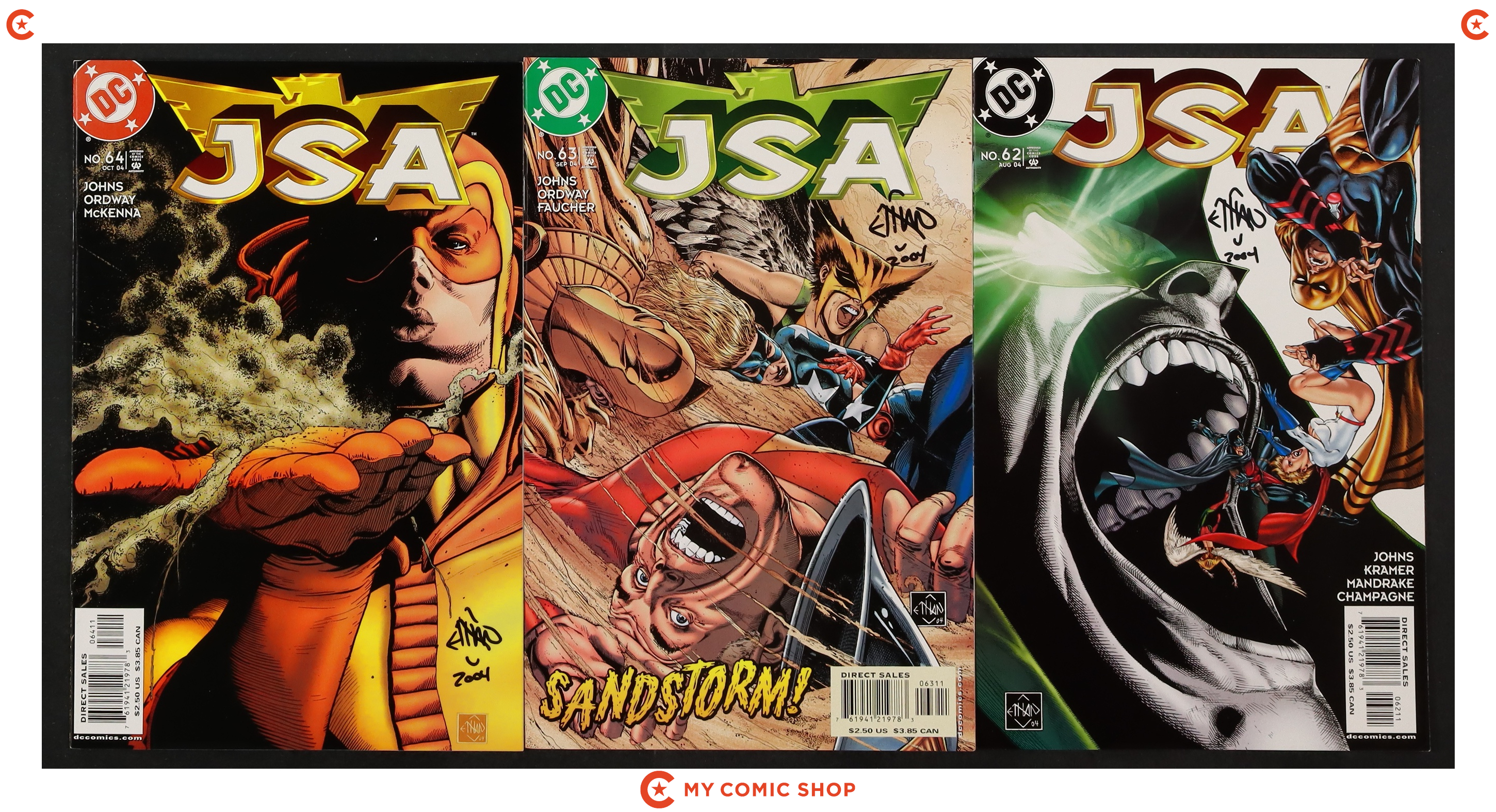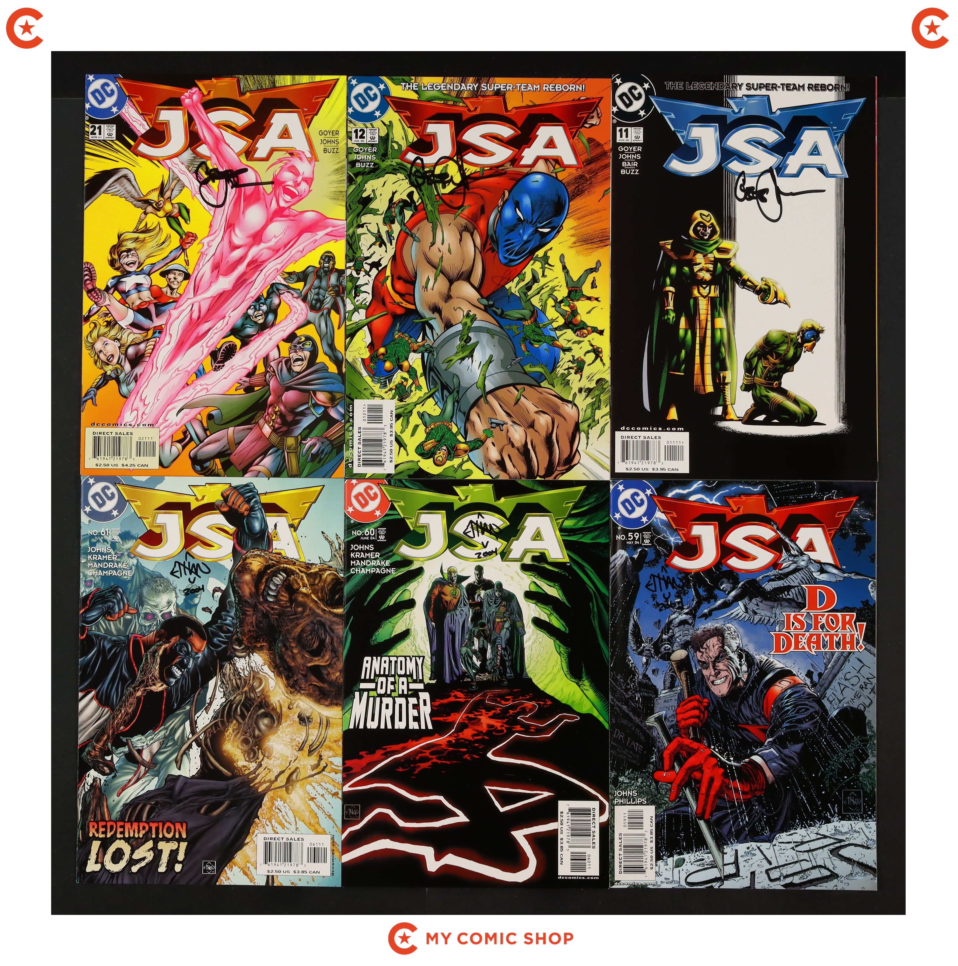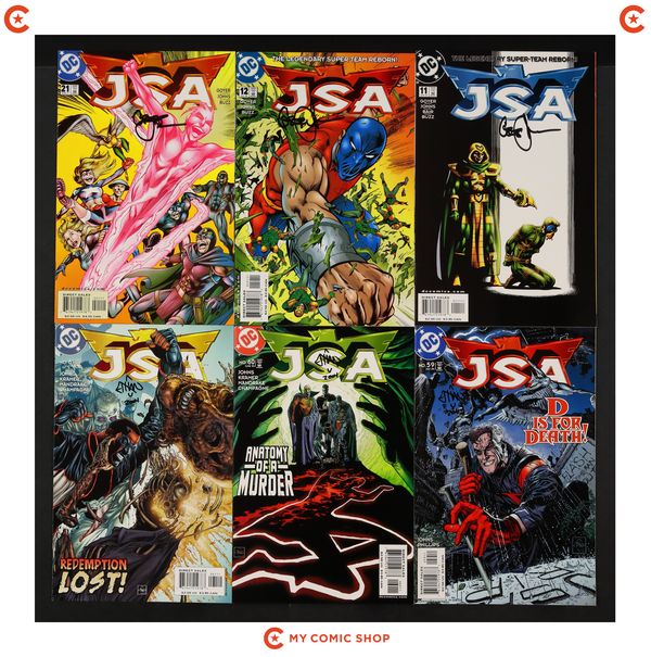 Issues 11, 12, 21, 59, 60, 61, 62, 63, 64, of JSA (1999). Issues 11, 12, 21 signed by Geoff Johns, and issues 59-64 signed by Ethan Van Sciver. No autograph certification is included. Most will grade in the VF to NM range.