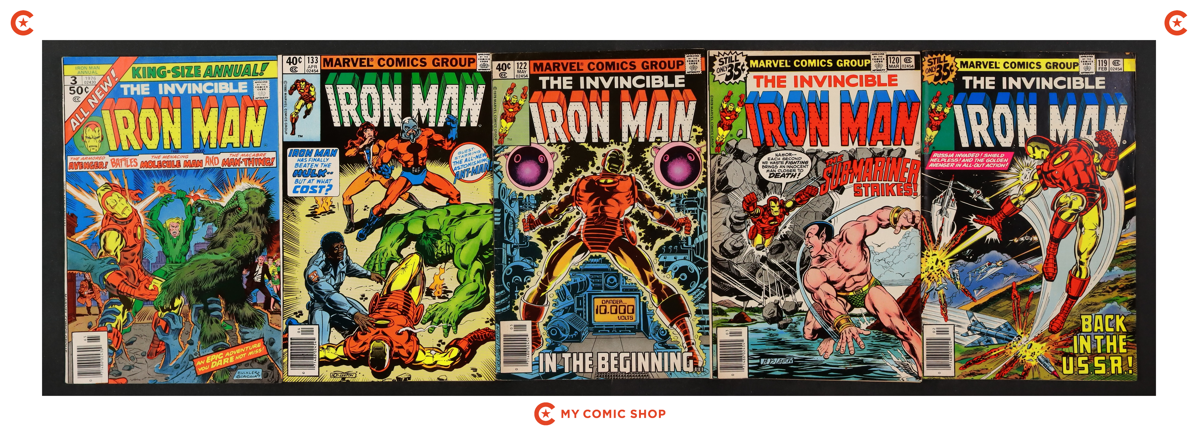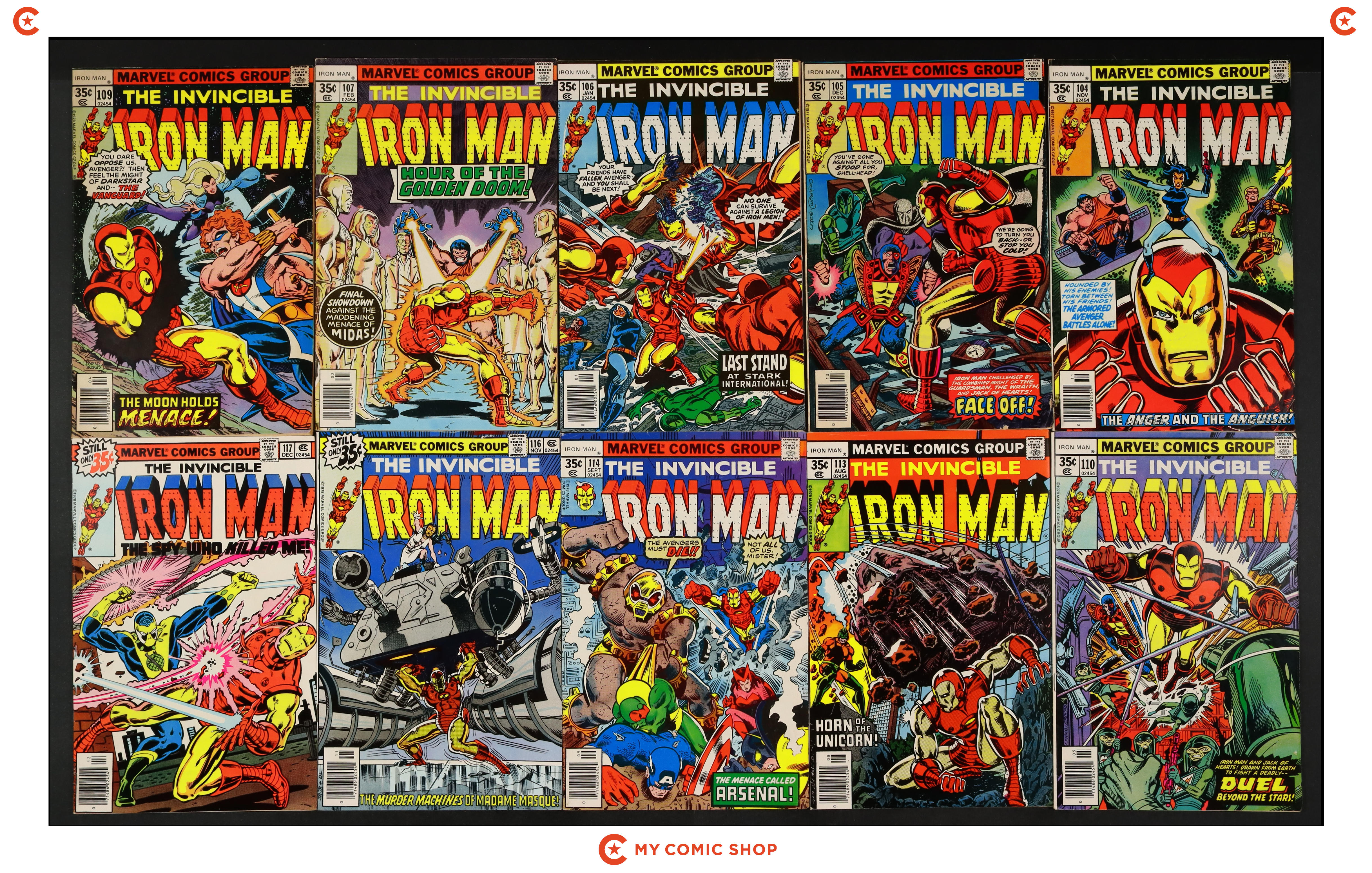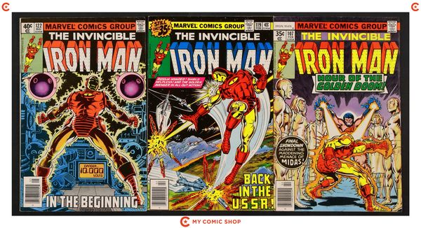 Issues 104-107, 109, 110, 113, 114, 116, 117, 119, 120, 122, and 133 of Iron Man (1968 1st Series); and 3 of Iron Man (1968 1st Series) Annual. Most will grade in the FN to VG range.