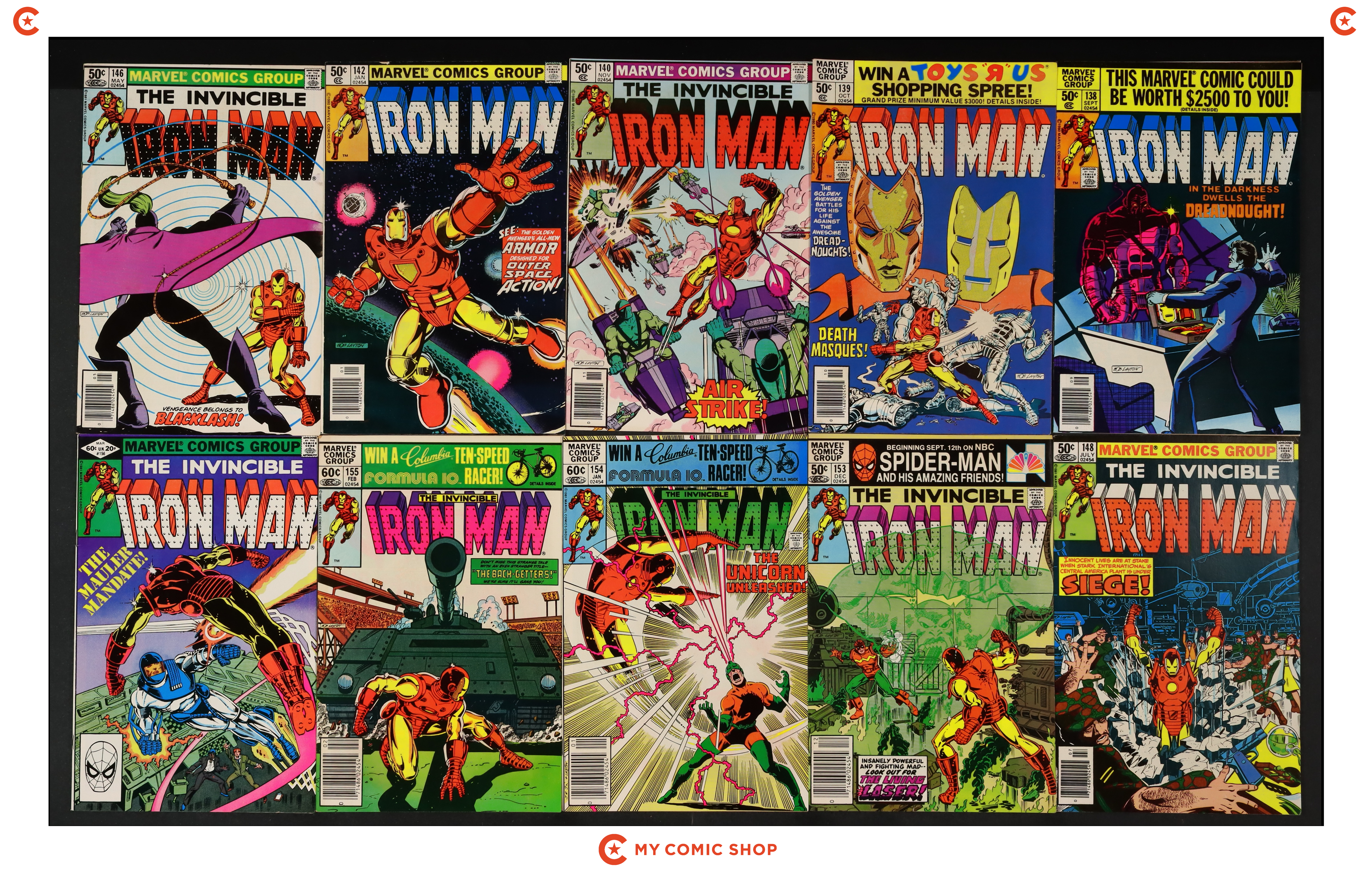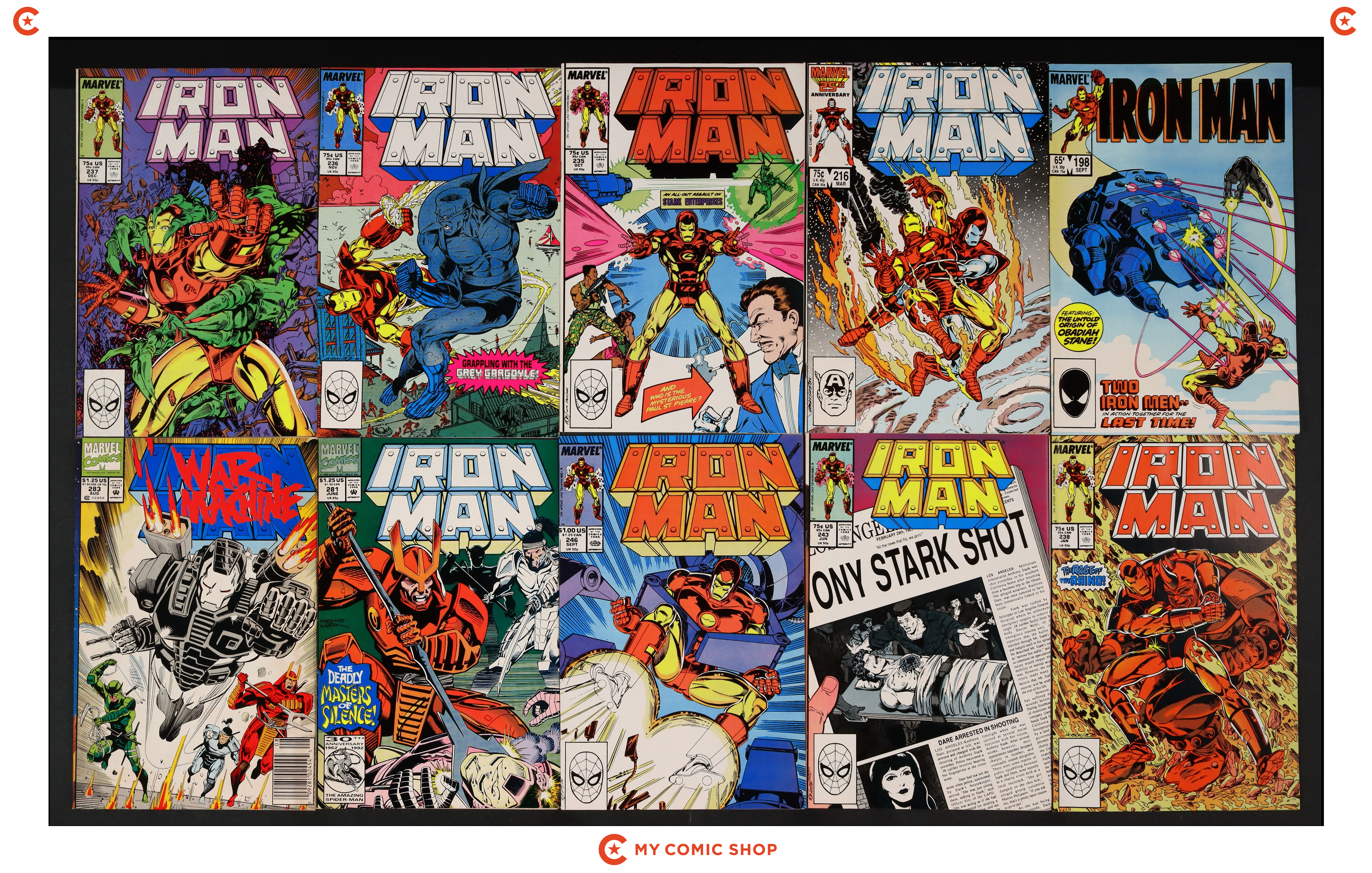 Issues 224 and 226-234 of Iron Man (1968 1st Series). Most will grade in the FN/VF to FN range.