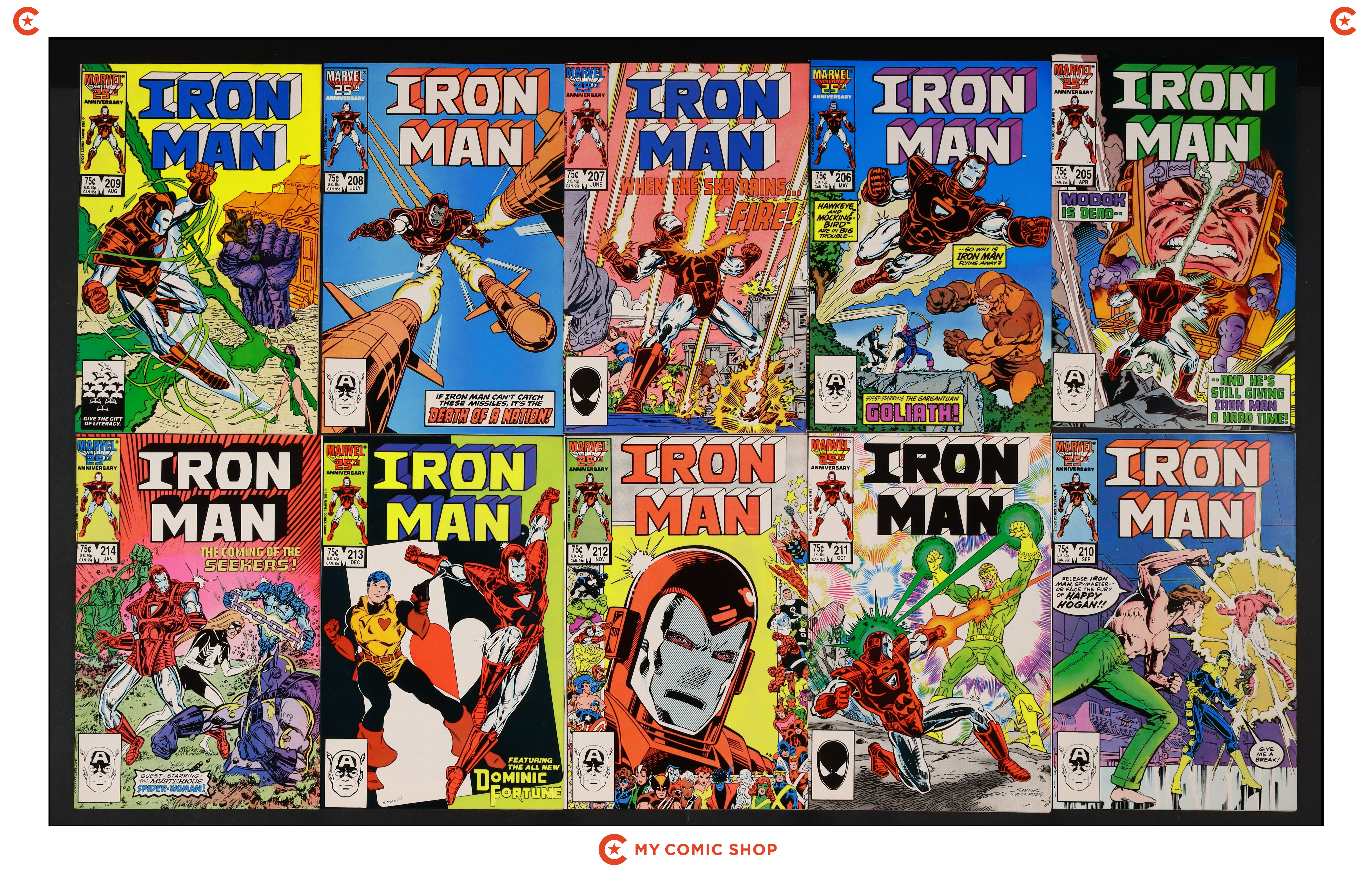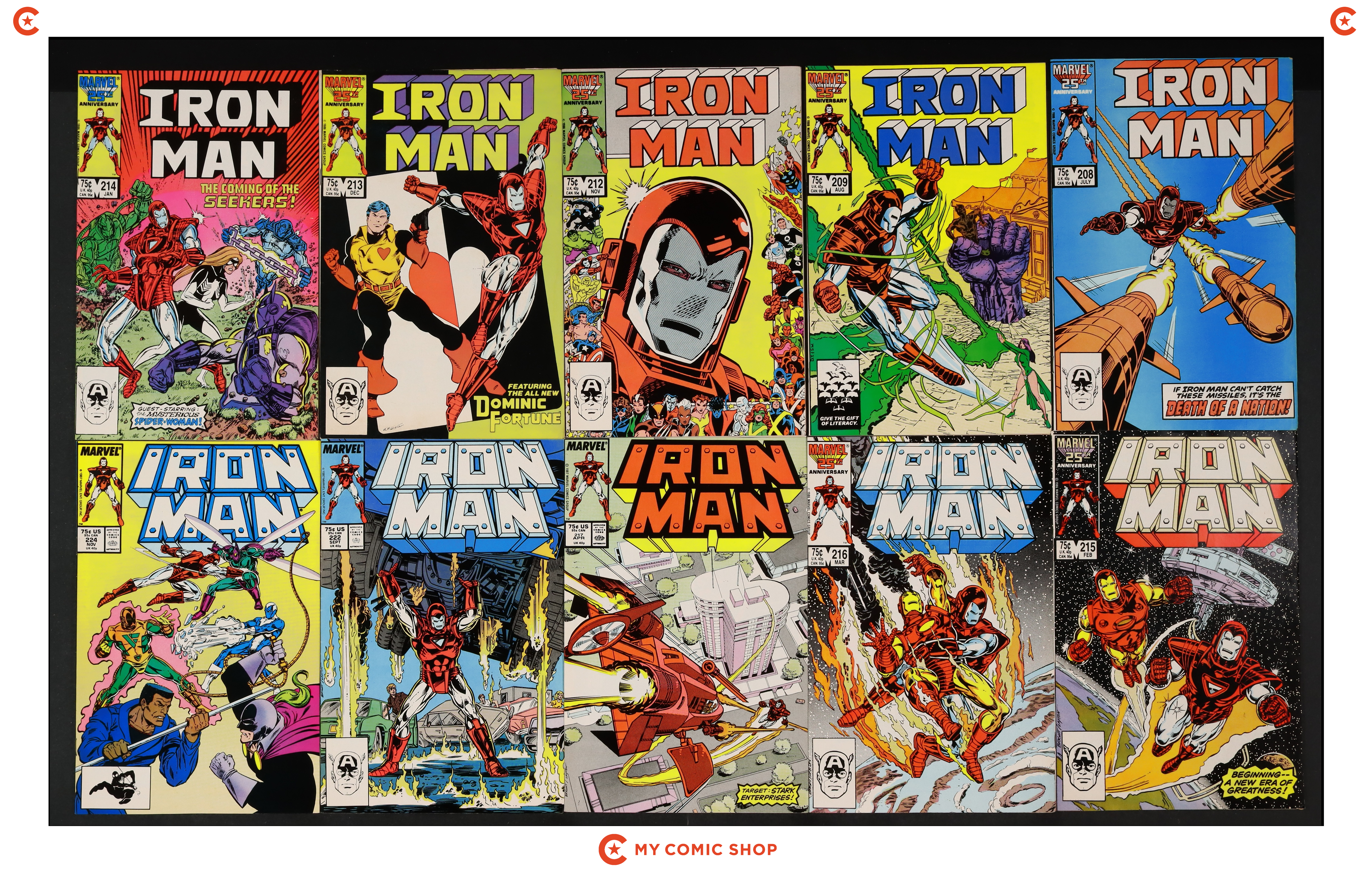 Issues 208, 209, 212D, 213-217, 222, and 224 of Iron Man (1968 1st Series). Most will grade in the FN/VF to FN range.