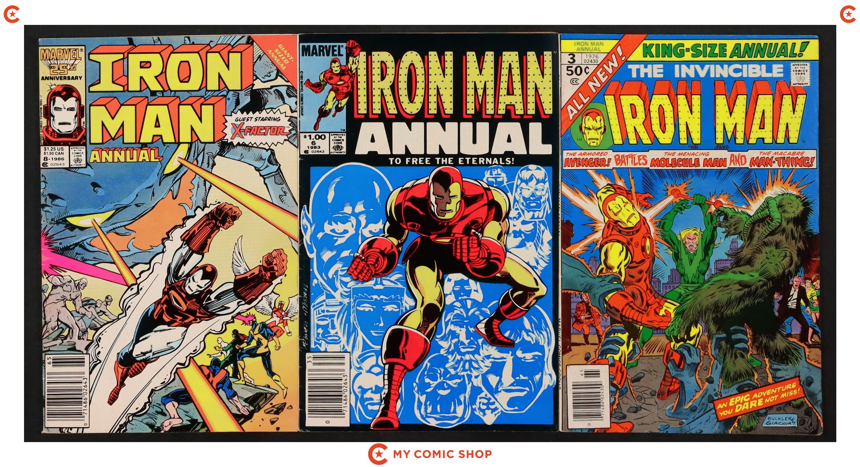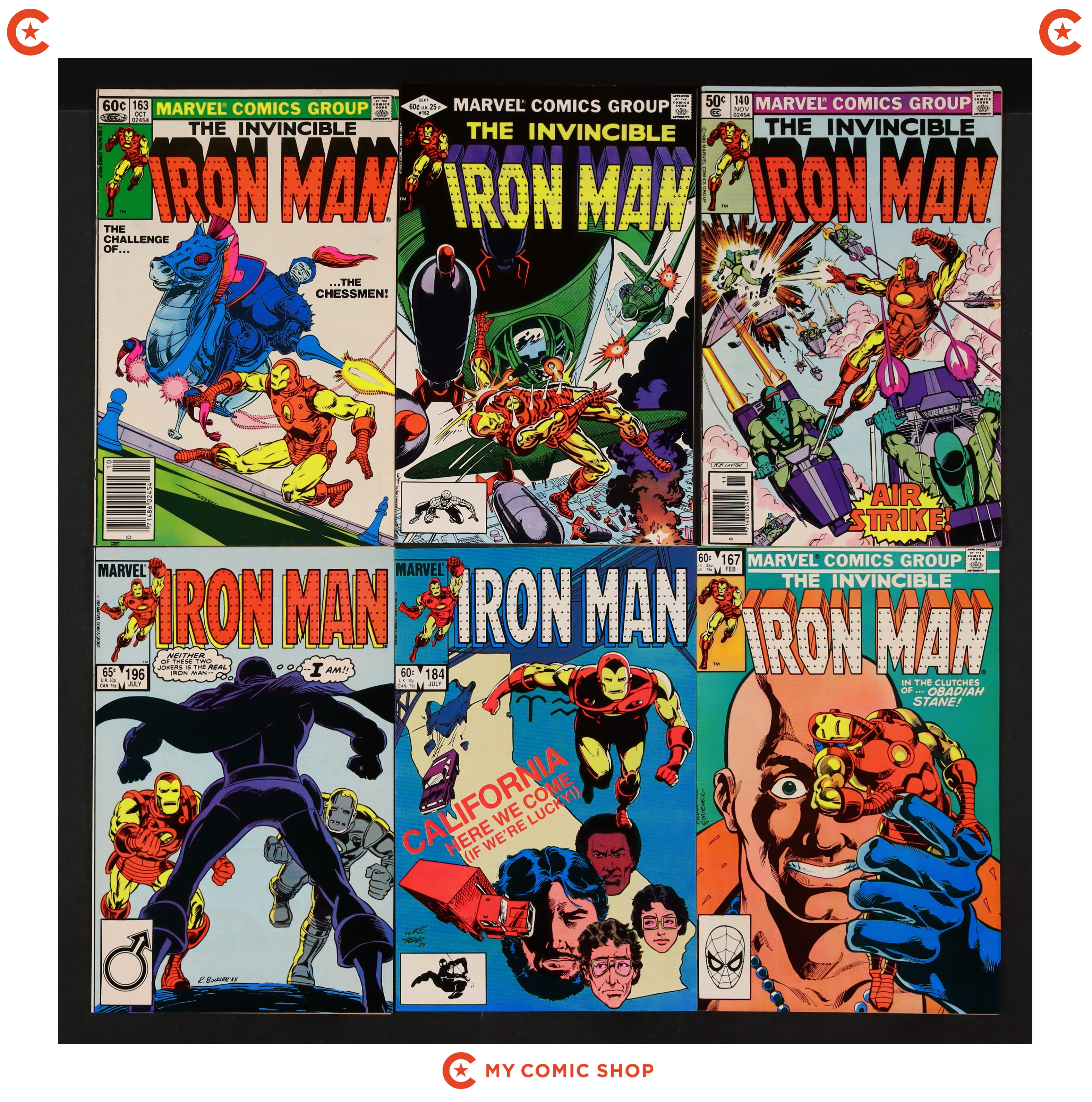 Issues 140, 162, 163, 167, 184, and 196 of Iron Man (1968 1st Series); and 3, 6, and 8 of Iron Man (1968 1st Series) Annual. Most will grade in the VF to FN range with a few grading VG.