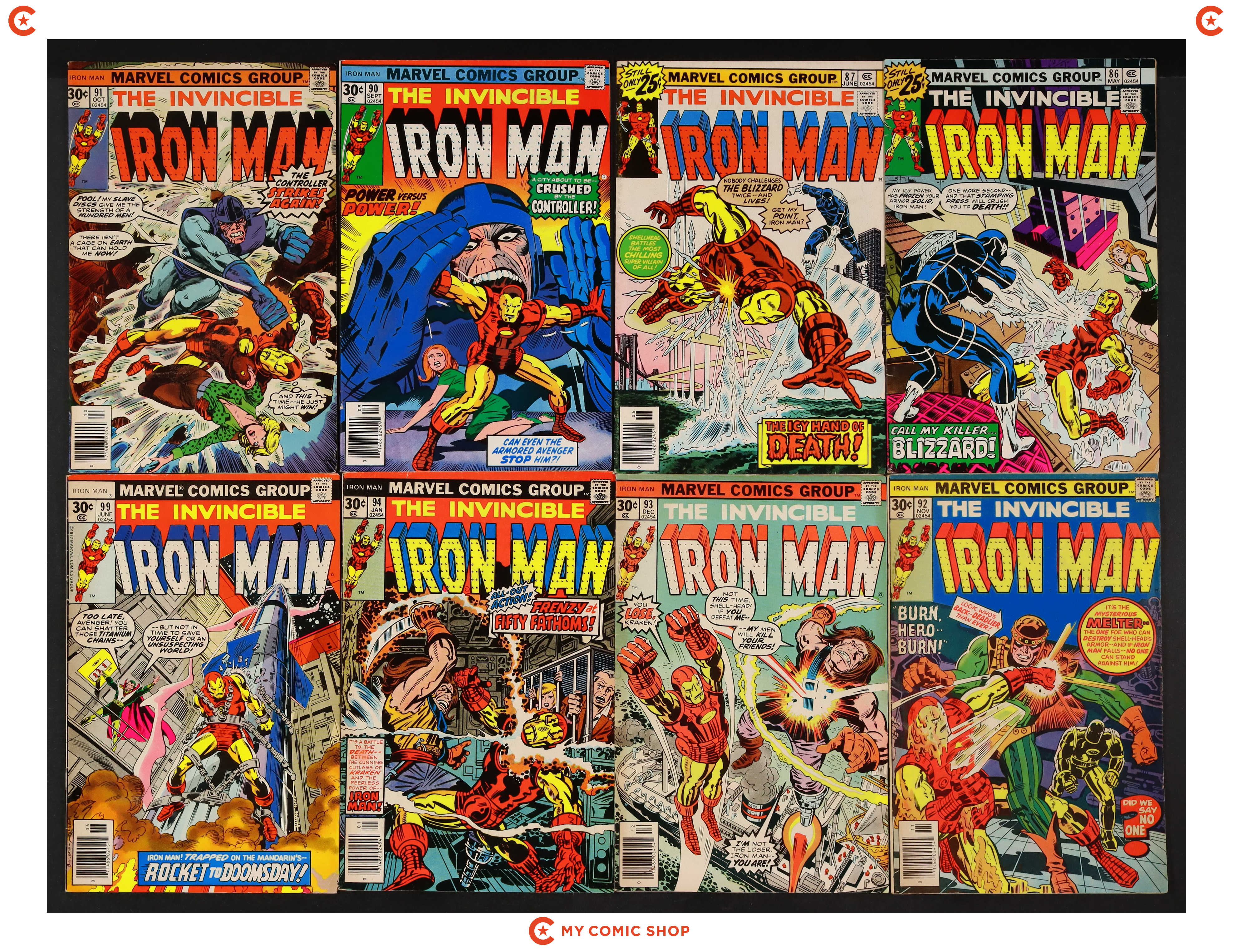 Issues 86, 87, 90-94, 99, 107, 119, and 122 of Iron Man (1968 1st Series). Most will grade in the FN to VG range.