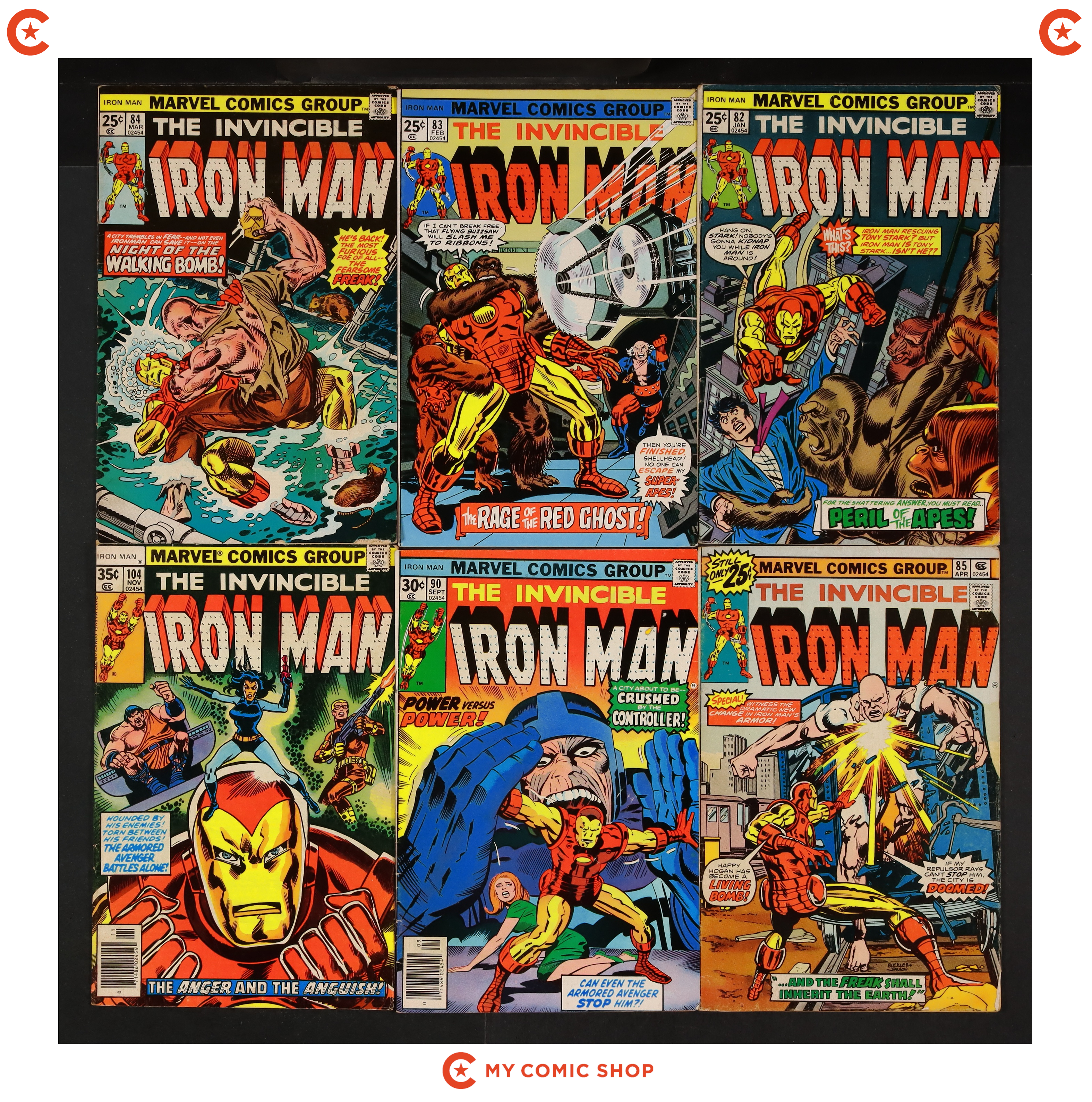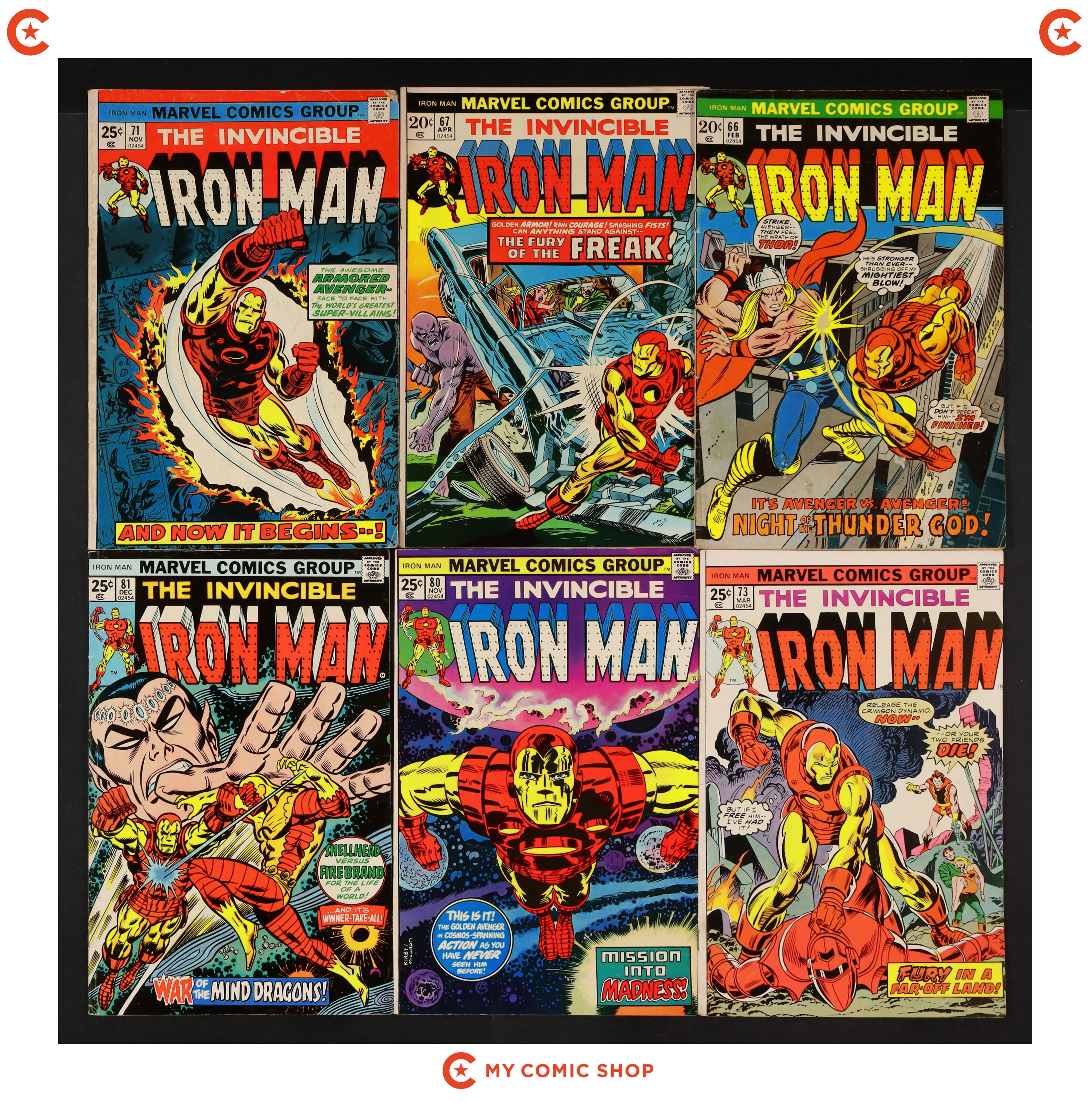 Issues 66, 67, 71, 73, 80-85, 90, and 104 of Iron Man (1968 1st Series). Most will grade in the VG range with a couple grading closer to GD.