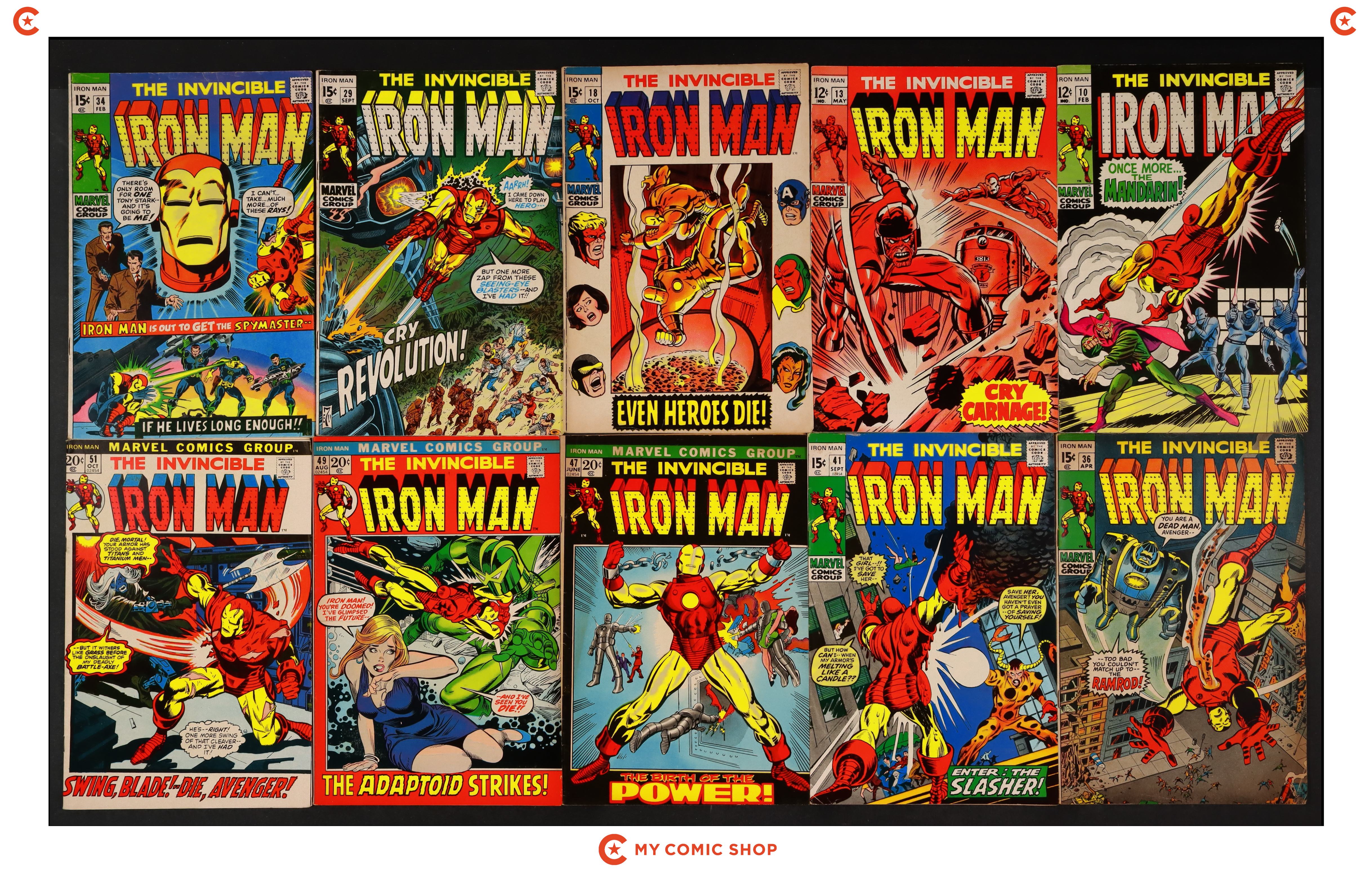 Issues 10, 13, 18, 29, 34, 36, 41, 47, 49, and 51 of Iron Man (1968 1st Series). Most will grade in the VG range.