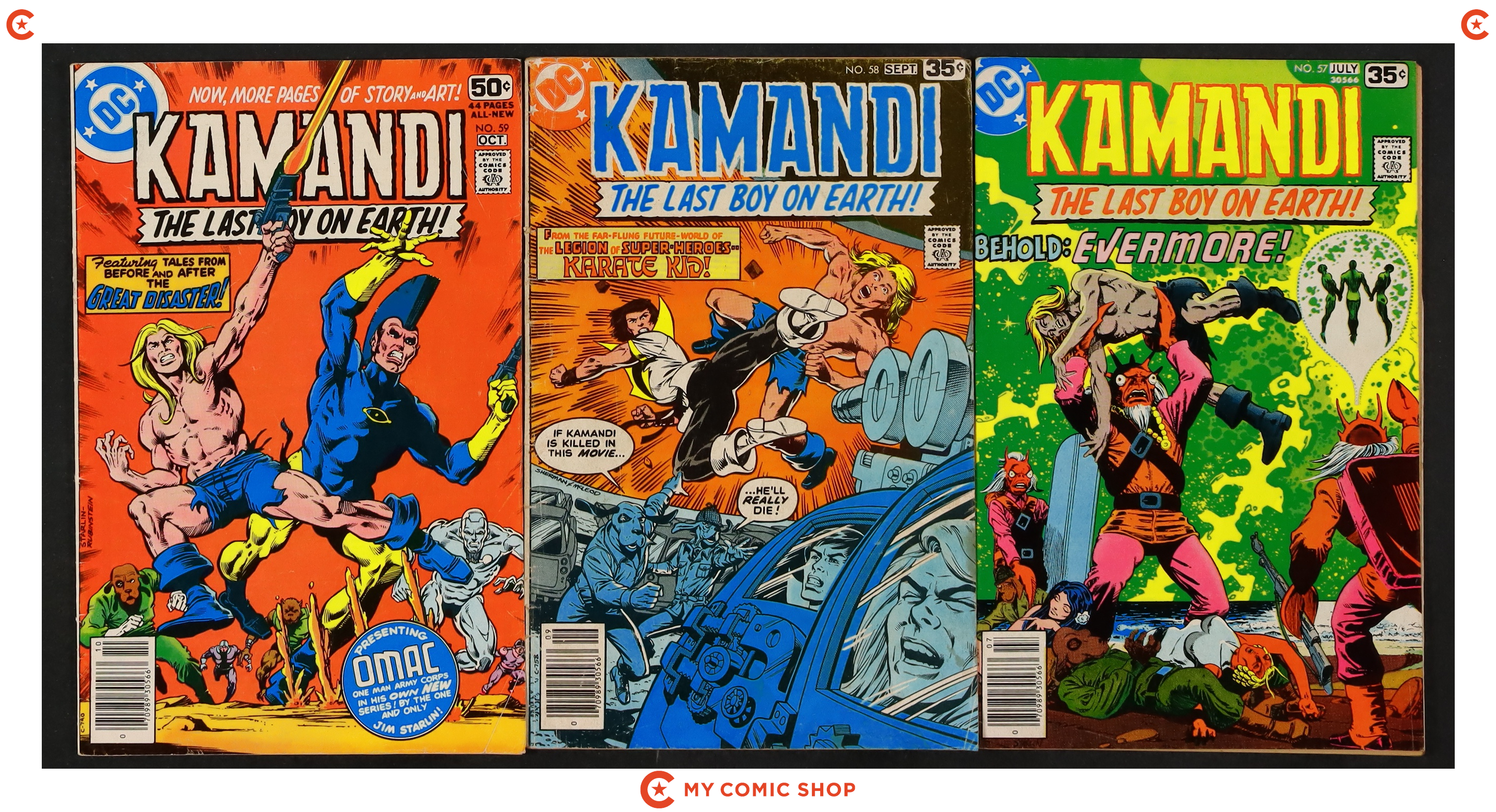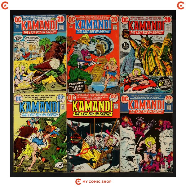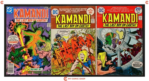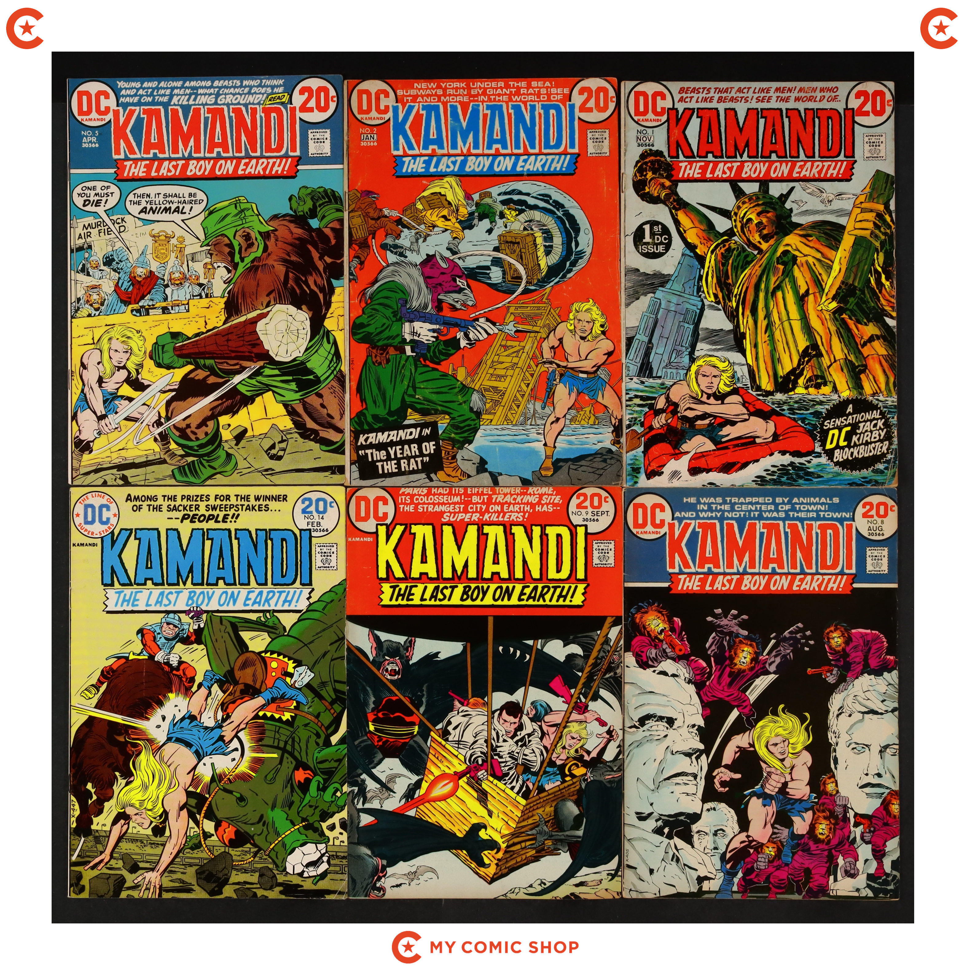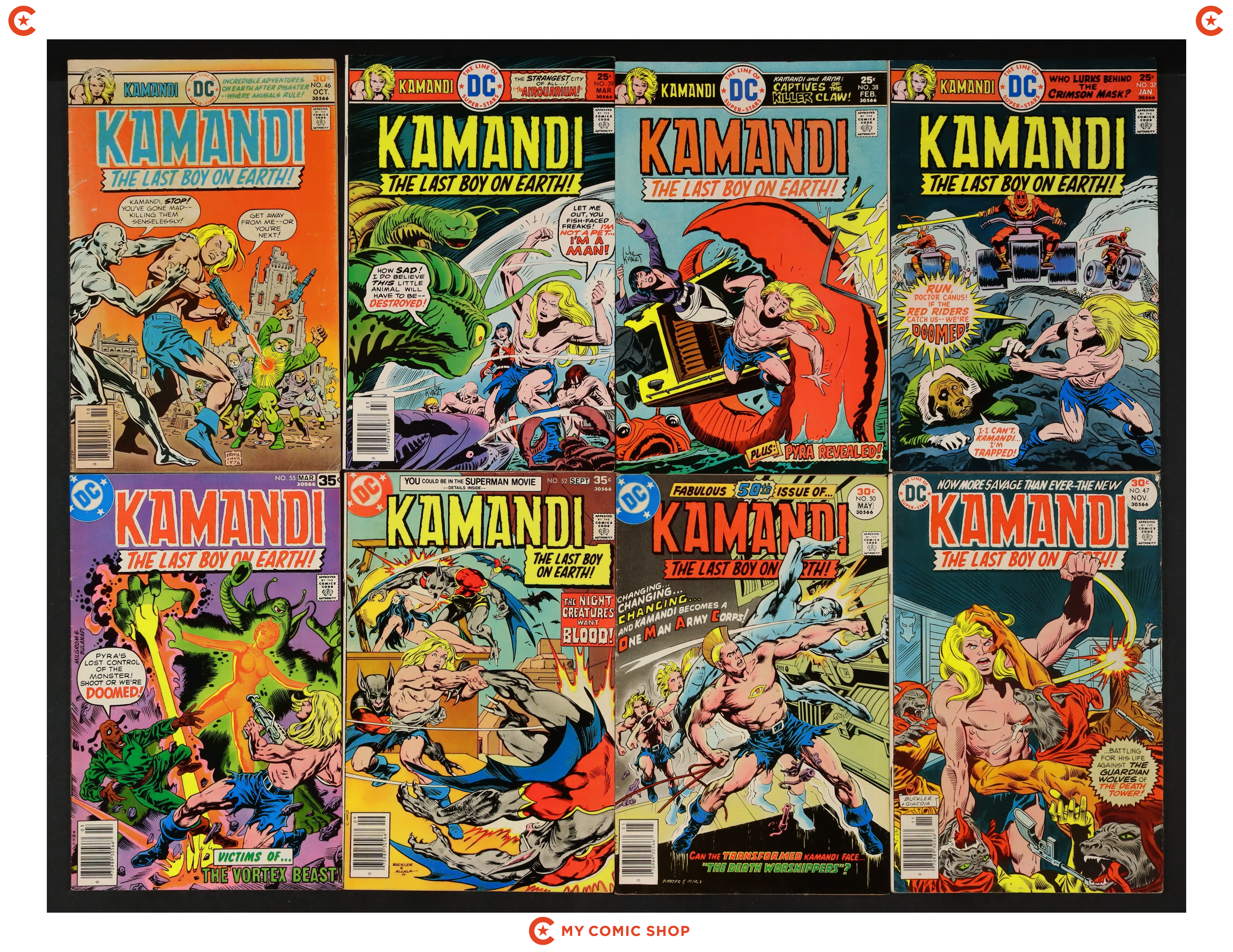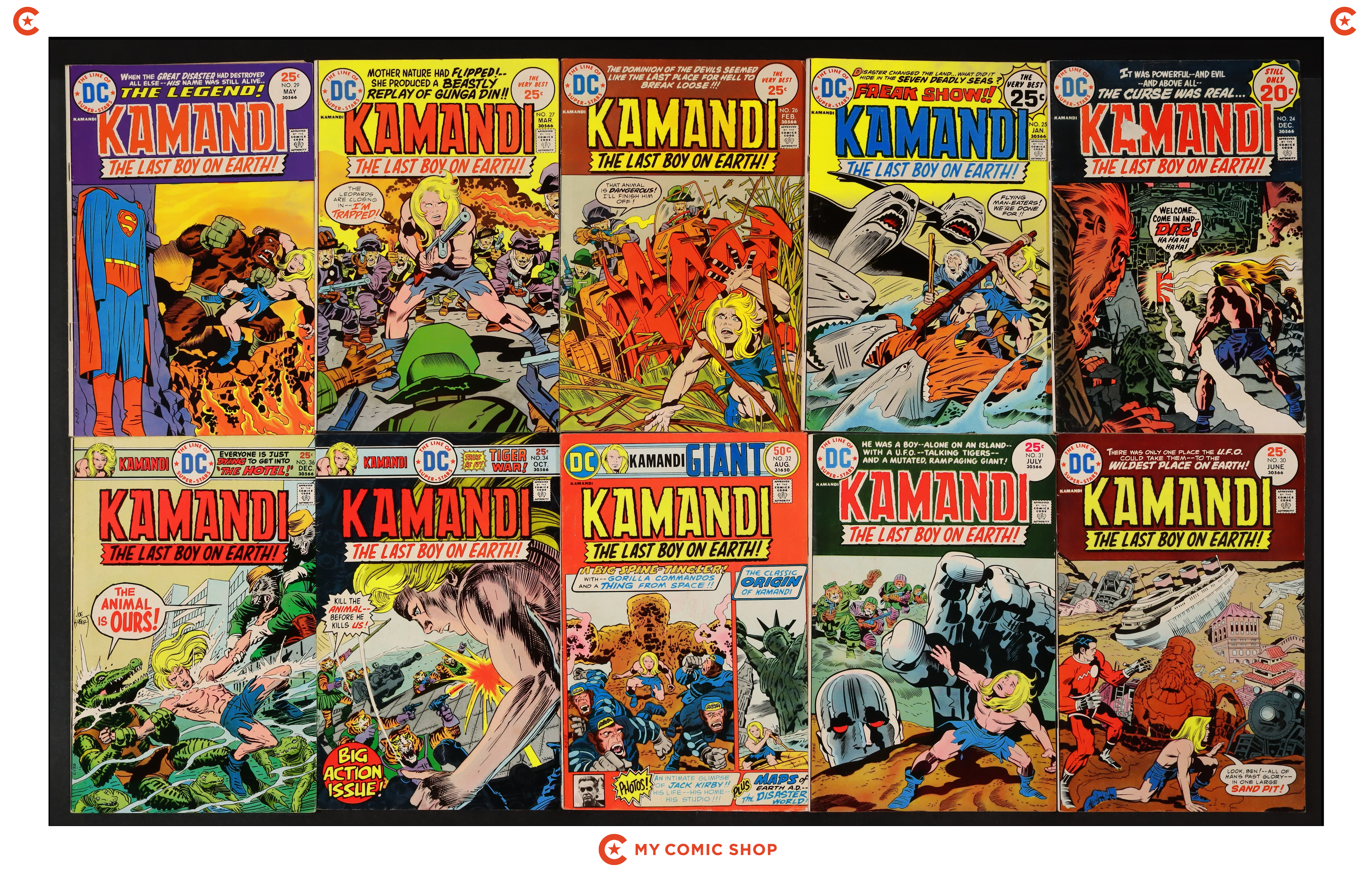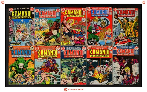 Issues 24, 25MJ, 26, 27, 29, 30MJ, 31, 32, 34, and 36MJ of Kamandi (1972 DC). Most will grade in the FN to VG range.