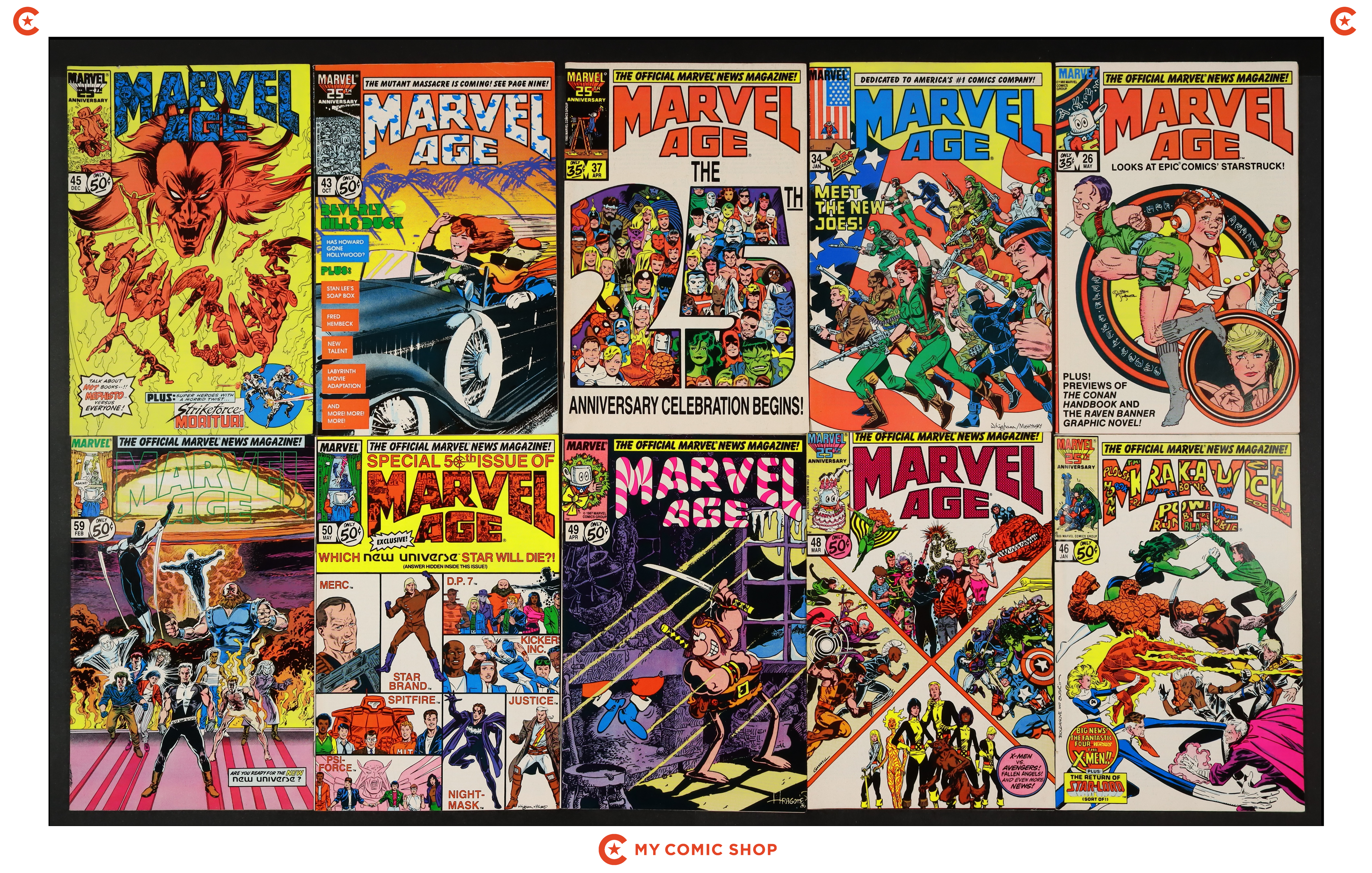 Issues 26, 34, 37, 43, 45, 46, 48-50, and 59 of Marvel Age (1983 Marvel). Most will grade in the FN range with a couple grading VG.