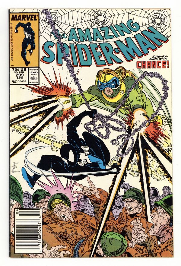 Starts Jan 3 Direct Edition. "Survival of the Hittist!" Part 2 of 2. Script by David Michelinie. Pencils by Todd McFarlane. Inks by Bob McLeod. Cover by Todd McFarlane. After their waterfront arms theft goes awry, the Life Foundation turns the tables on Chance! The mysterious survivalist group abducts the mercenary and takes him to their secret headquarters in northern New Jersey! But thanks to a well-placed spider tracer, the web-slinger infiltrates the foundation's secluded colony the next day...and rescues Chance! So now the adversaries of 24 hours ago suddenly become allies to avoid death...courtesy of the Life Foundation! First appearance (and cameo on the last page) by Venom. Cameo appearances by Eddie Murphy, Paul Schaffer, and Joe Robertson. Last 75ยข issue. 36 pages, full color. (Note: Chance returns in Amazing Spider-Man 336.) Cover price $0.75.