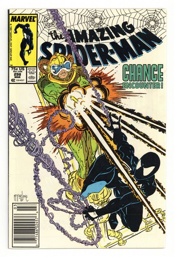 Starts Jan 19 Direct Edition. "Chance Encounter!" Part 1 of 2. Script by David Michelinie. Pencils by Todd McFarlane. Inks by Bob McLeod. Cover by Todd McFarlane. Chance is back in business and working a new job for the Life Foundation! The clandestine organization wants Chance to steal an arms shipment coming into the west side docks! That should be a piece of cake for the high-flying mercenary! However, the Daily Bugle dispatches an undercover photographer to observe the delivery! And beneath the moonlit sky, fireworks explode when Chance and the Amazing Spider-Man throw down on the docks! First appearance (and cameo on the last page) by Eddie Brock (aka Venom). First appearance of Carlton Drake of the Life Foundation. Cameo appearances by Mary Jane Watson, Joy Mercado, and Joe Robertson. (Notes: Chance previously appeared in Web of Spider-Man 15. This issue begins Todd McFarlane's 2-year run as the penciler of the Amazing Spider-Man series.) 36 pages. Cover price $0.75.