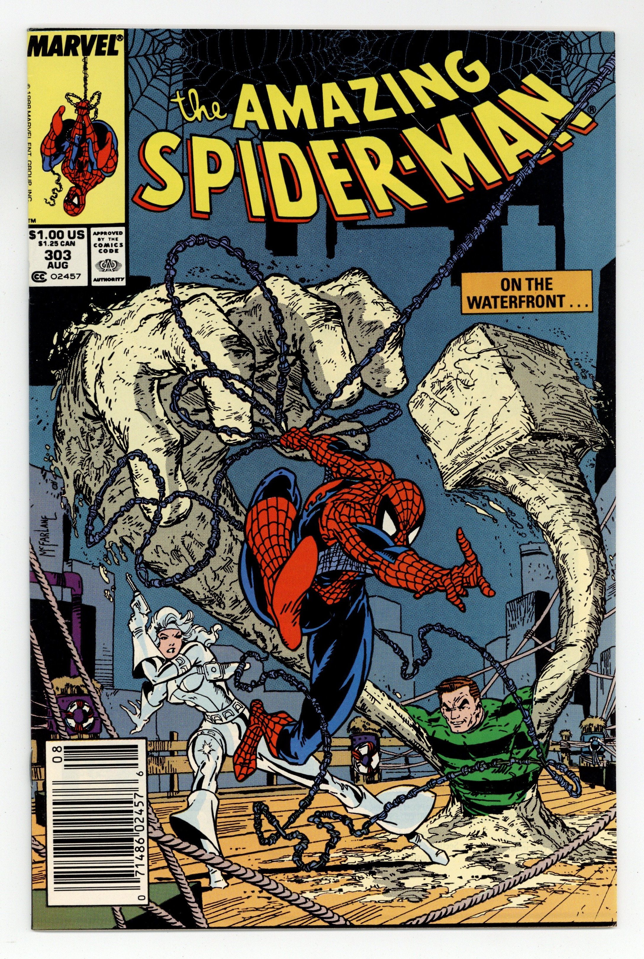 Starts Jan 26 Newsstand Edition. "Dock Savage!" Guest-starring Silver Sable. Script by David Michelinie. Art by Todd McFarlane. Cover by Todd McFarlane. While trying to make up his mind about the research company's job offer in Kansas, the wondrous wall-crawler receives another employment offer! However, this one is from Silver Sable and requires brawn not brains! The Symkarian mercenary wants Spider-Man to team up with the Sandman to take down a neo-nazi and his private army! The web-slinger quickly accepts sable's offer and swings into action! As for the other offer, your friendly neighborhood Spider-Man has to talk to his wife first! Cameo appearances by Mary Jane Watson and J. Jonah Jameson. (Notes: Beginning with this issue, Todd McFarlane produces small drawings in the UPC box on the front cover. These sketches only appear on the cover of the direct sales issues. The newsstand editions have the regular bar code.) 36 pgs. Cover price $1.00.