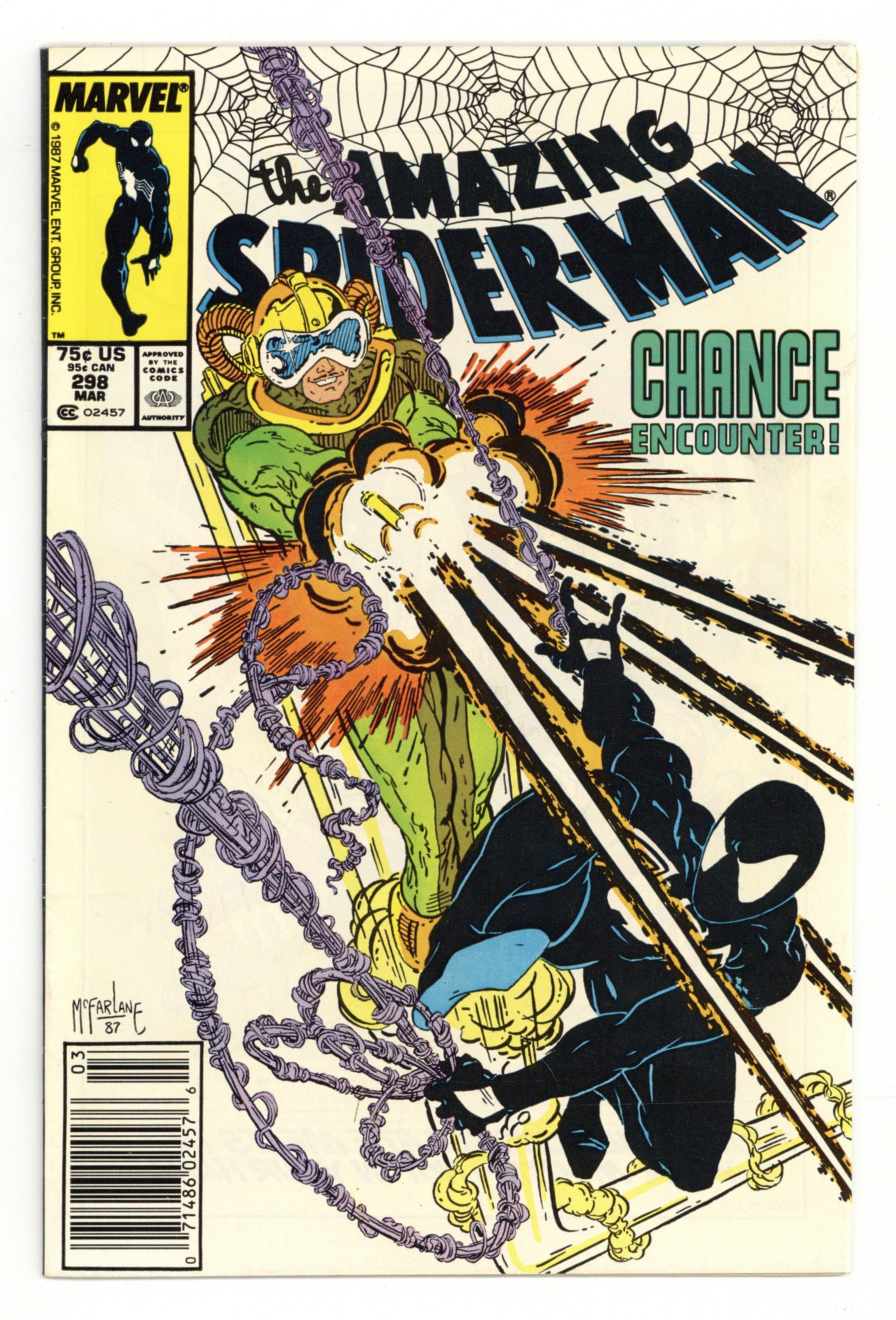 Starts Jan 26 Direct Edition. "Chance Encounter!" Part 1 of 2. Script by David Michelinie. Pencils by Todd McFarlane. Inks by Bob McLeod. Cover by Todd McFarlane. Chance is back in business and working a new job for the Life Foundation! The clandestine organization wants Chance to steal an arms shipment coming into the west side docks! That should be a piece of cake for the high-flying mercenary! However, the Daily Bugle dispatches an undercover photographer to observe the delivery! And beneath the moonlit sky, fireworks explode when Chance and the Amazing Spider-Man throw down on the docks! First appearance (and cameo on the last page) by Eddie Brock (aka Venom). First appearance of Carlton Drake of the Life Foundation. Cameo appearances by Mary Jane Watson, Joy Mercado, and Joe Robertson. (Notes: Chance previously appeared in Web of Spider-Man 15. This issue begins Todd McFarlane's 2-year run as the penciler of the Amazing Spider-Man series.) 36 pages. Cover price $0.75.